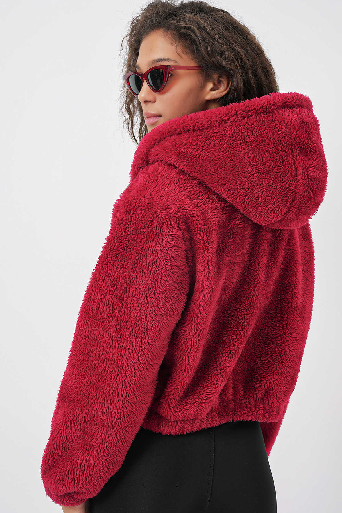 5193 Kapüşonlu Peluş Crop Ceket - Bordo