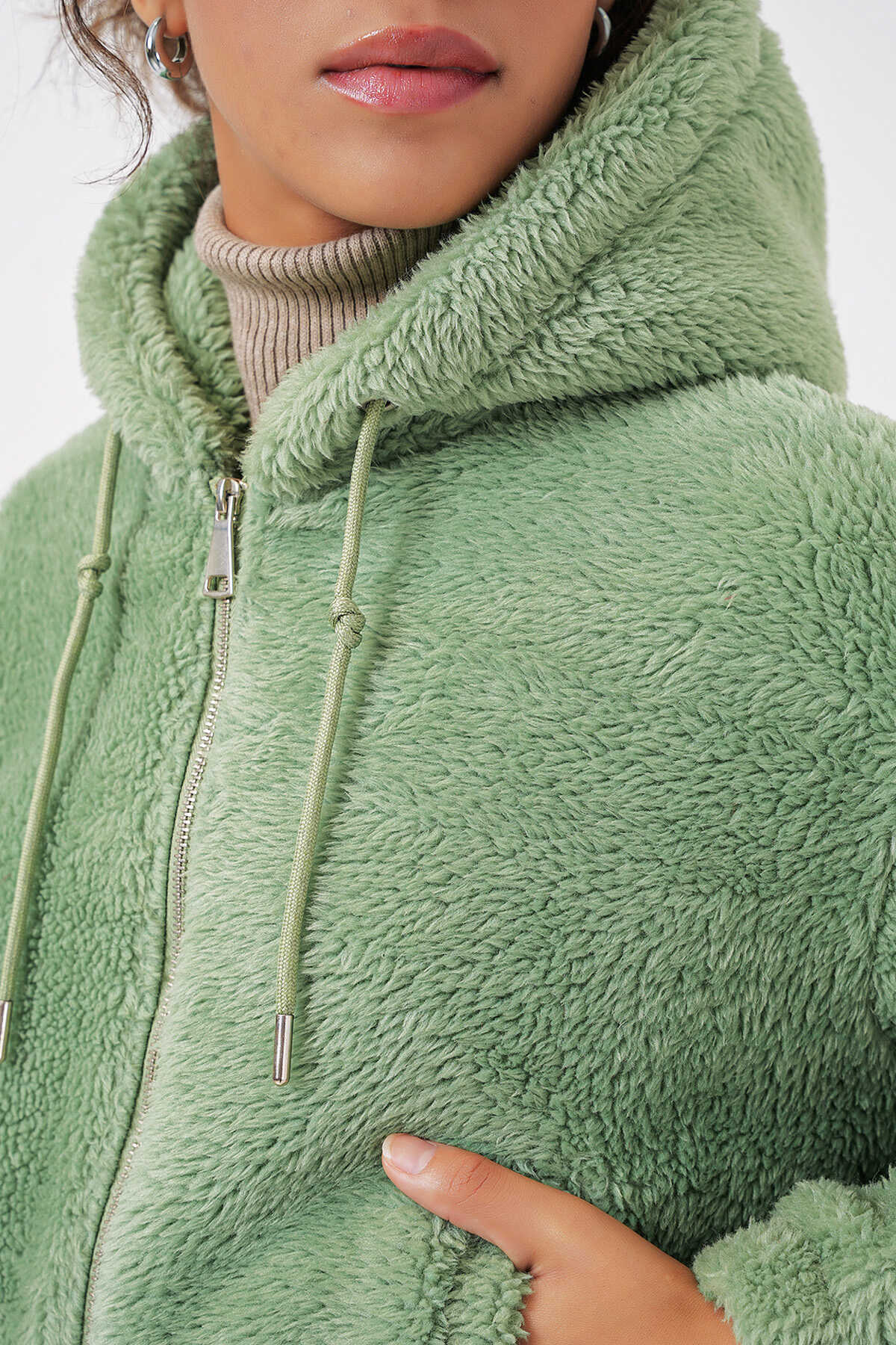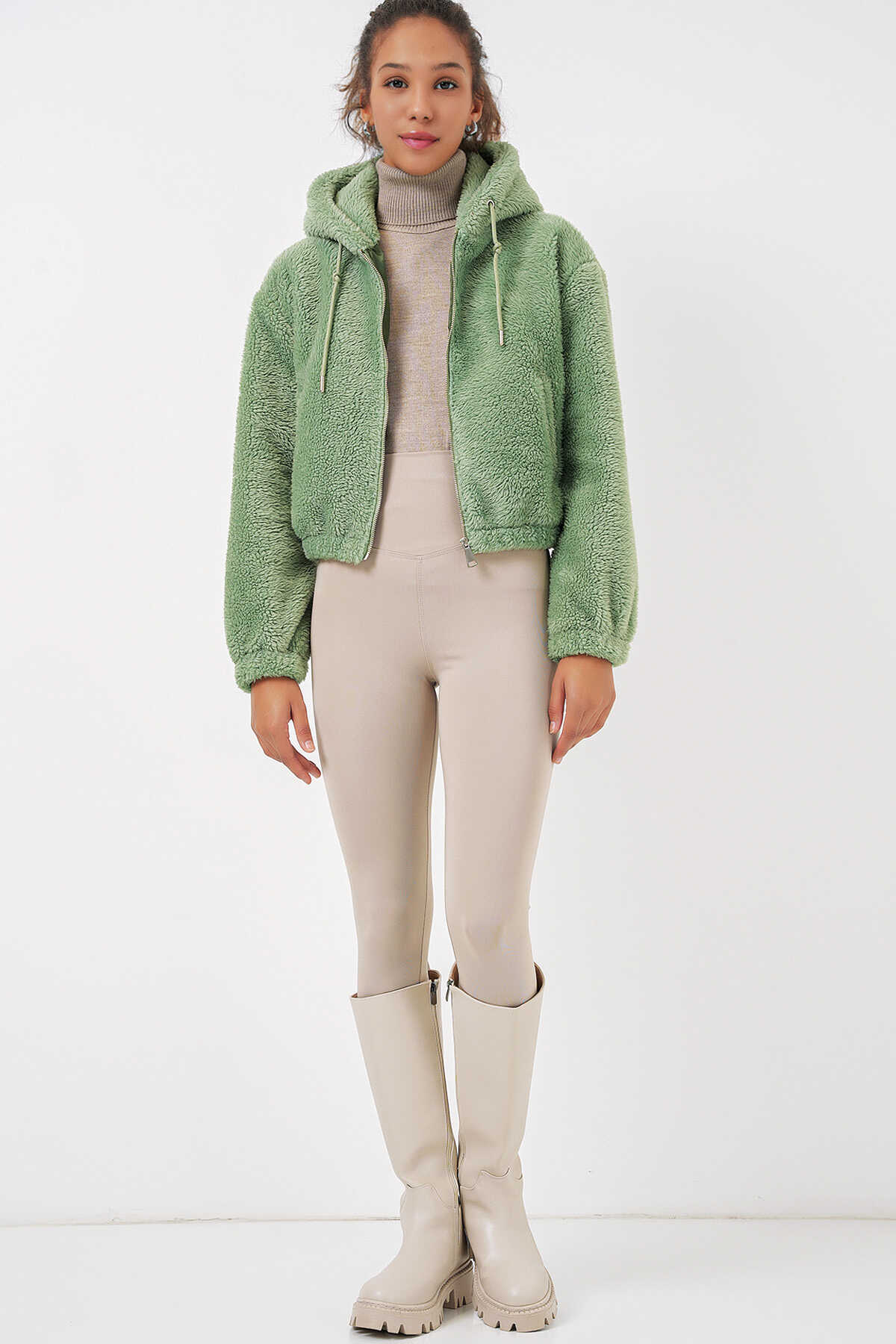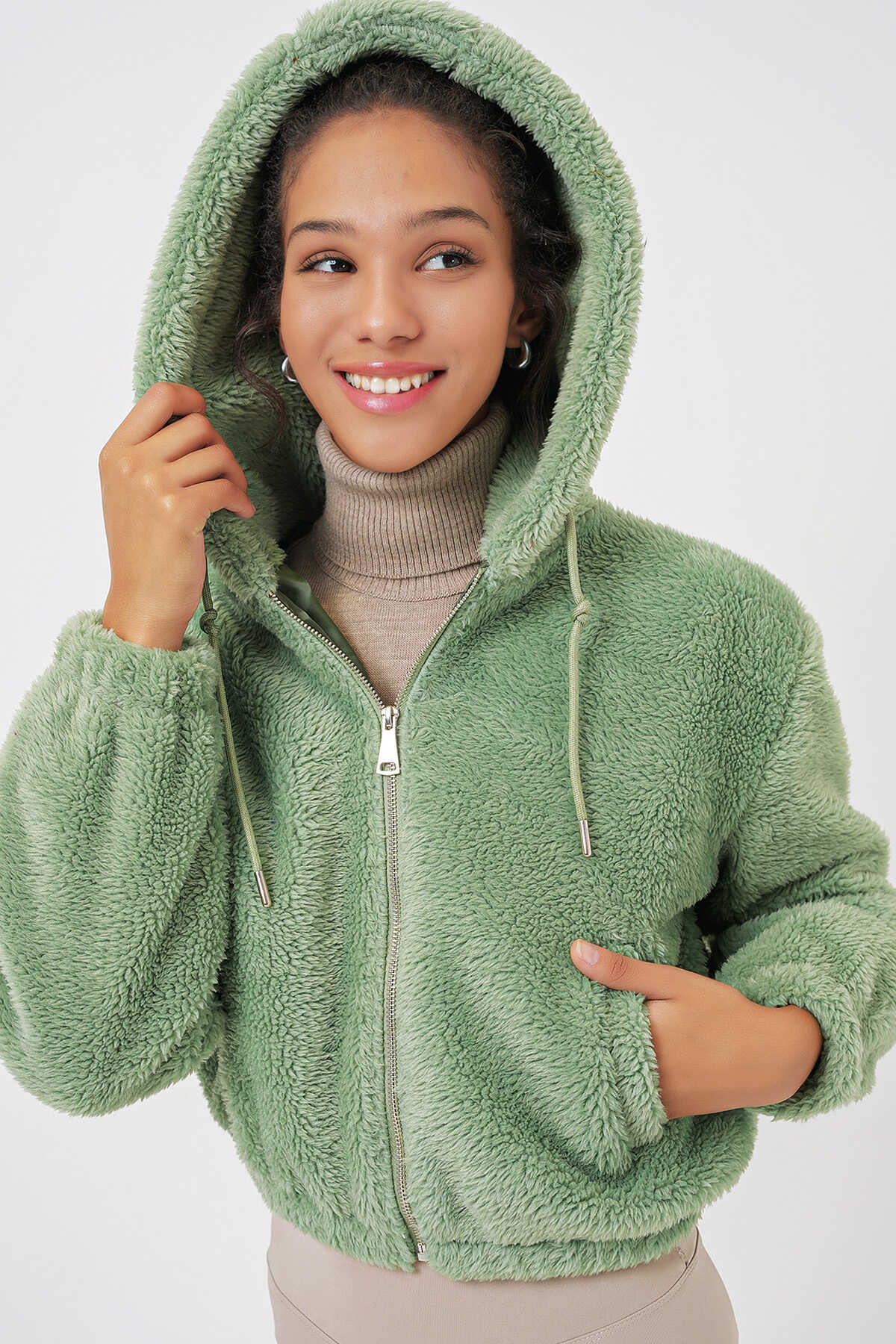 5193 Kapüşonlu Peluş Crop Ceket - E.Yeşil - Kombin