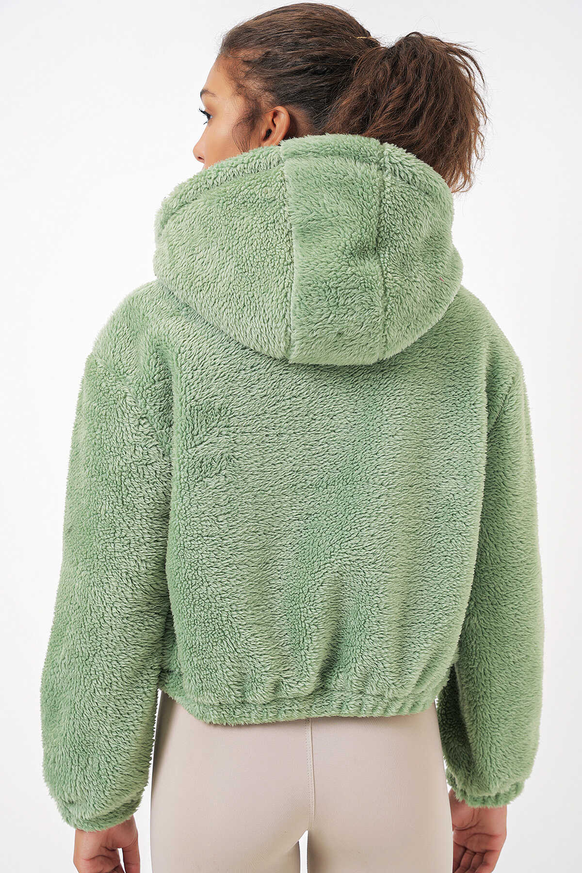 5193 Kapüşonlu Peluş Crop Ceket - E.Yeşil