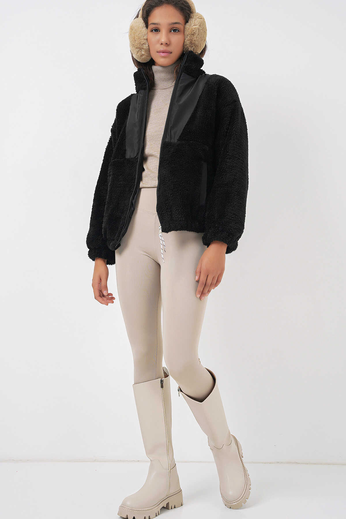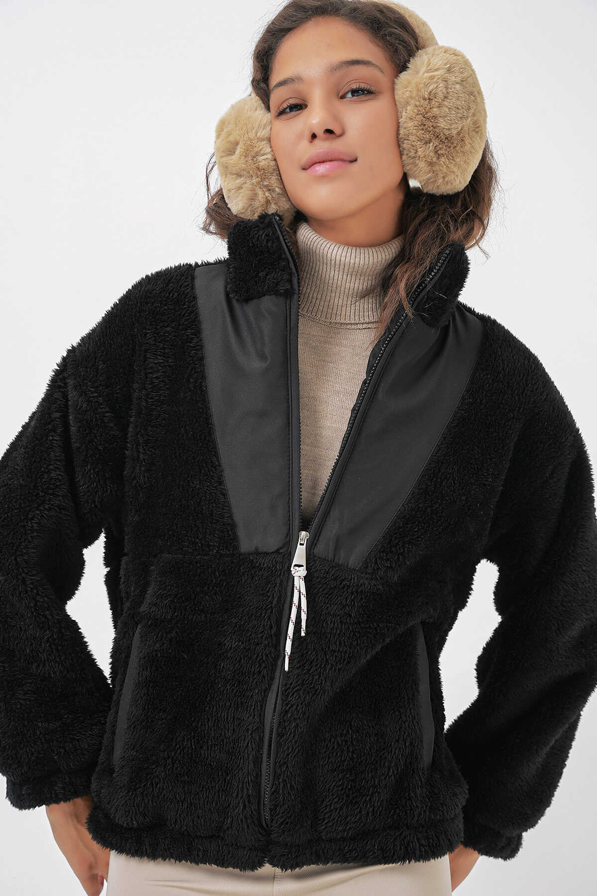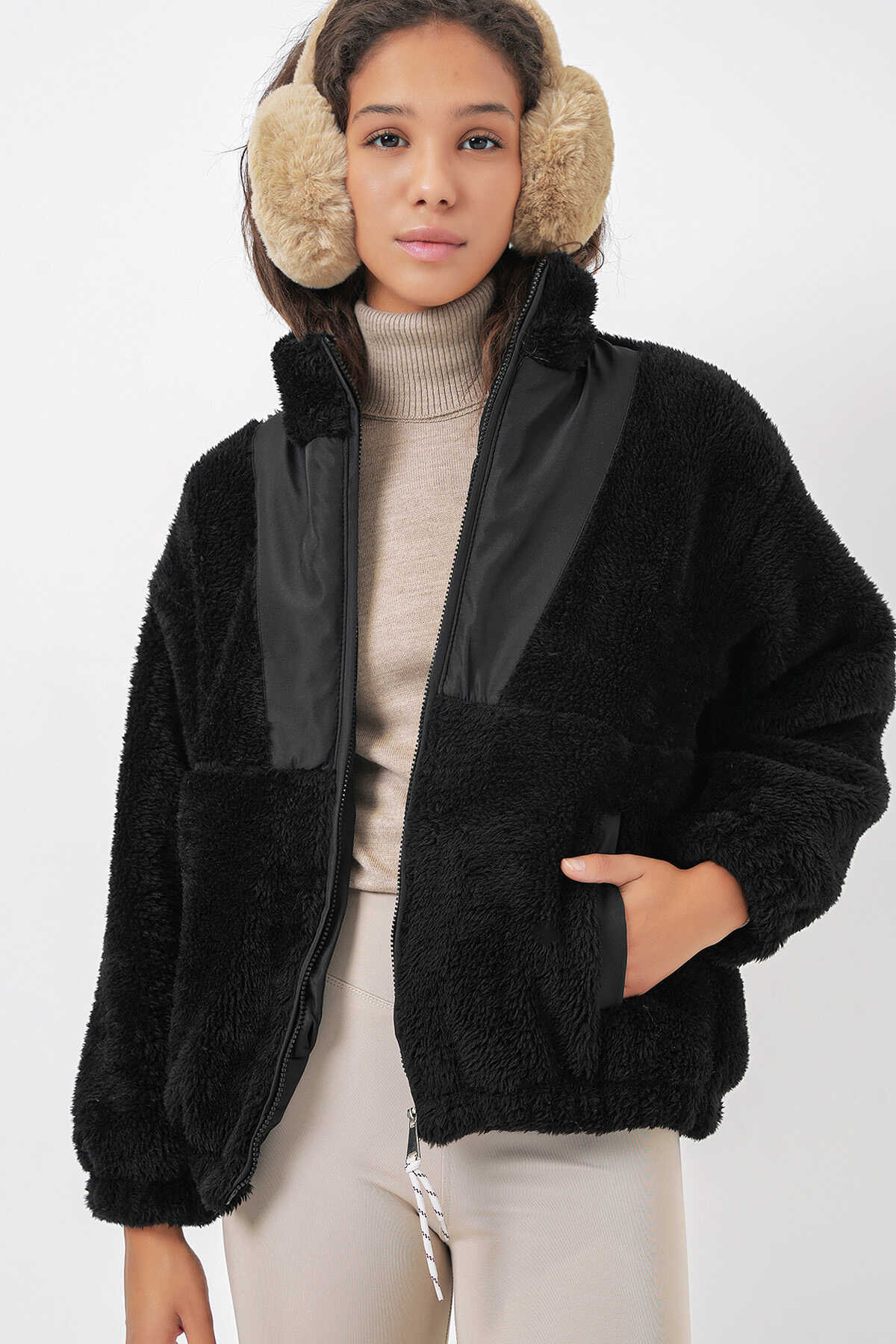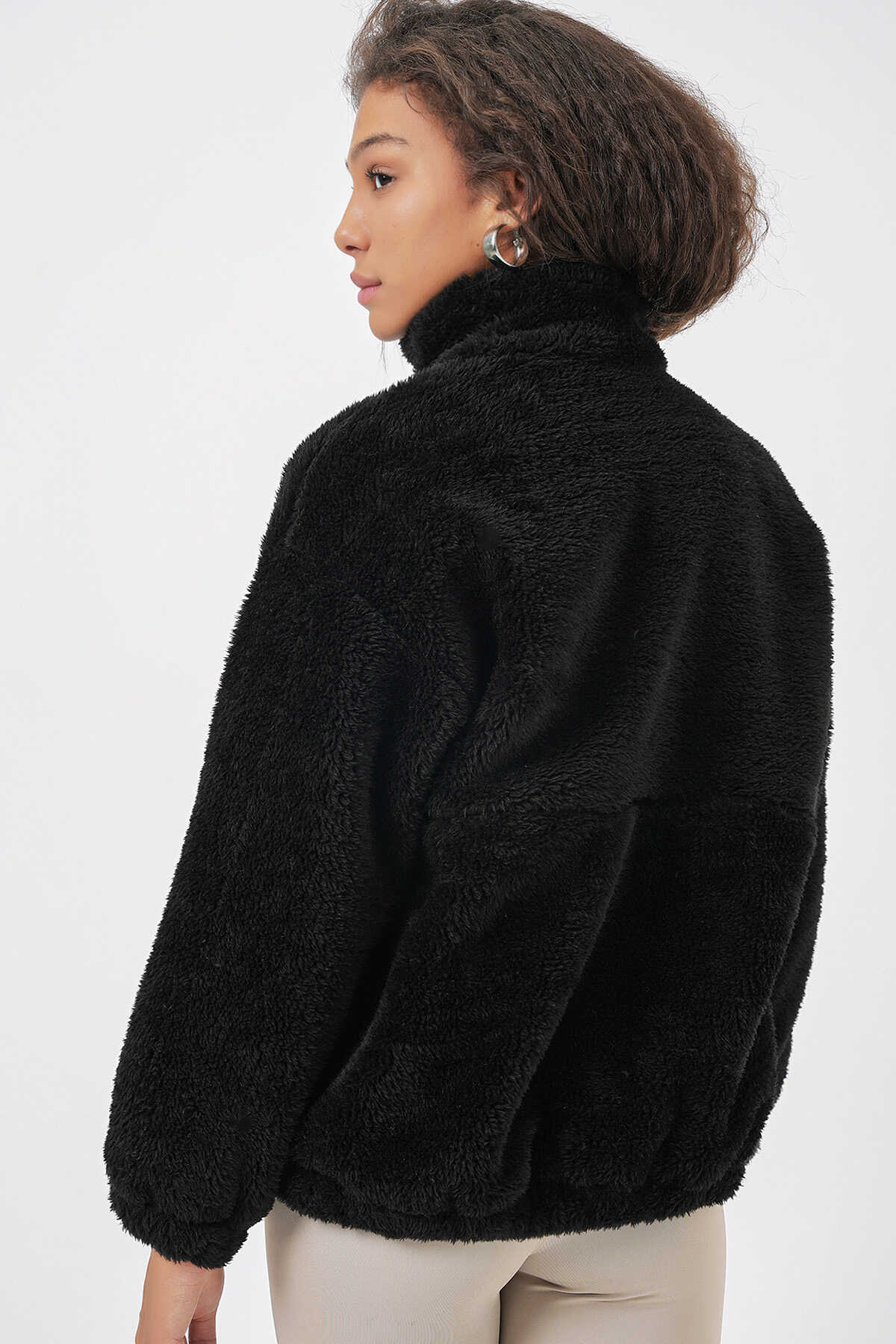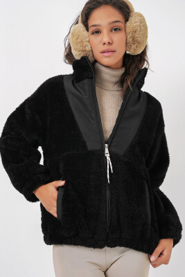 5194 Kadın Peluş Mont Ceket - D. Siyah - Kombin