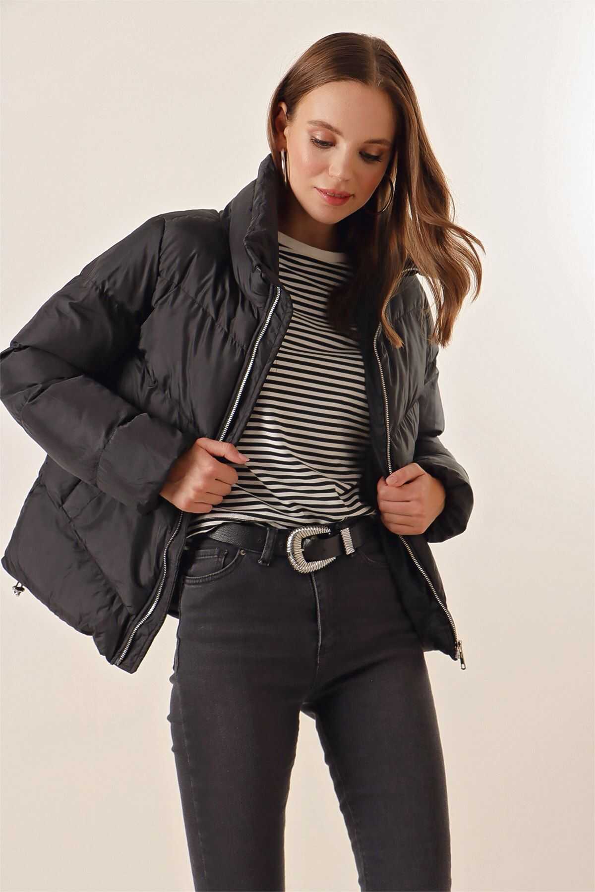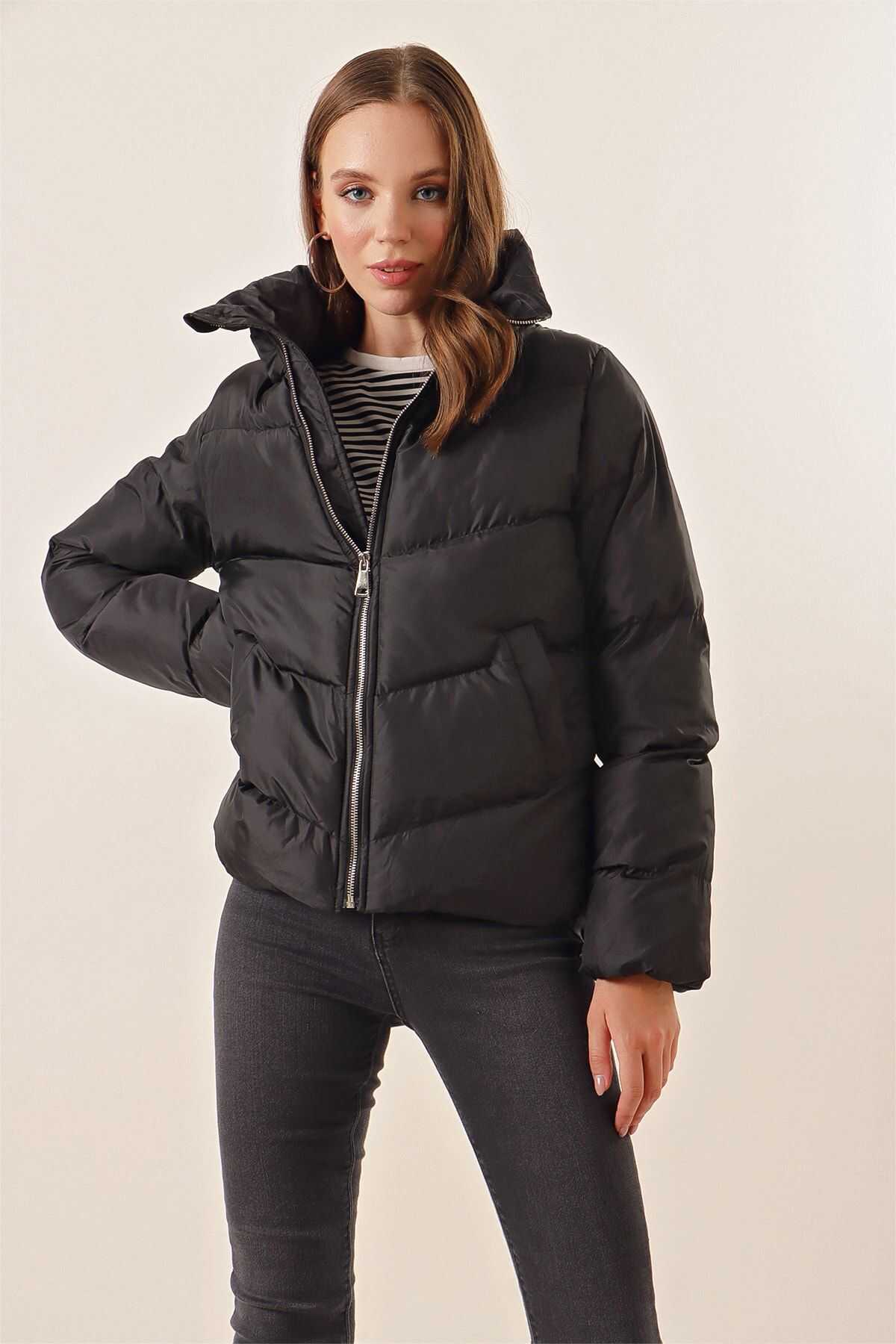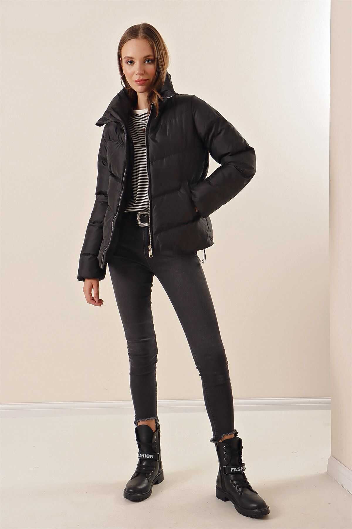 5205 Dik Yaka Fermuarlı Şişme Mont - Siyah - Kombin