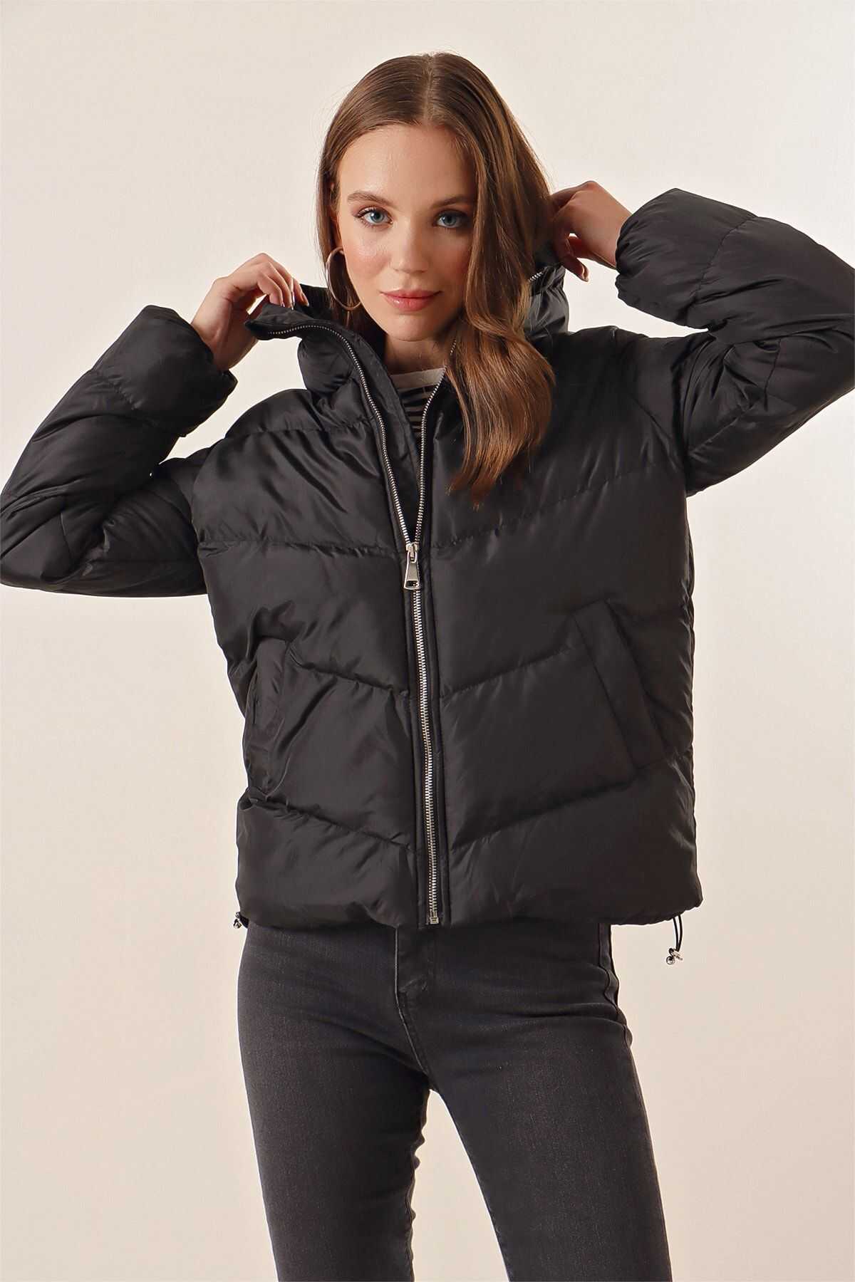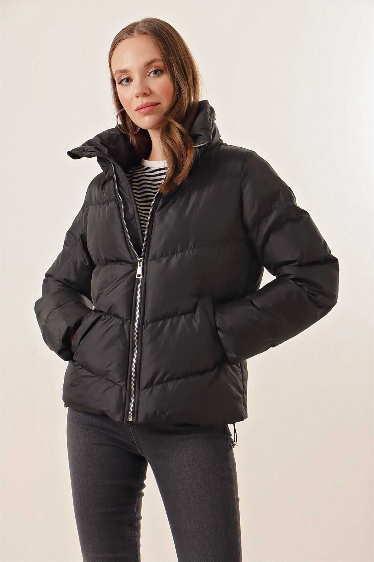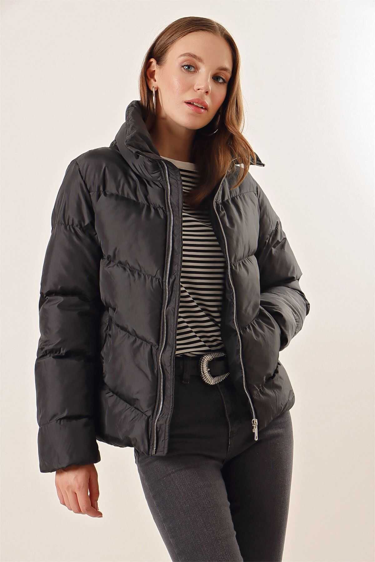 5205 Dik Yaka Fermuarlı Şişme Mont - Siyah - Kombin