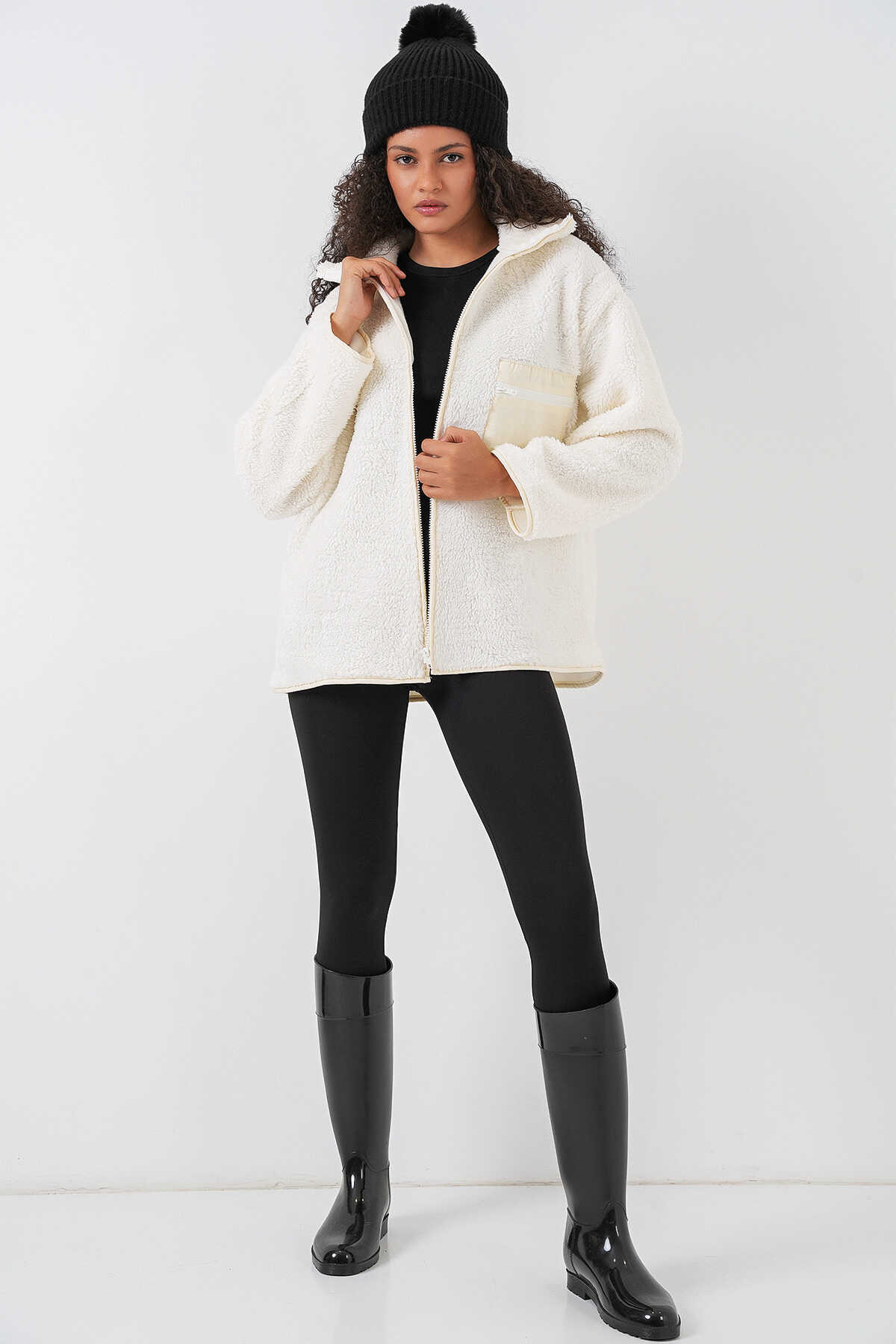 55446 Fermuarlı Oversize Peluş Mont - Bej - Kombin
