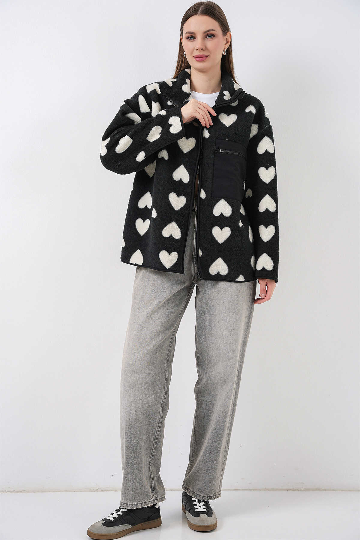 55446 Fermuarlı Oversize Peluş Ceket Mont - K. Siyah - Kombin