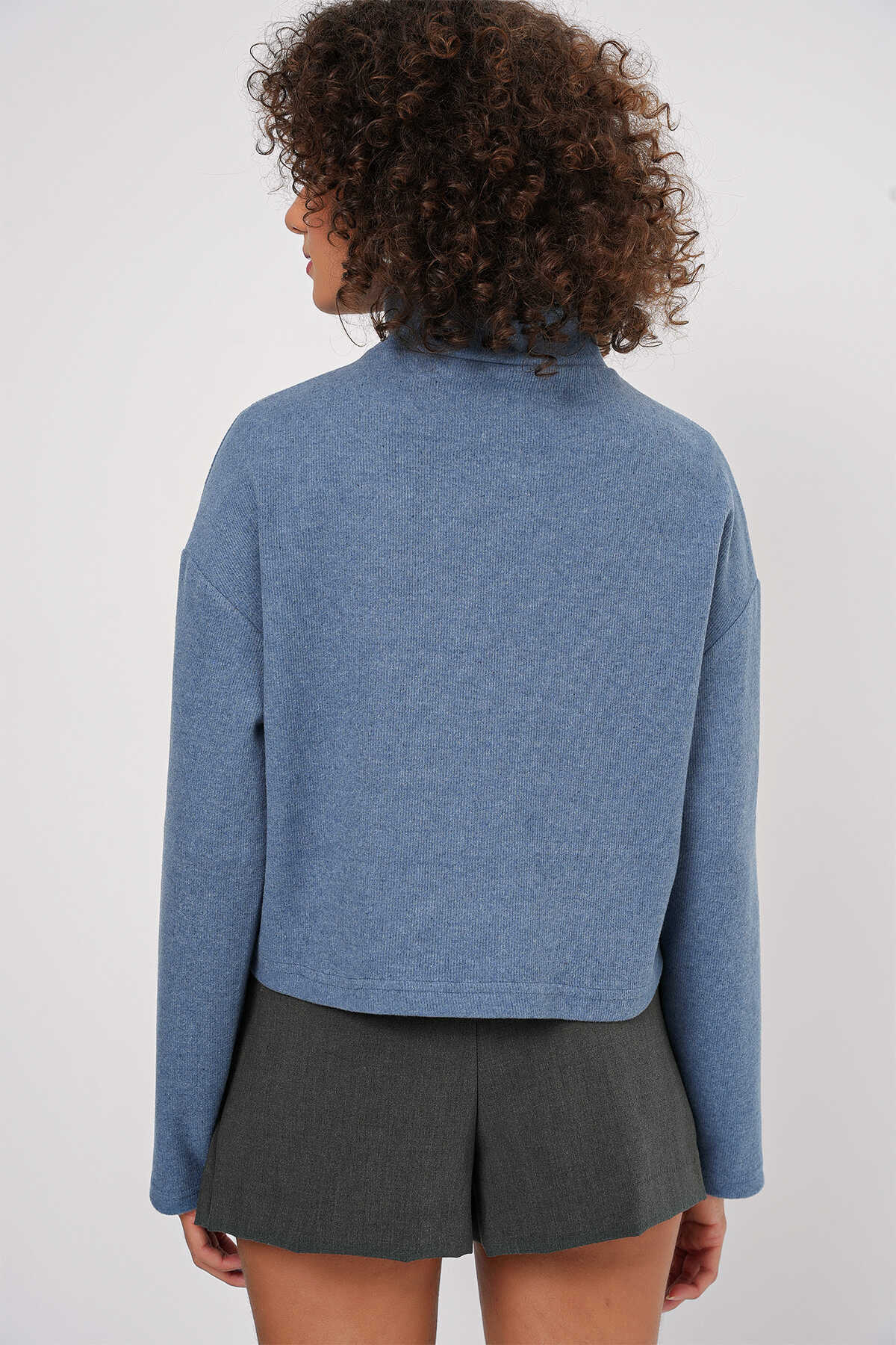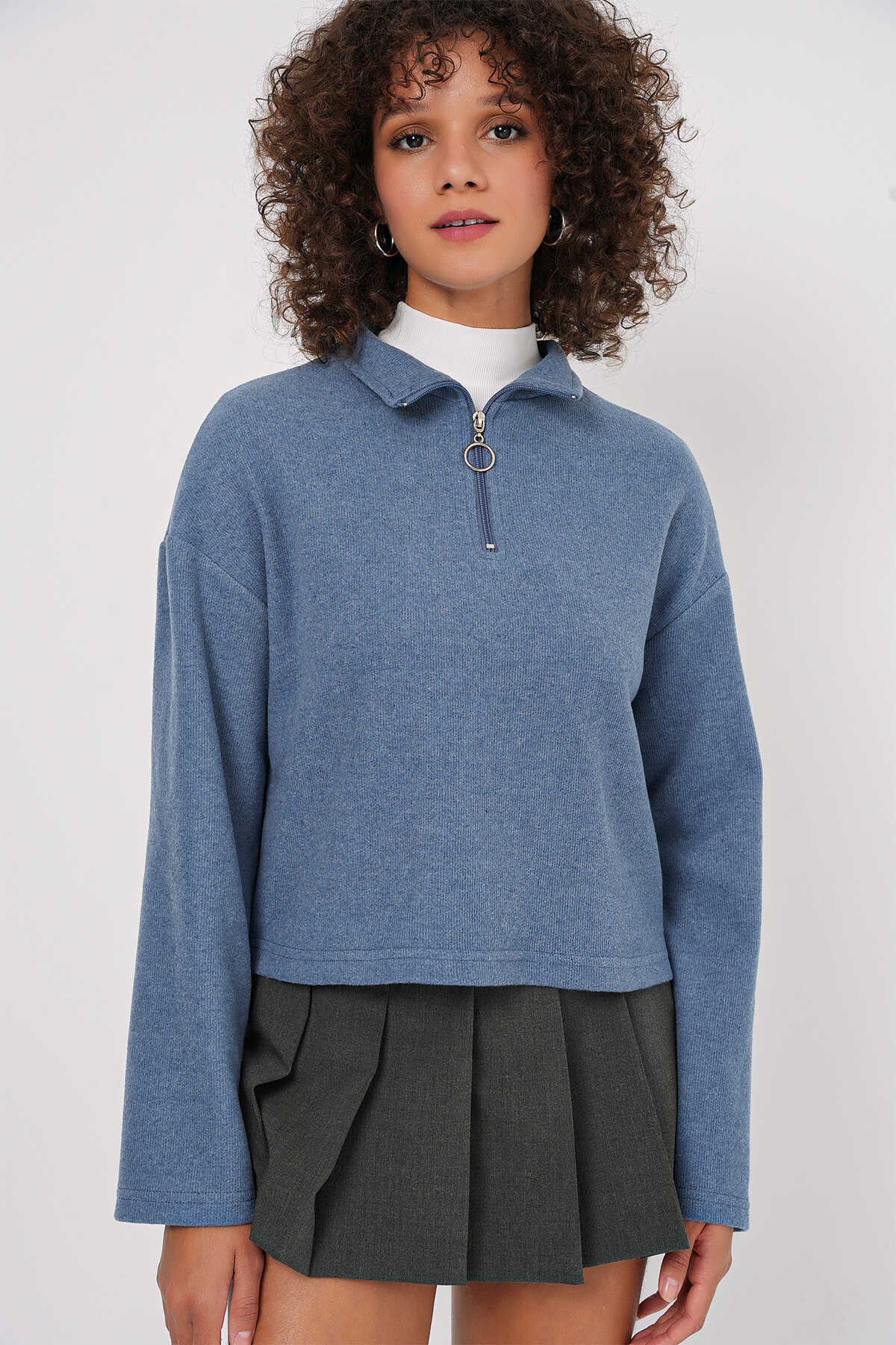 55449 Fermuarlı Yaka Örme Sweatshirt - İndigo - Kombin