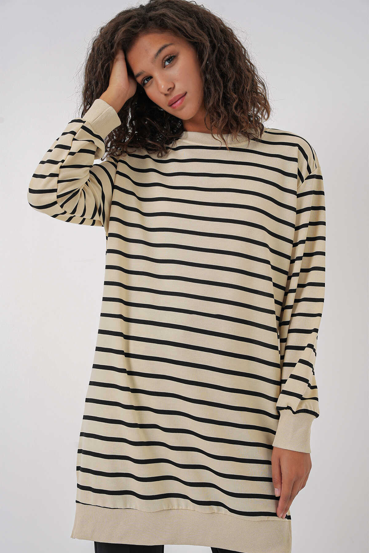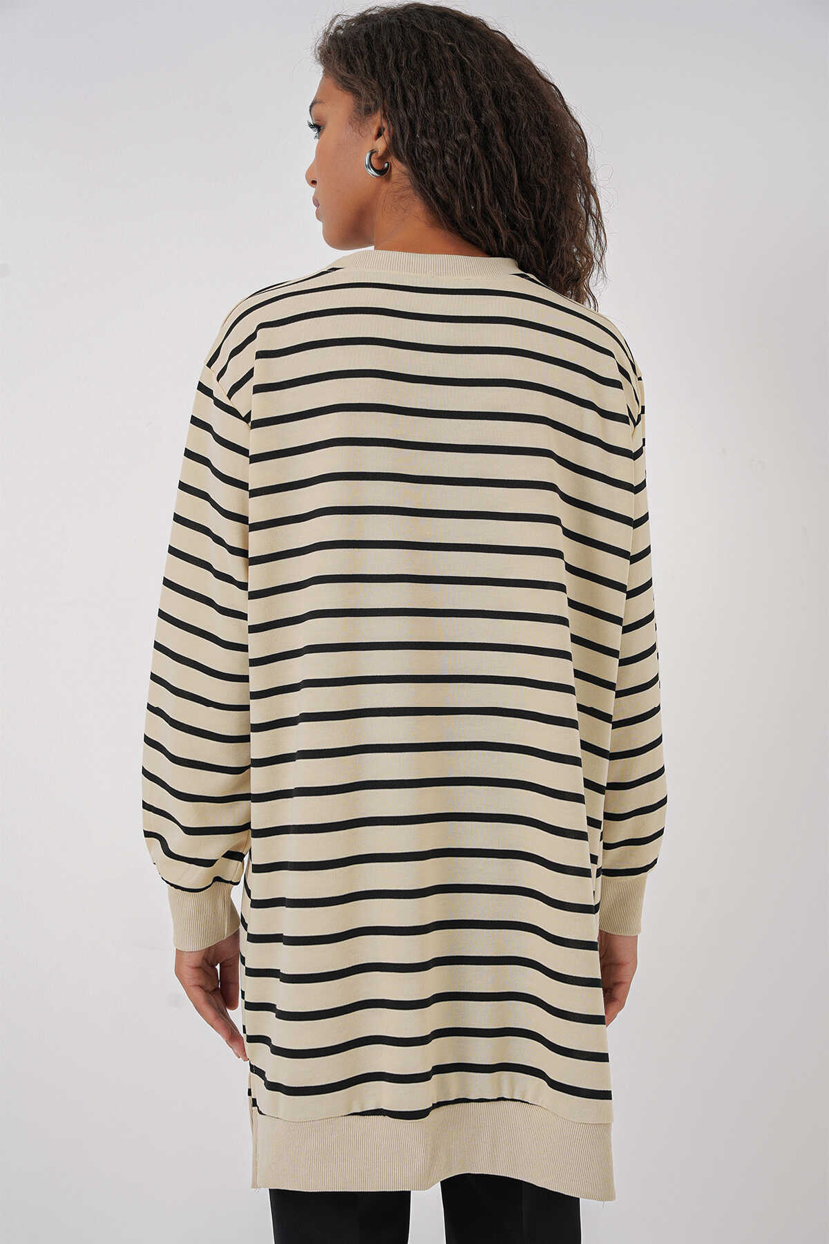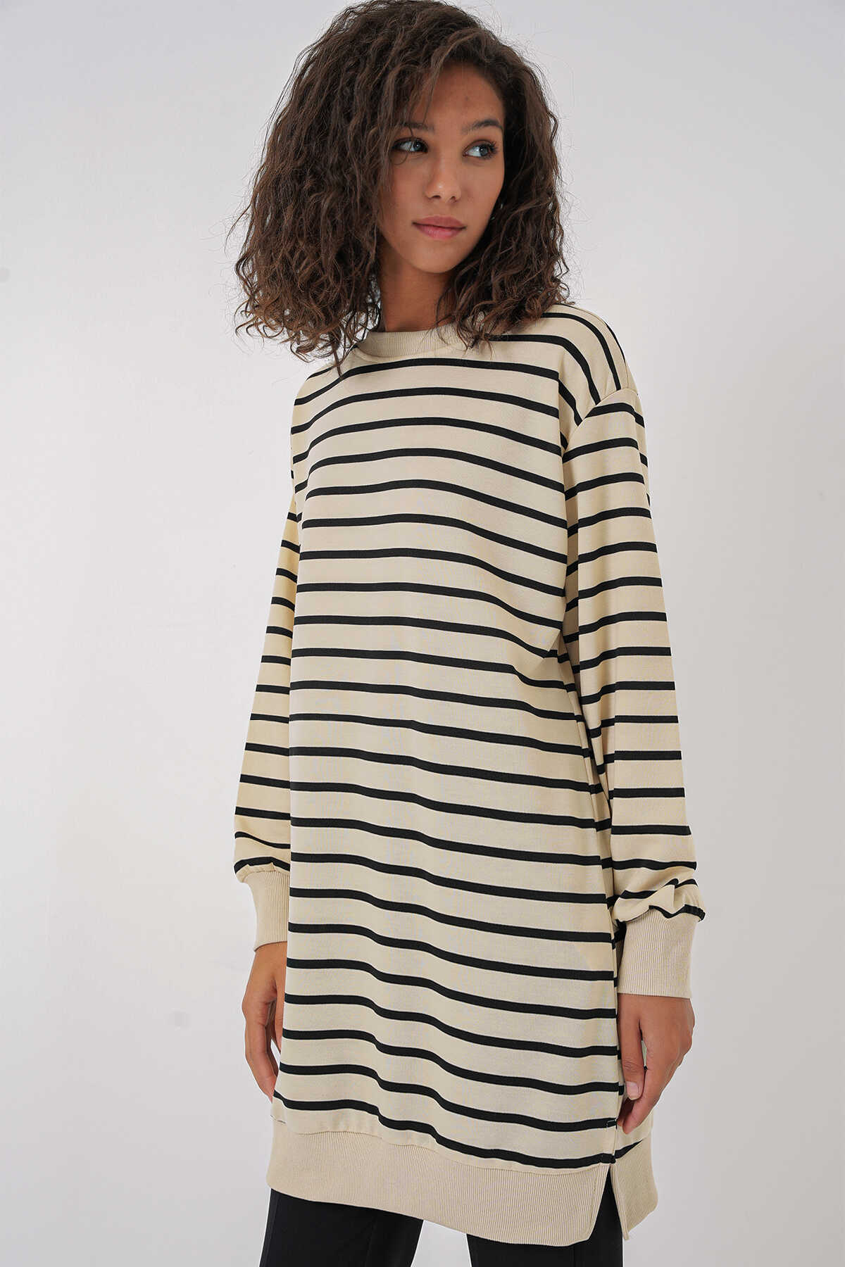 55452 Kadın Bisiklet Yaka Çizgili Tesettür Tunik - Siyah - Kombin