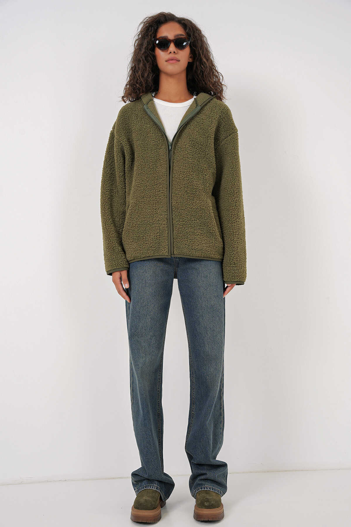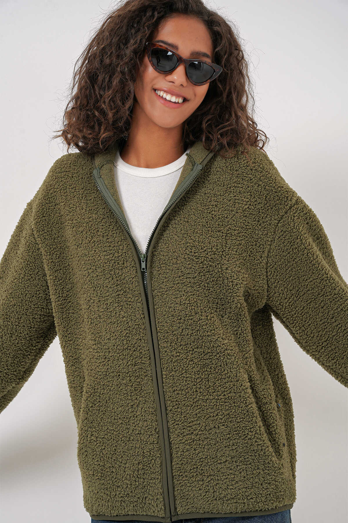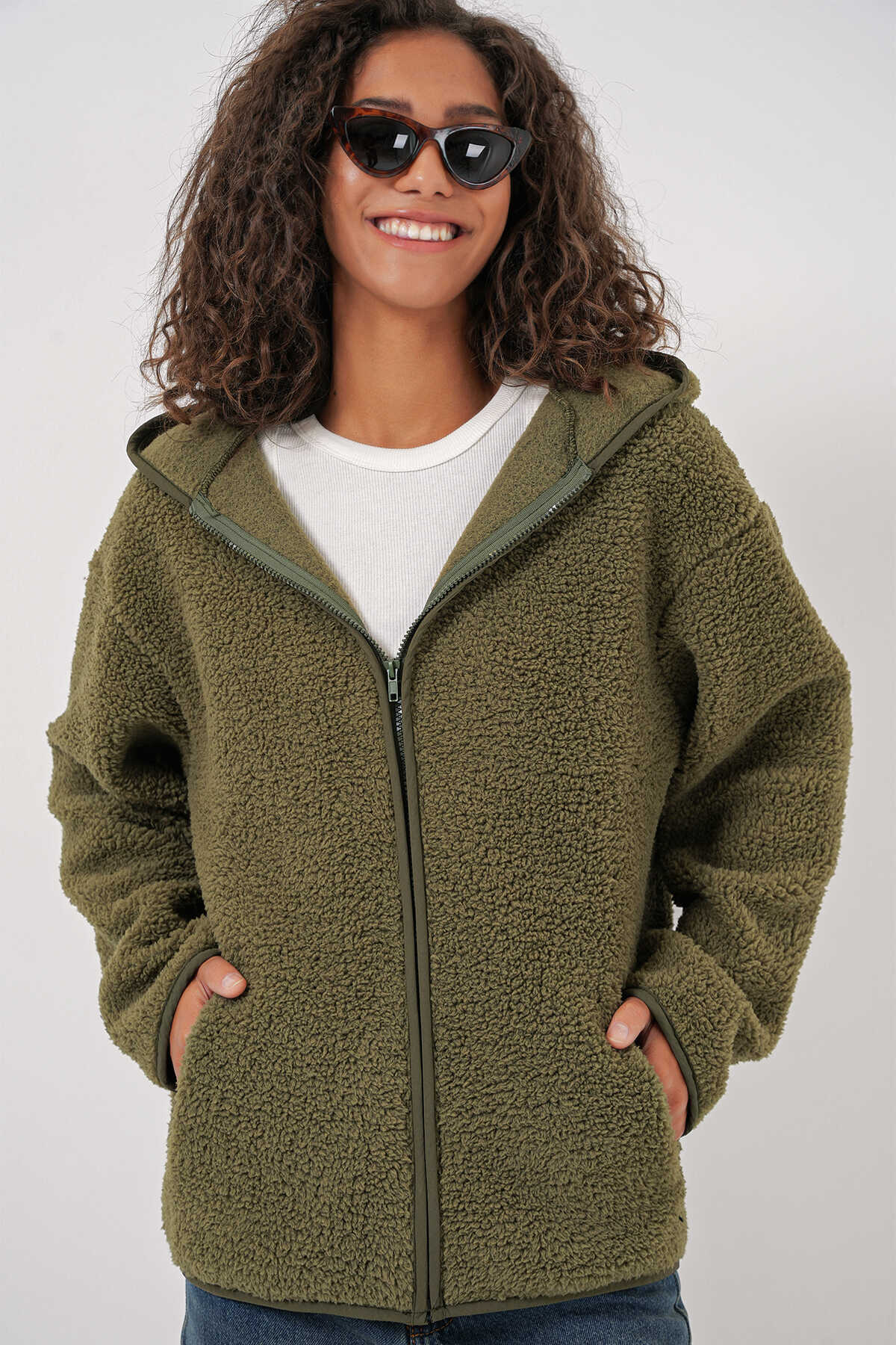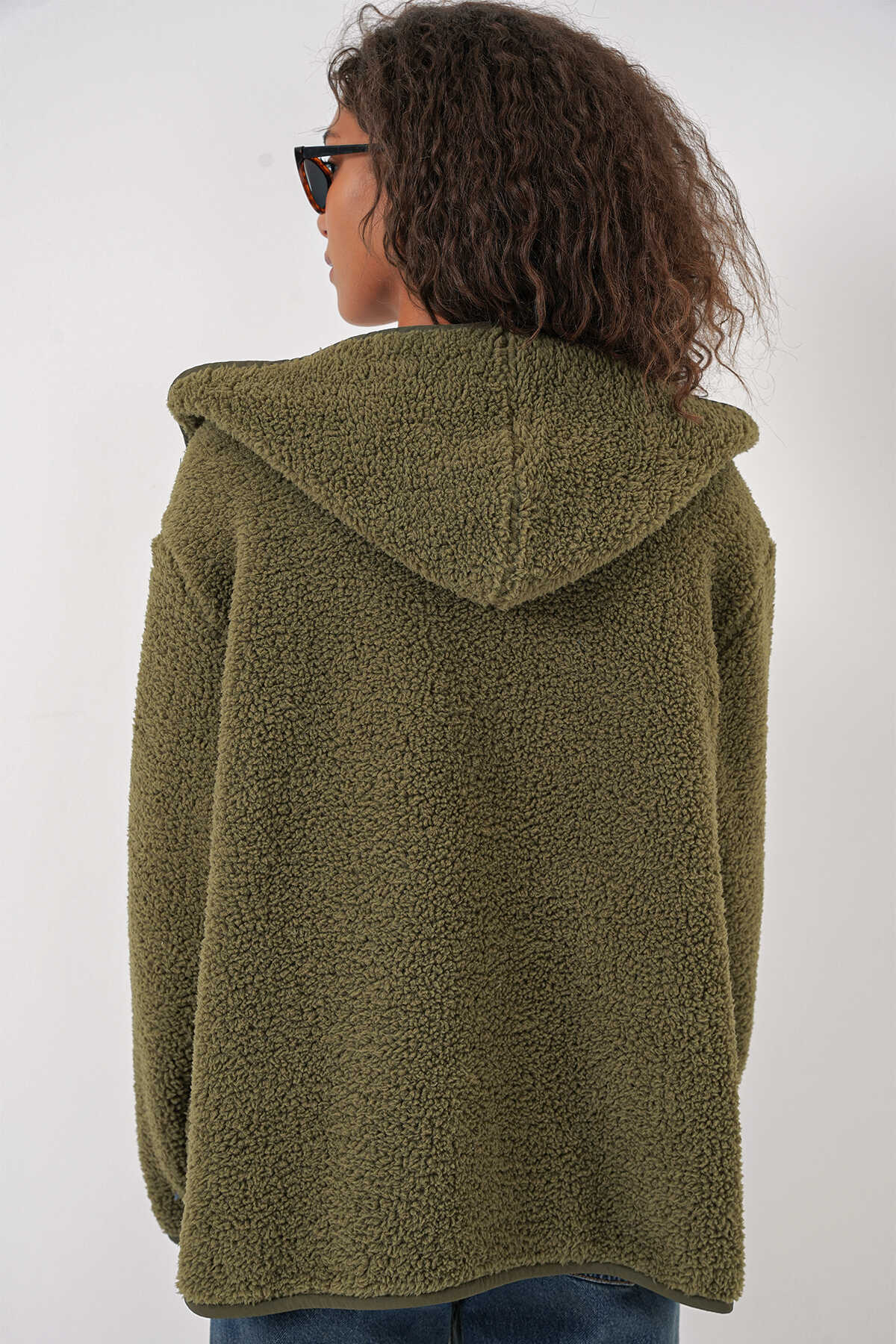 Kadin Kapüsonlu Oversize Pelus Ceket
