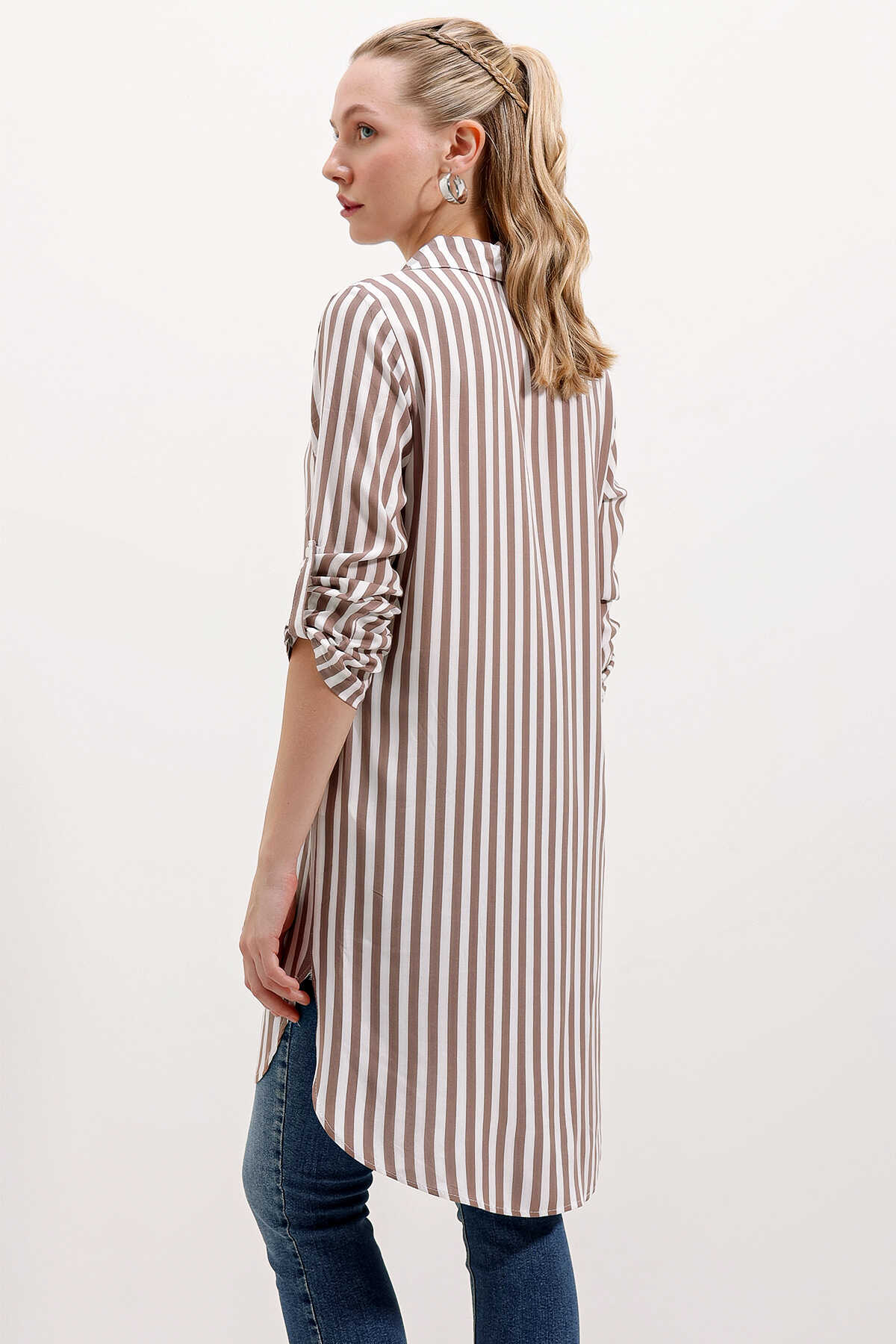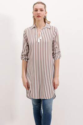 5613 Yaka Bağcıklı Çizgili Tunik - Vizon - Kombin