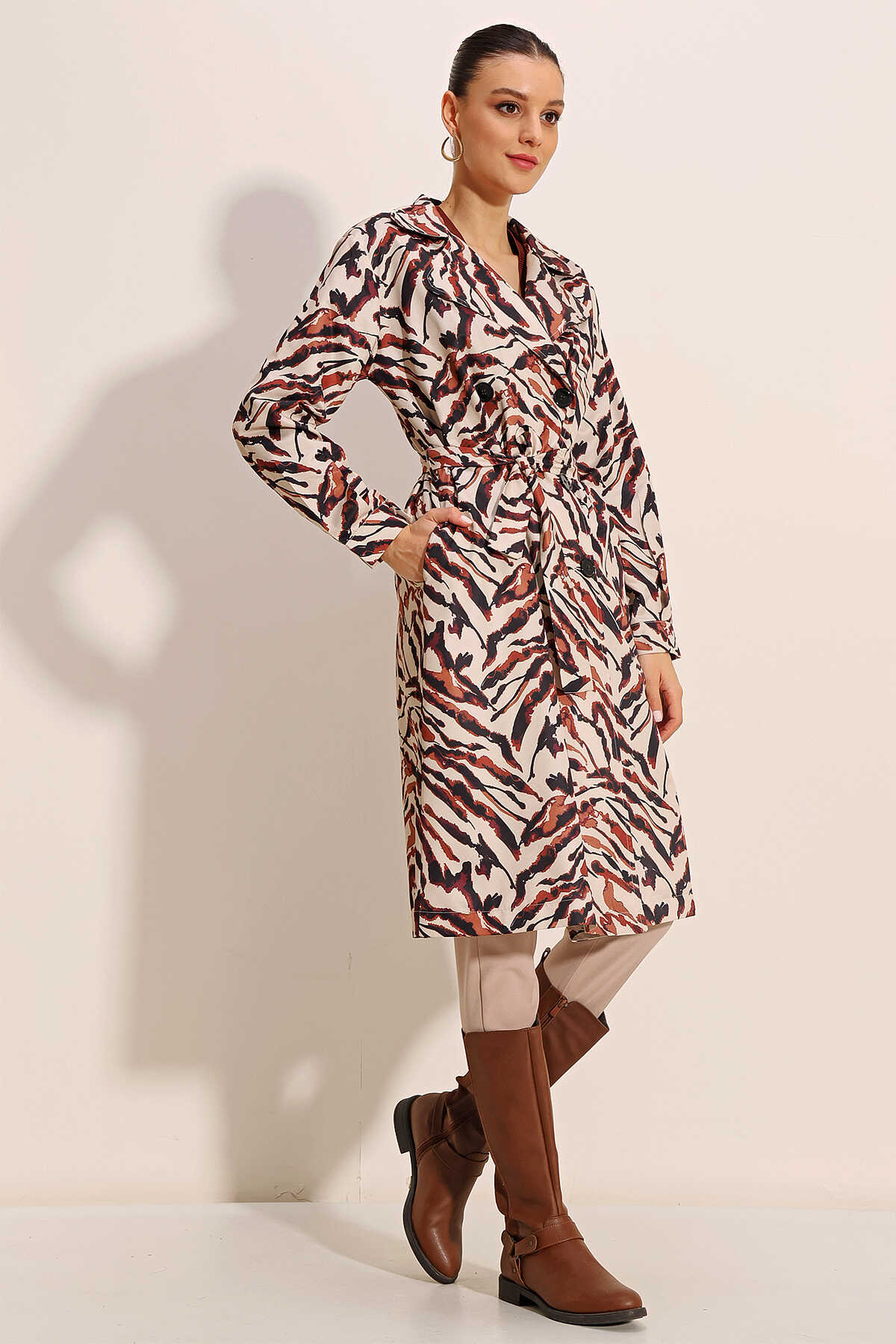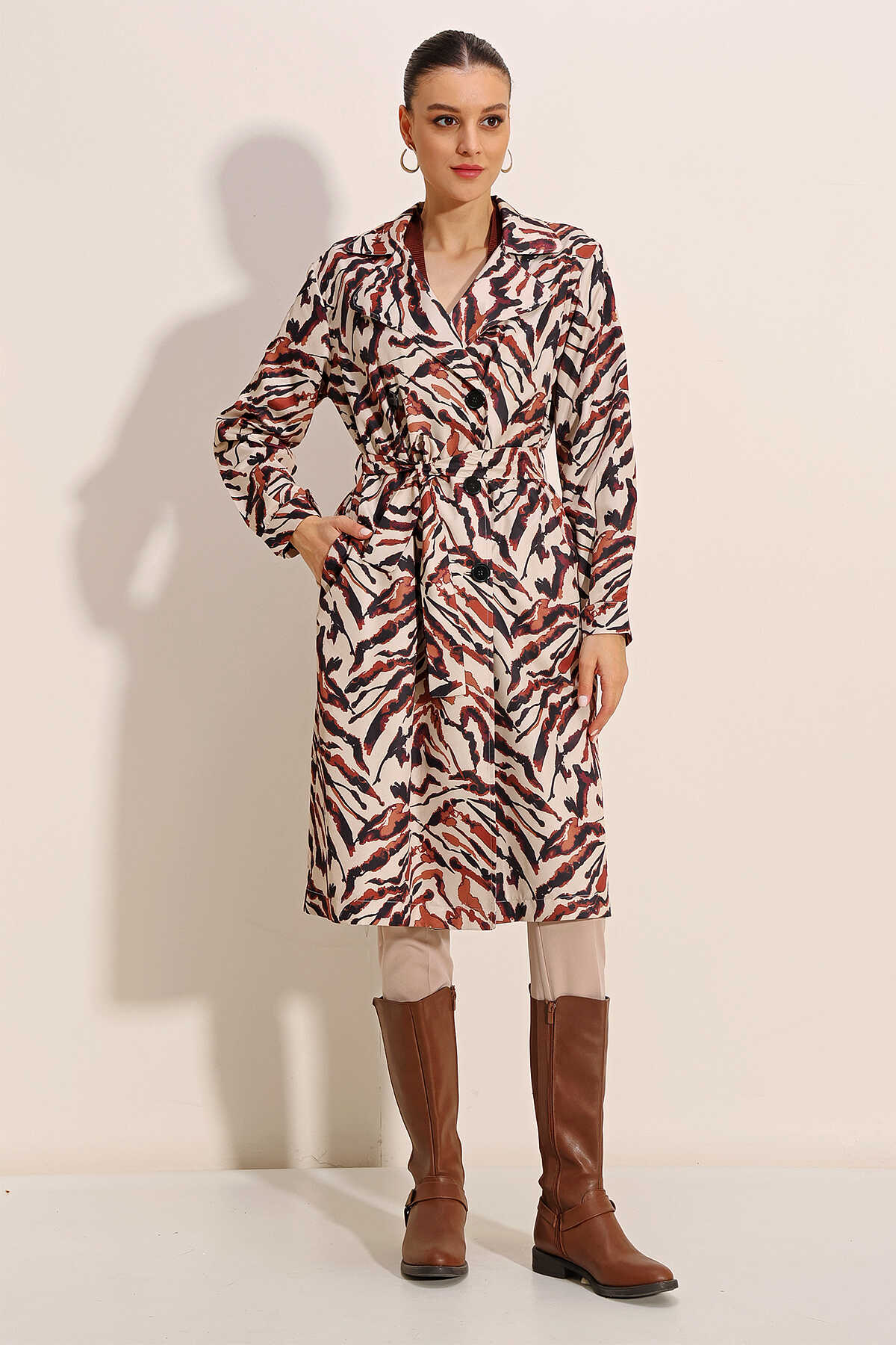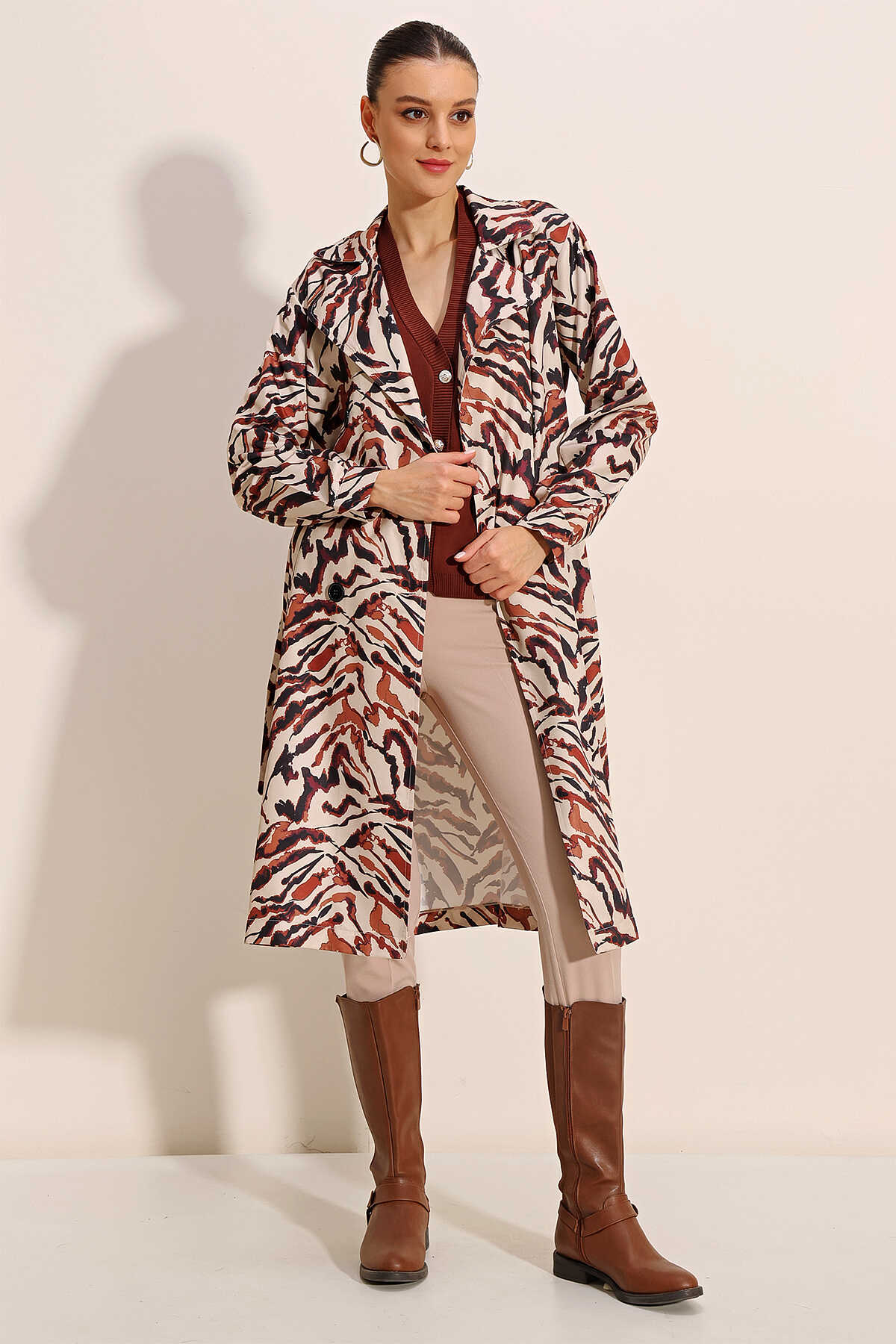 5853 Desenli Kruvaze Yaka Trençkot - C. Bej - Kombin