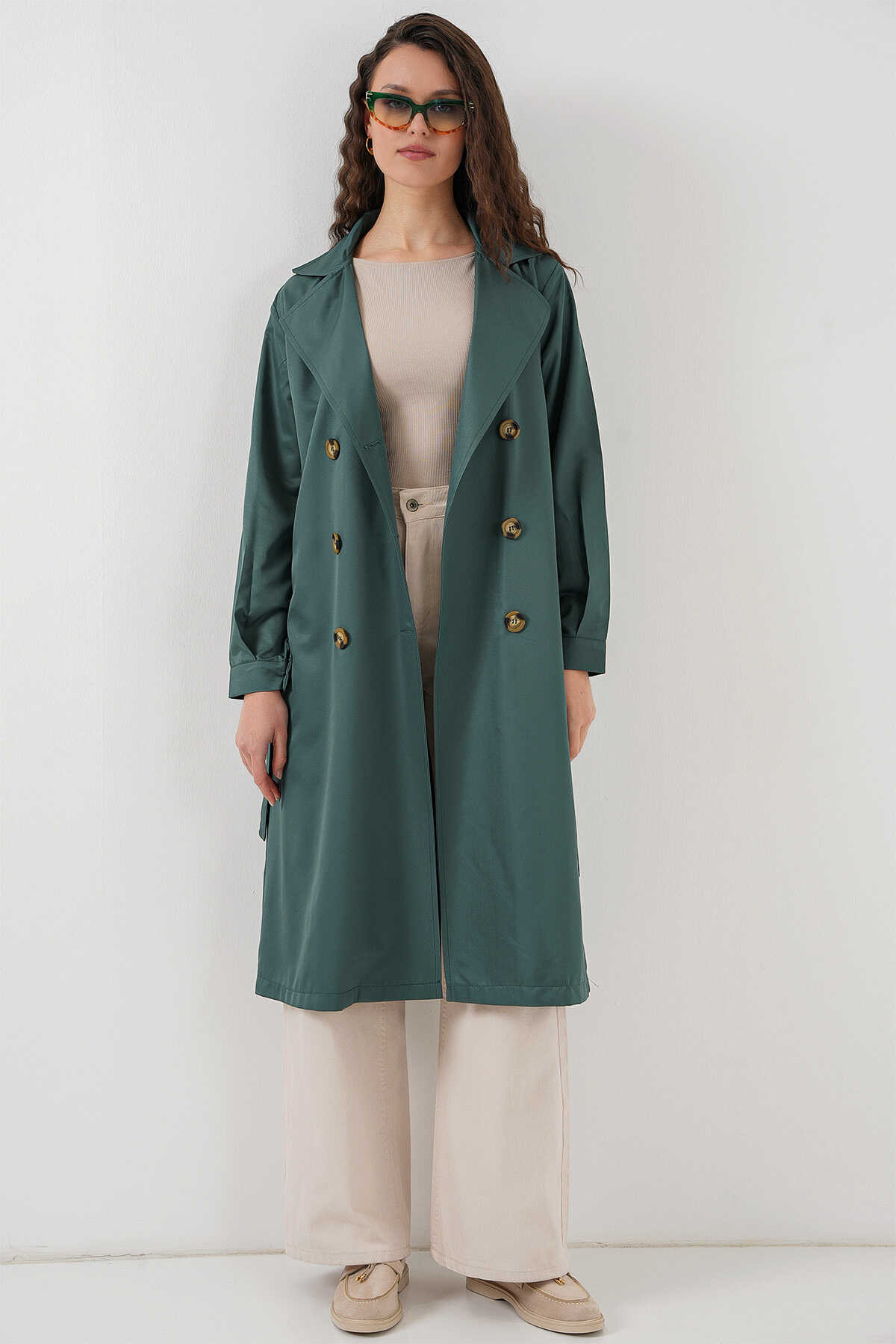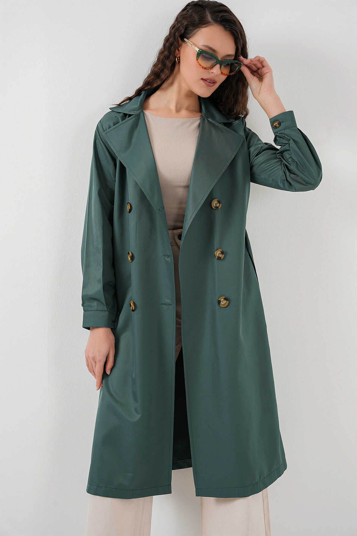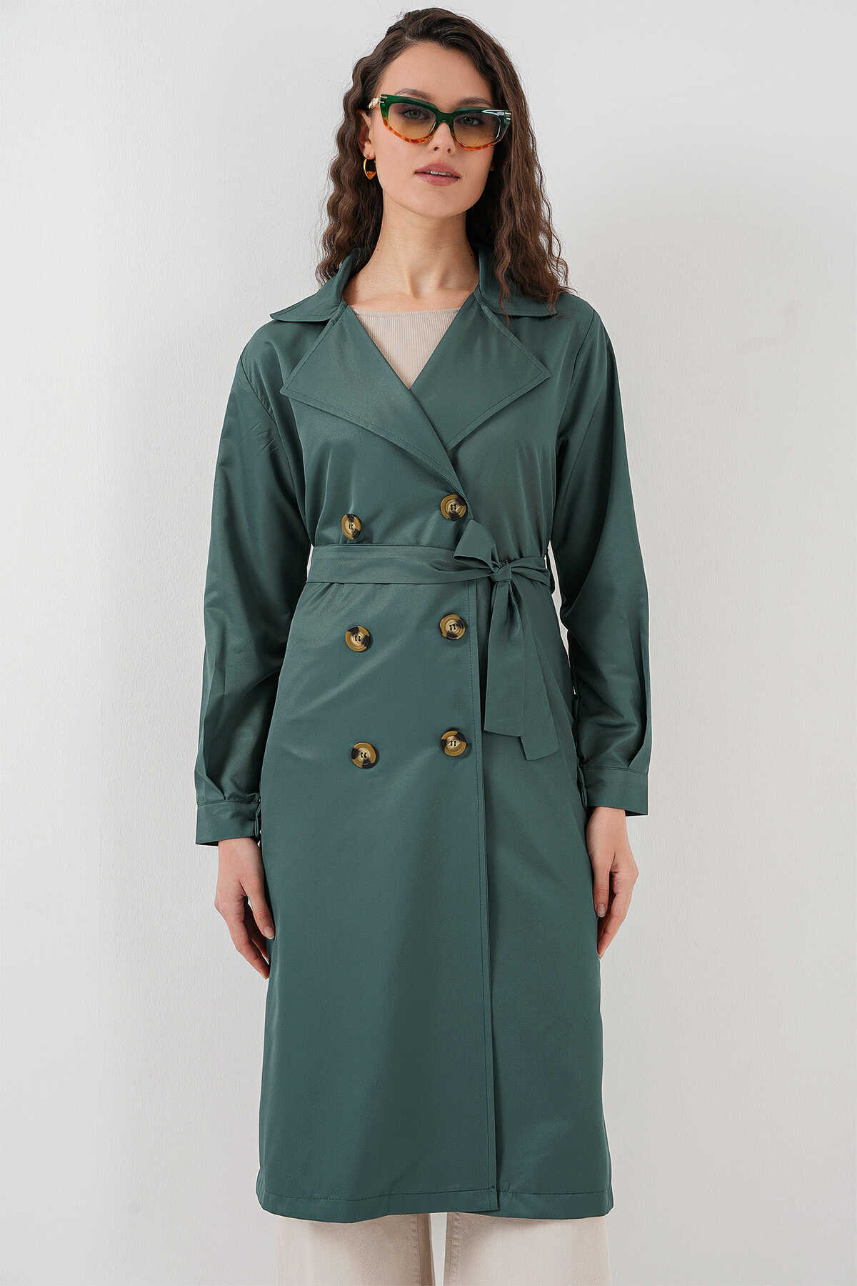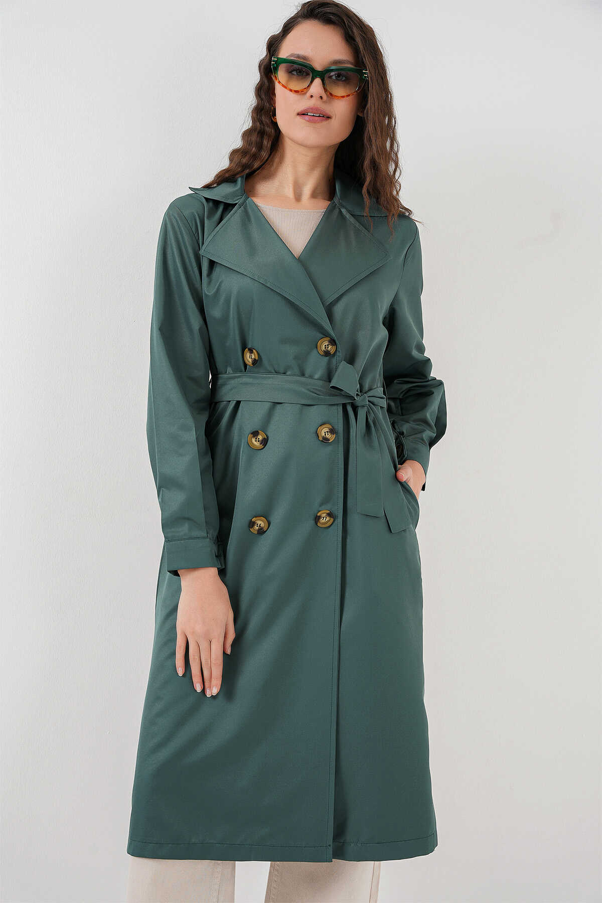 5853 Kruvaze Yaka Trençkot - Zümrüt Yeşili - Kombin