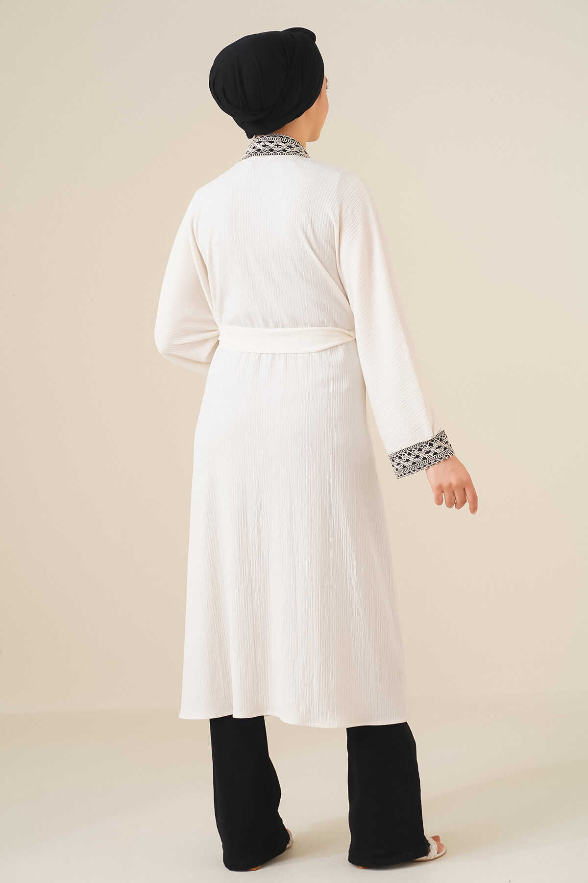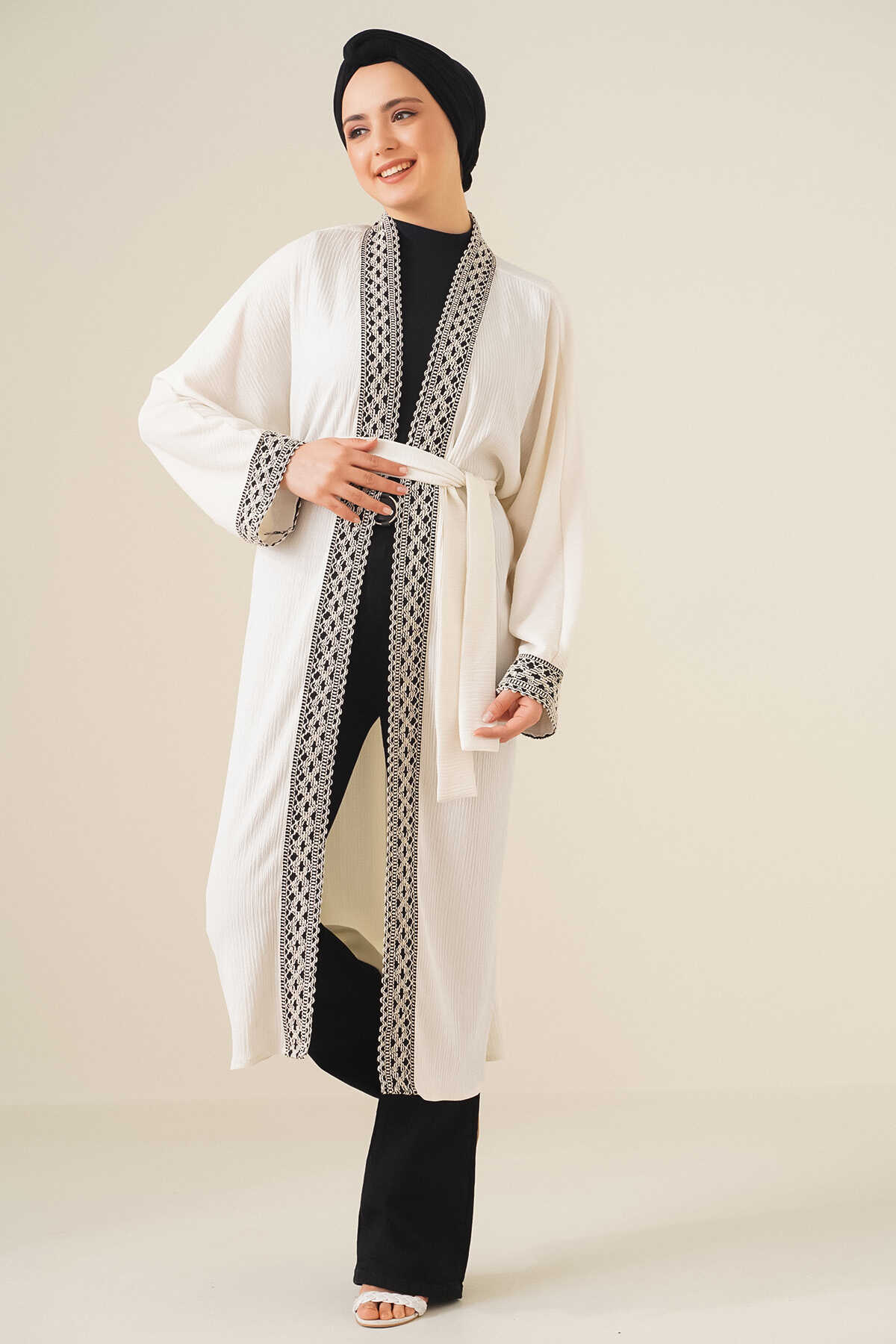 5865 Nakışlı Örme Uzun Kimono - Beyaz - Kombin