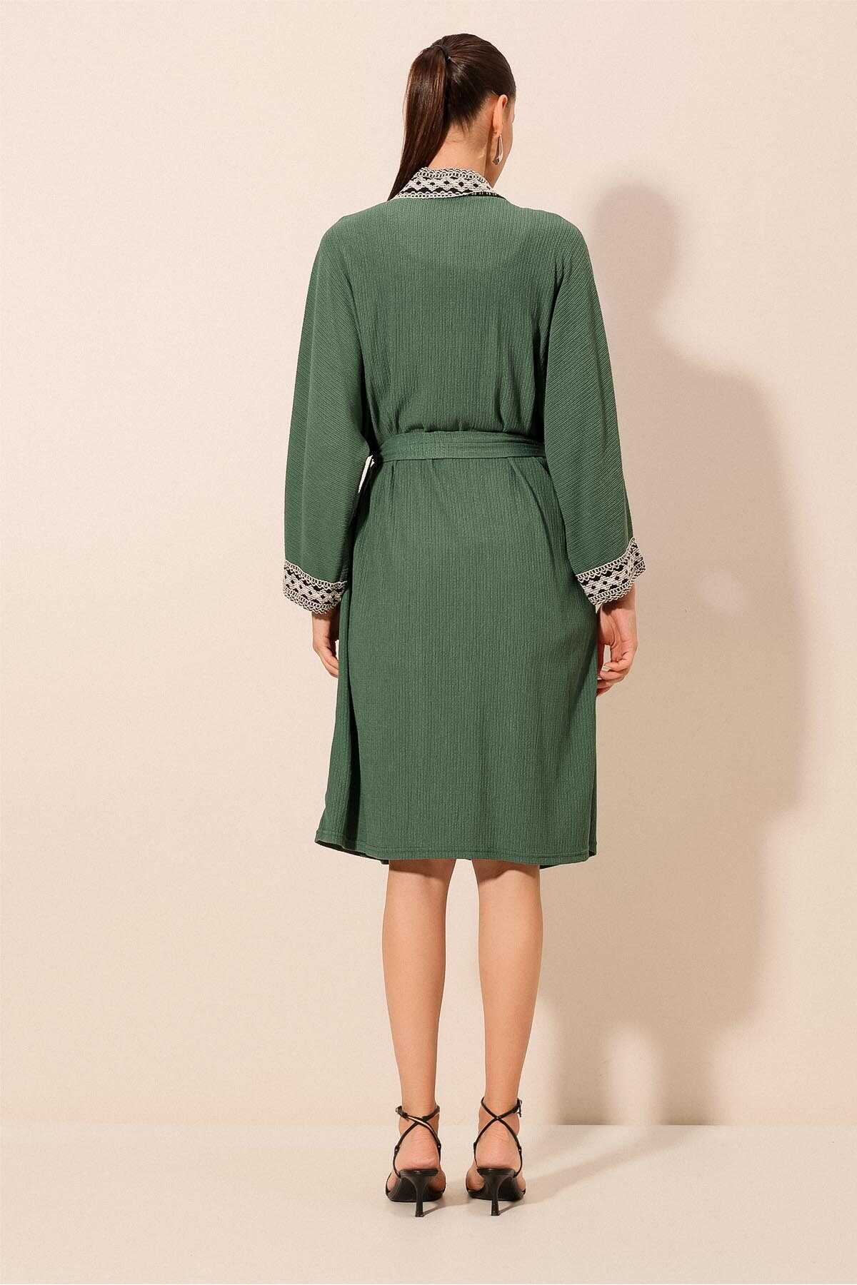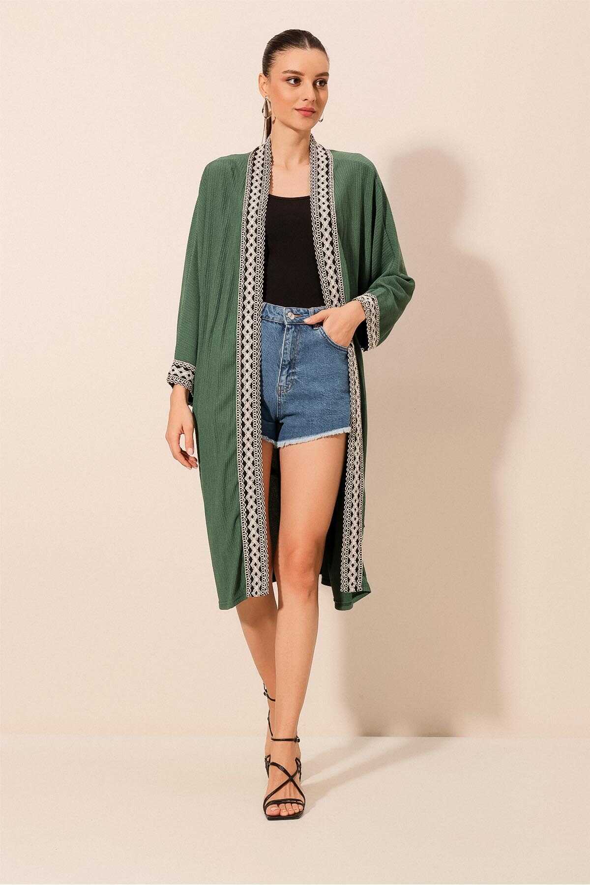 5865 Nakışlı Örme Uzun Kimono - Zümrüt Yeşili - Kombin
