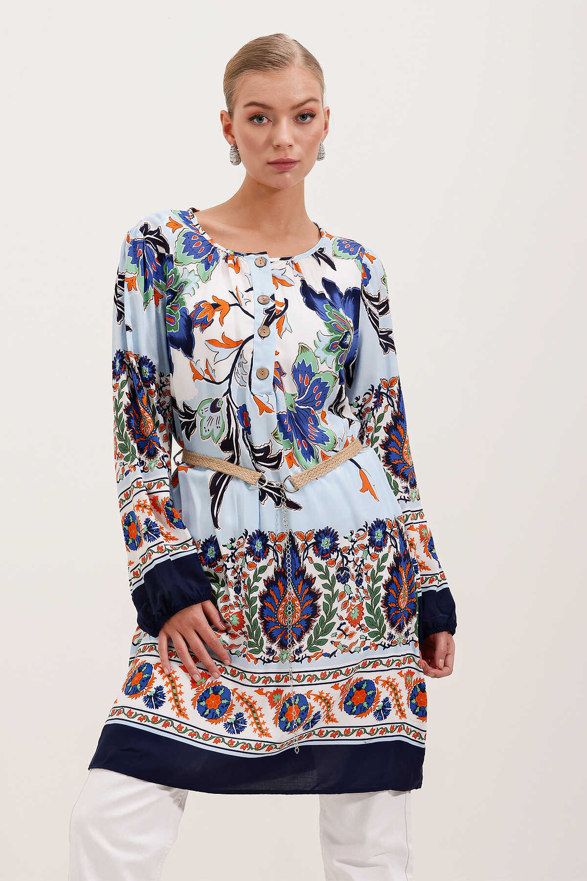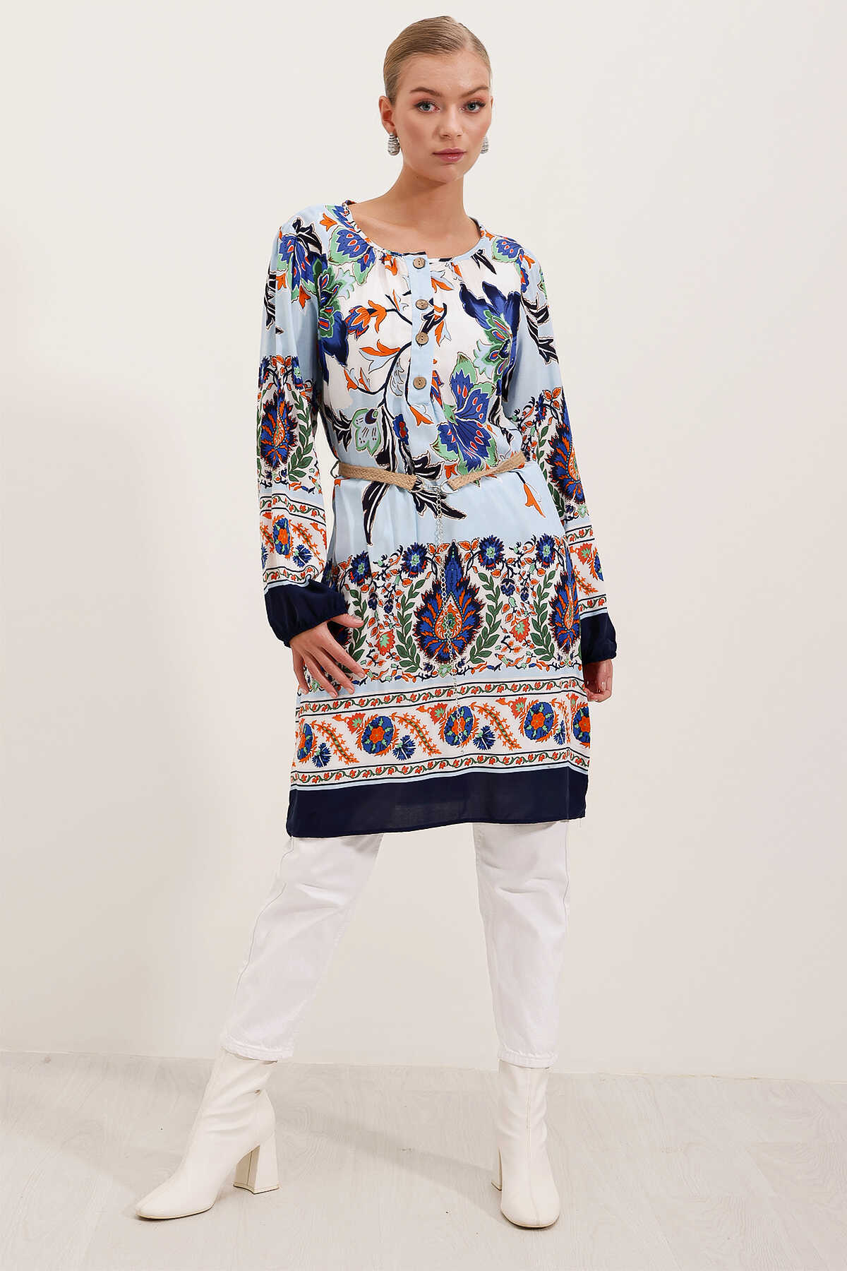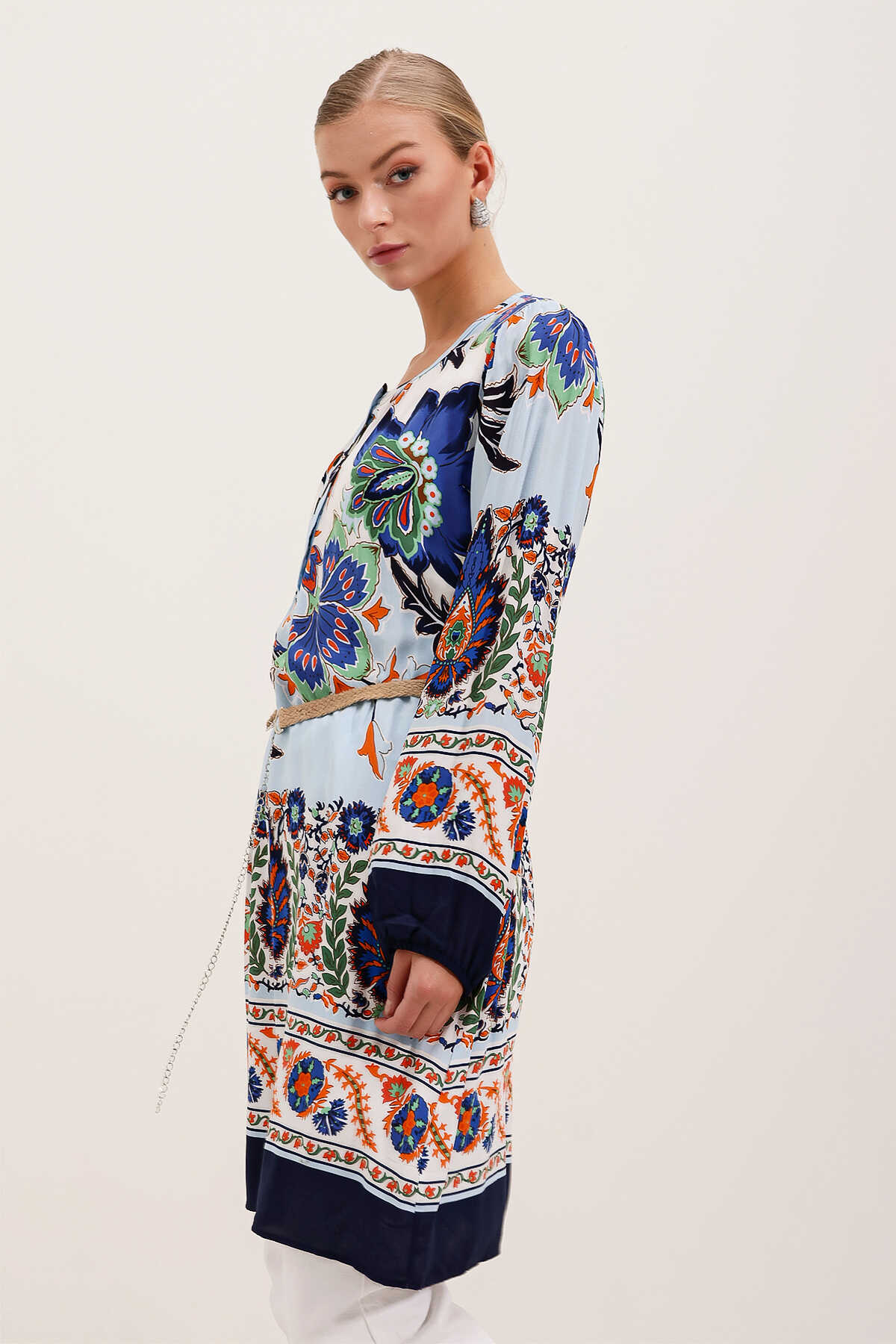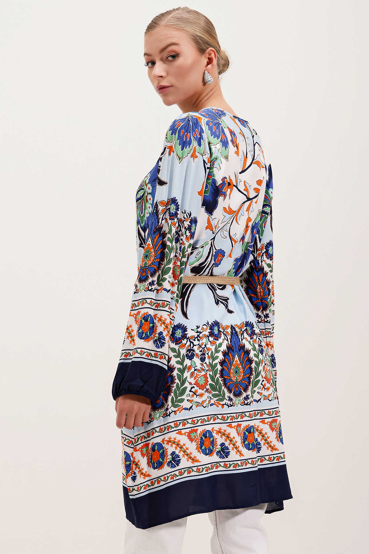 5902 Kemerli Desenli Elbise - Lacivert - Kombin