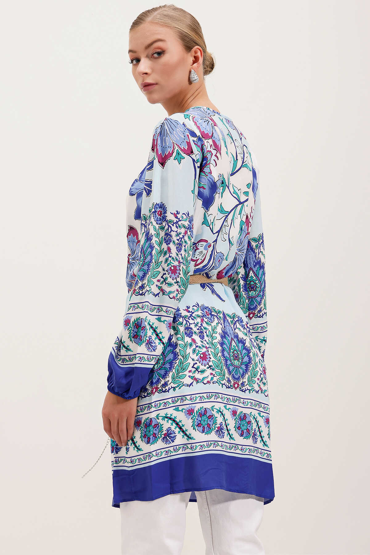 5902 Kemerli Desenli Elbise - Saks - Kombin