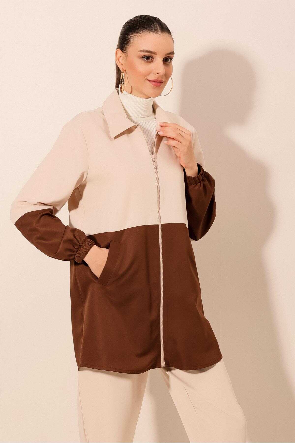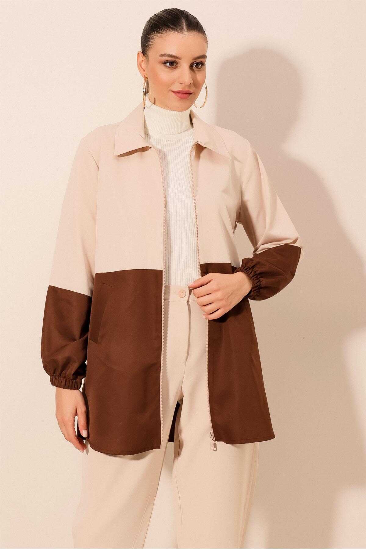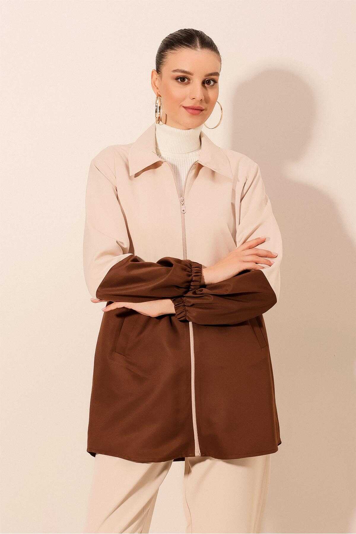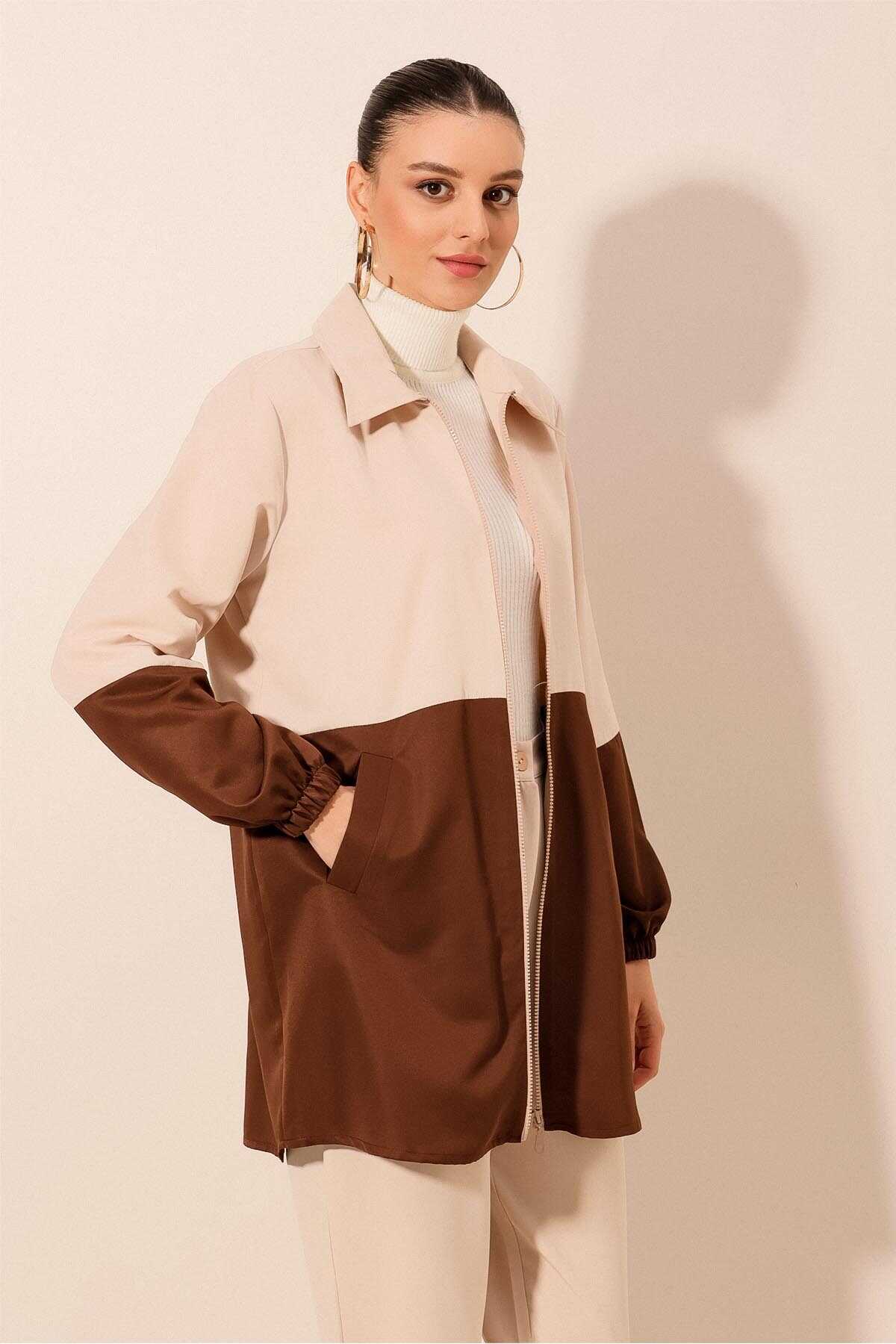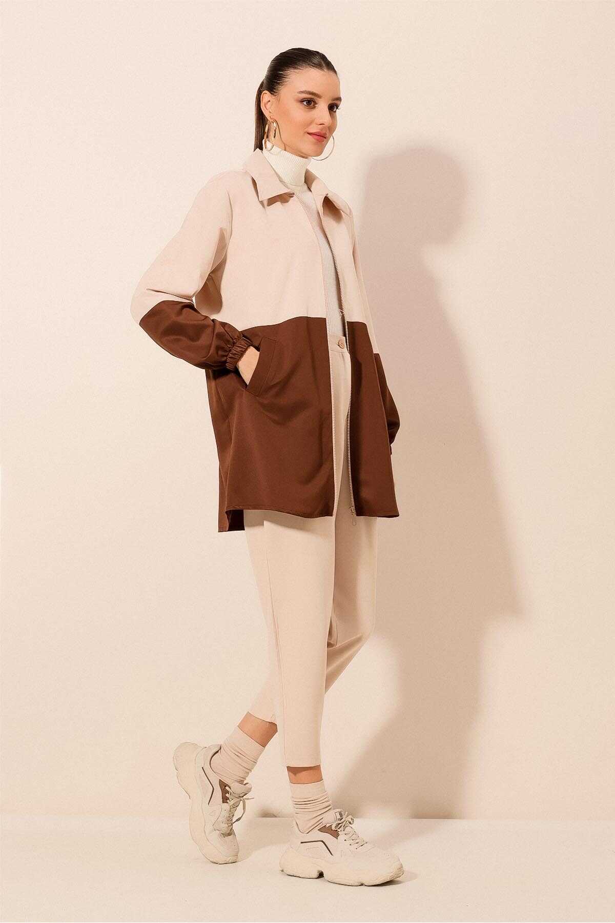 5909 Çift Renkli Mevsimlik Trençkot - Kahverengi - Kombin