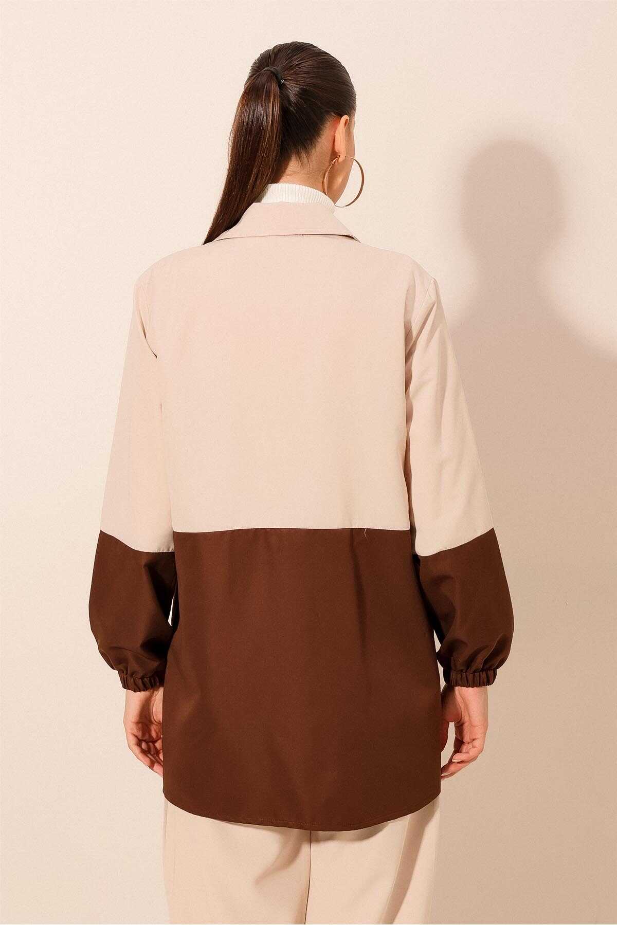 5909 Çift Renkli Mevsimlik Trençkot - Kahverengi