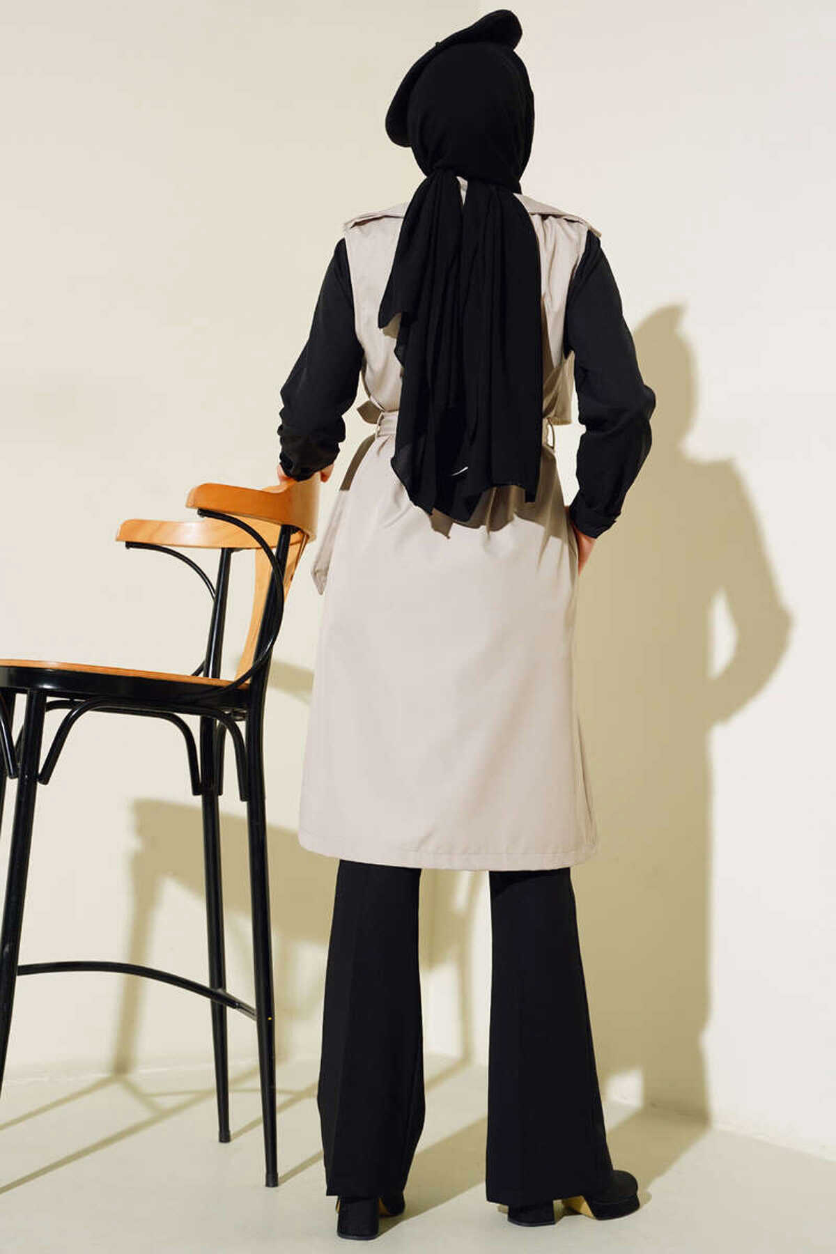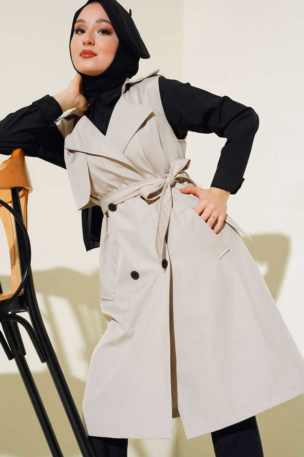 Kruvaze Yaka Trençkot, Kemerli Mevsimlik Kolsuz Trençkot