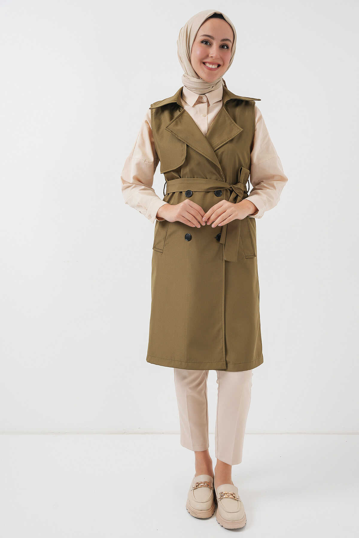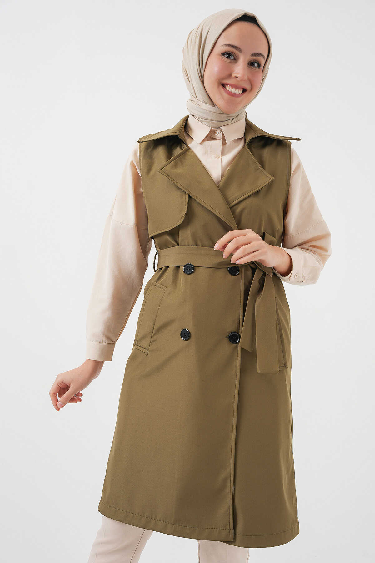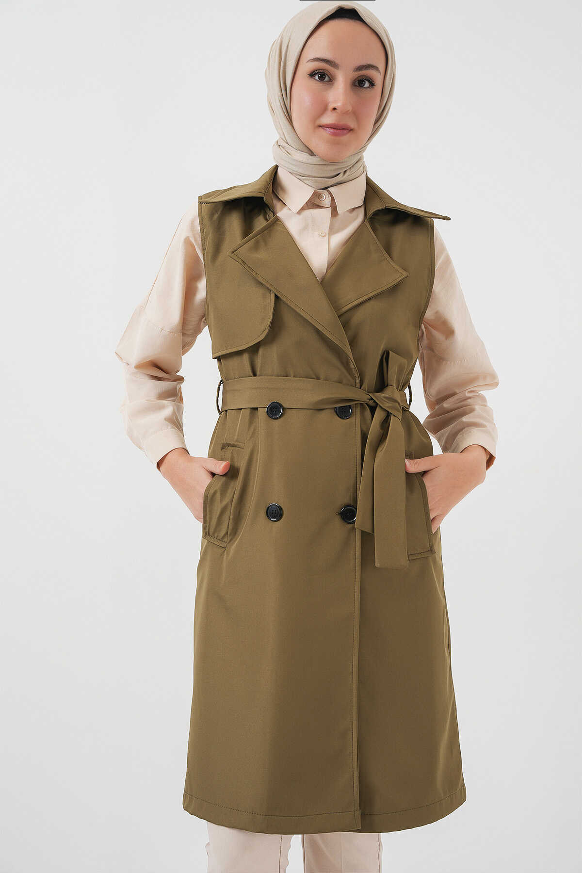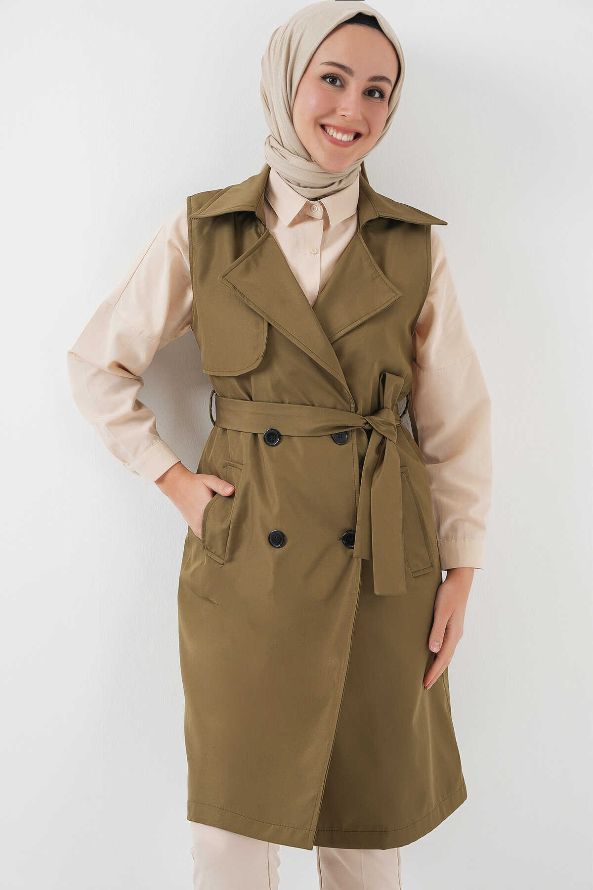 5911 Kruvaze Yaka Trençkot Yelek - Haki - Kombin