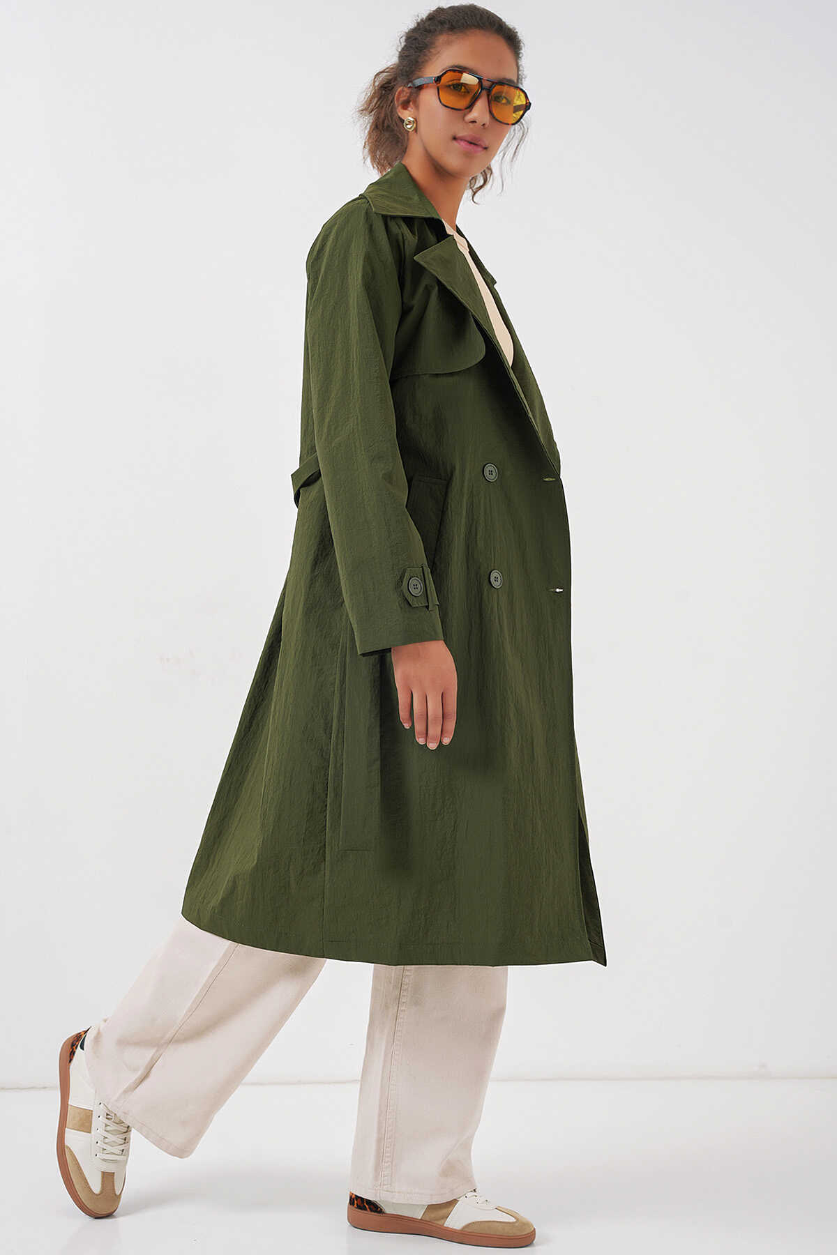 5938 Kruvaze Yaka Trençkot - Haki - Kombin