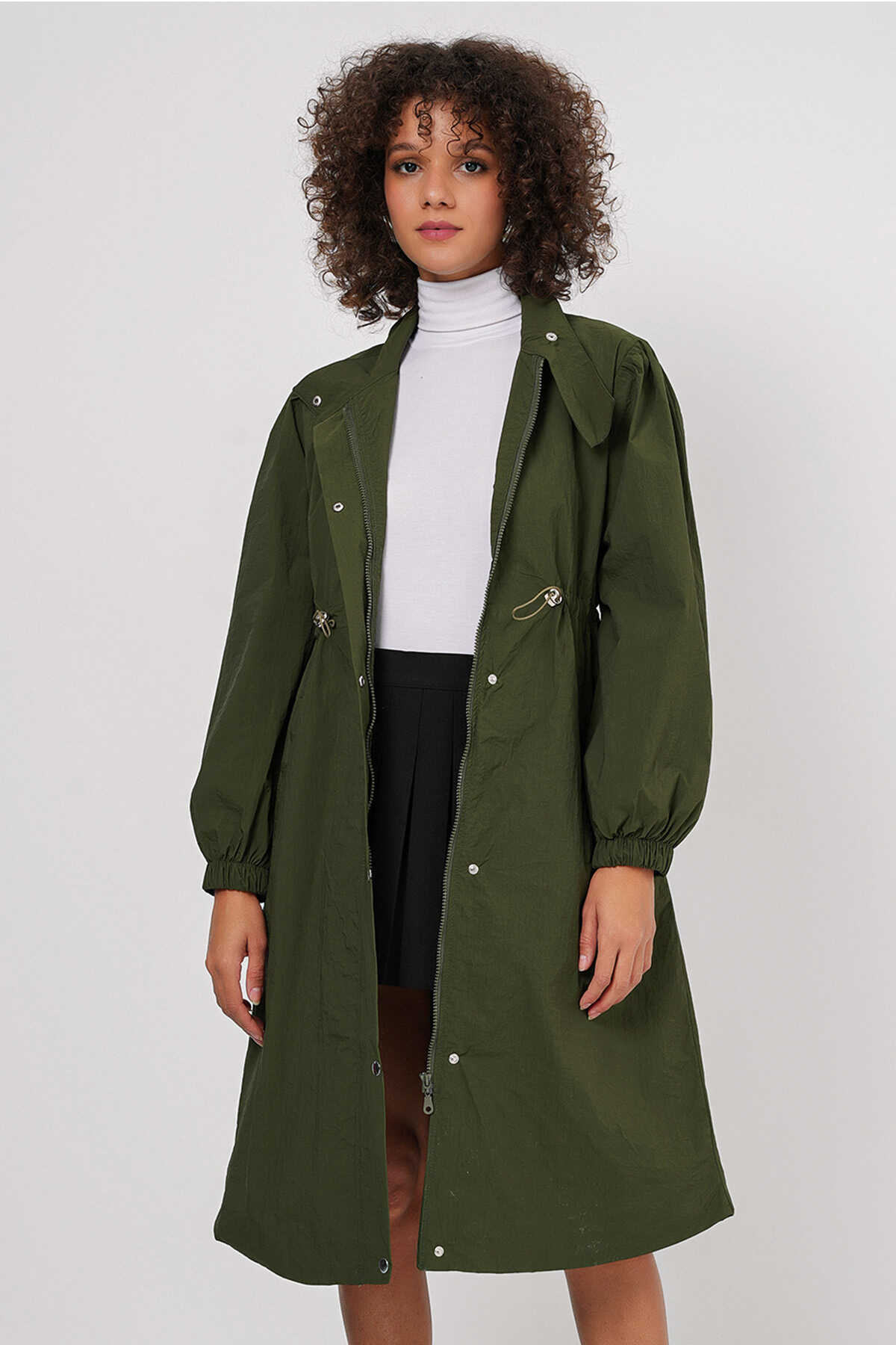 5939 Astarlı Uzun Trençkot - Haki - Kombin