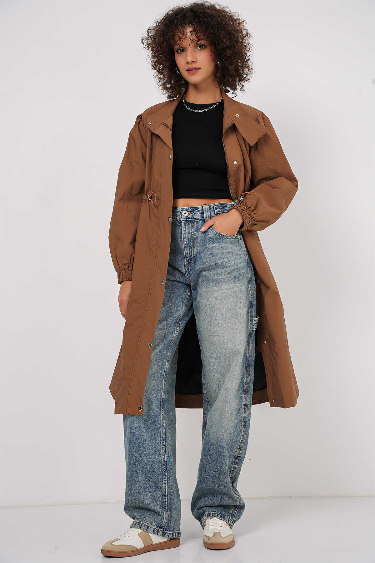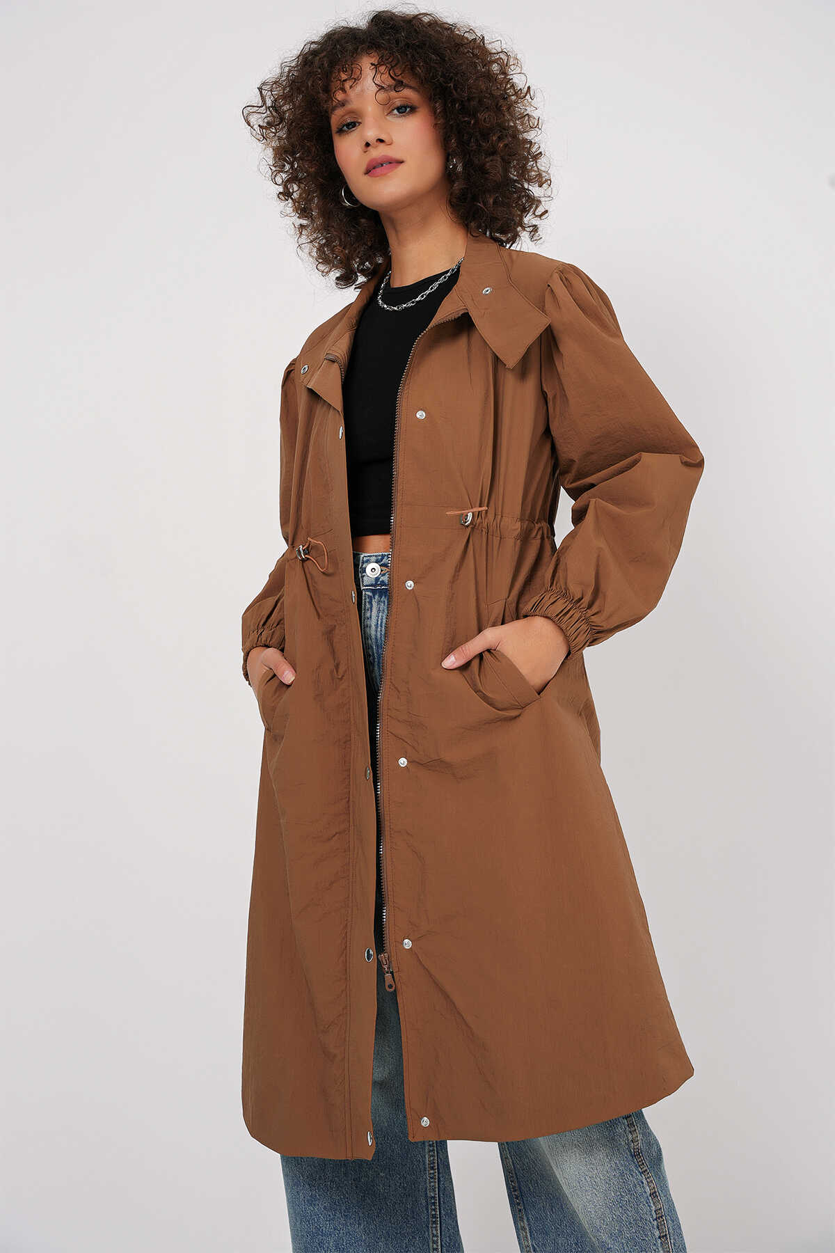 5939 Astarlı Uzun Trençkot - Taba - Kombin
