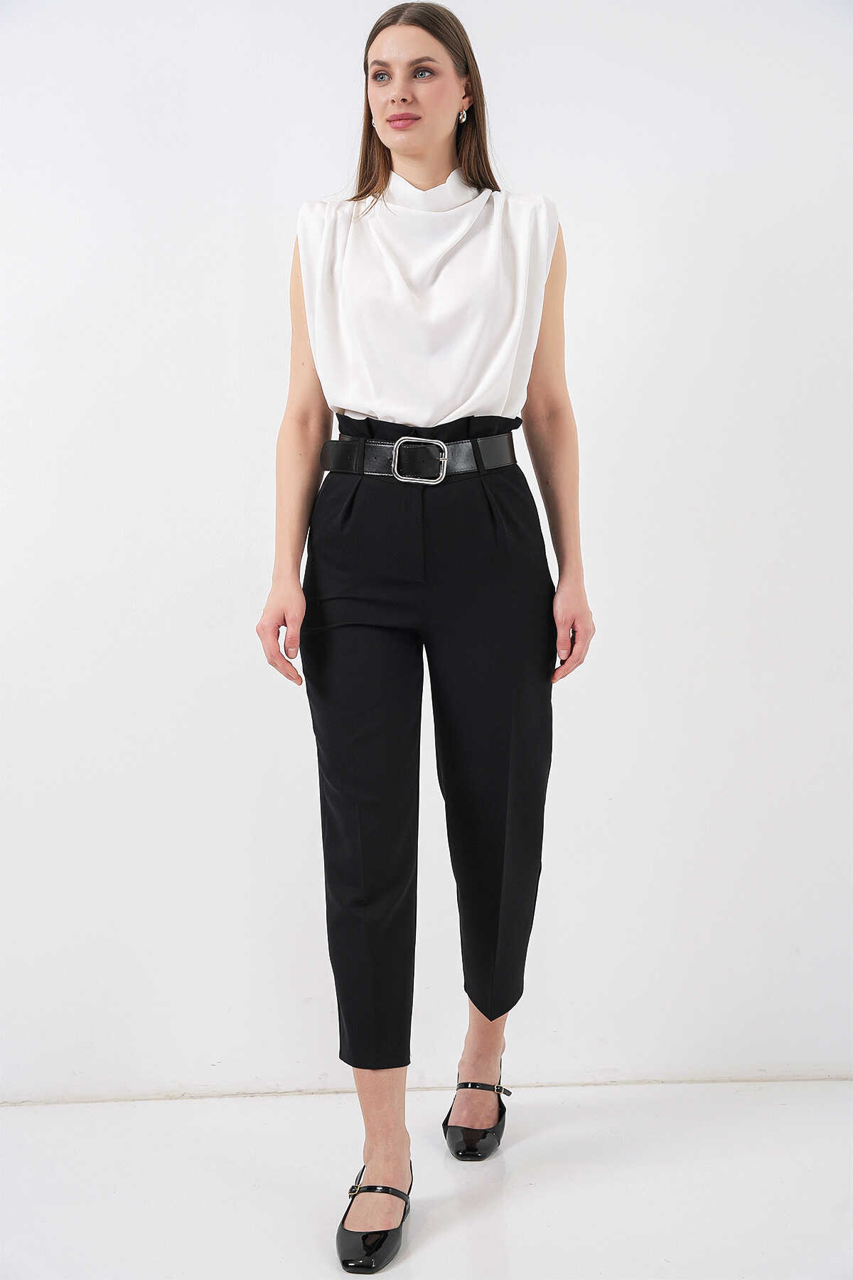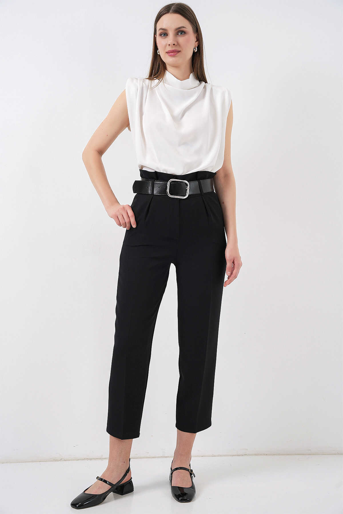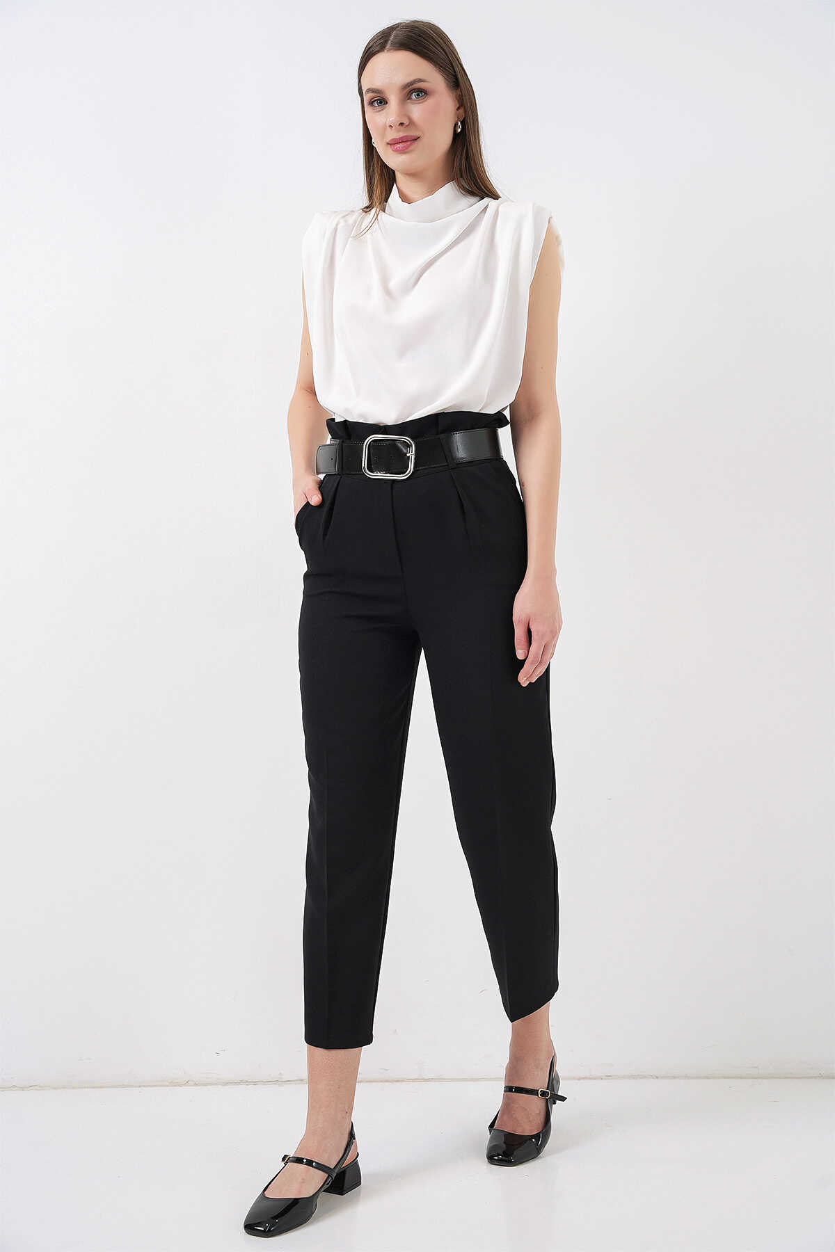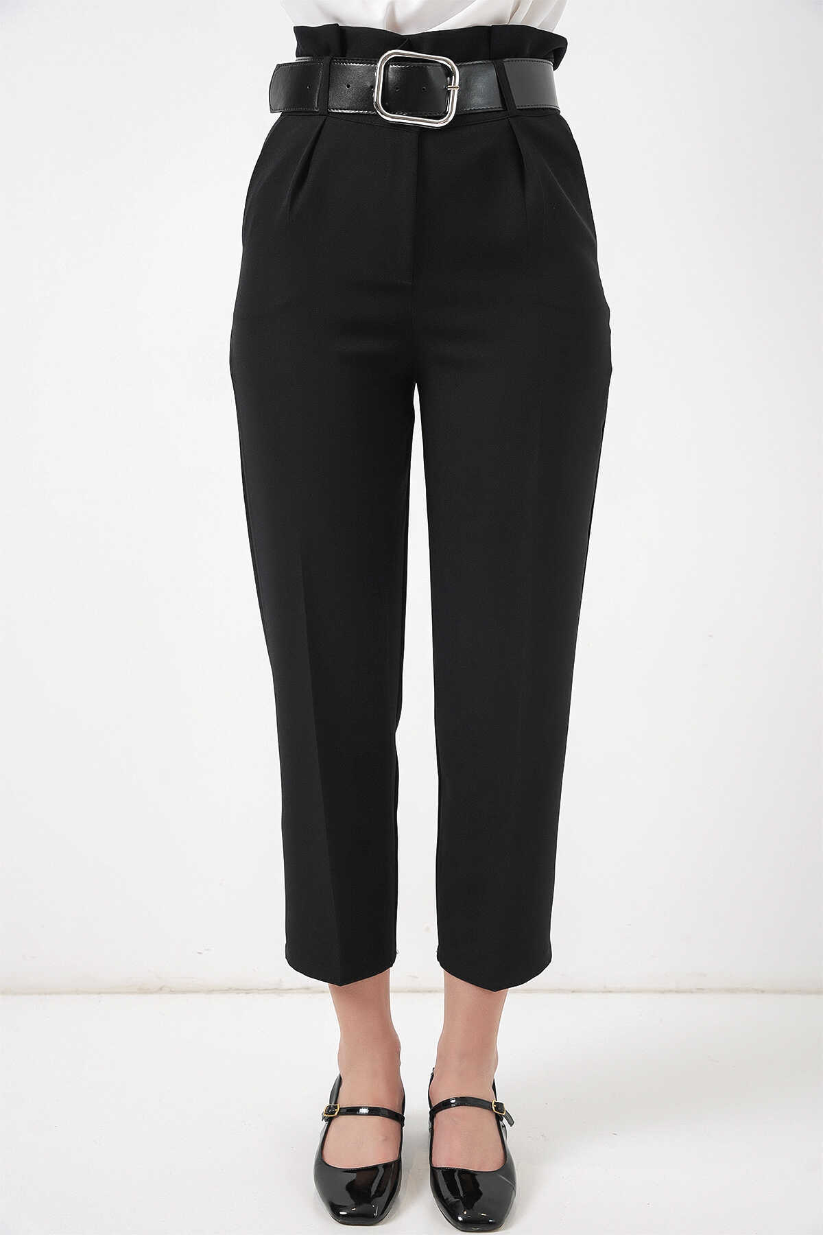 6556 Kemerli Kumaş Pantolon - Siyah - Kombin
