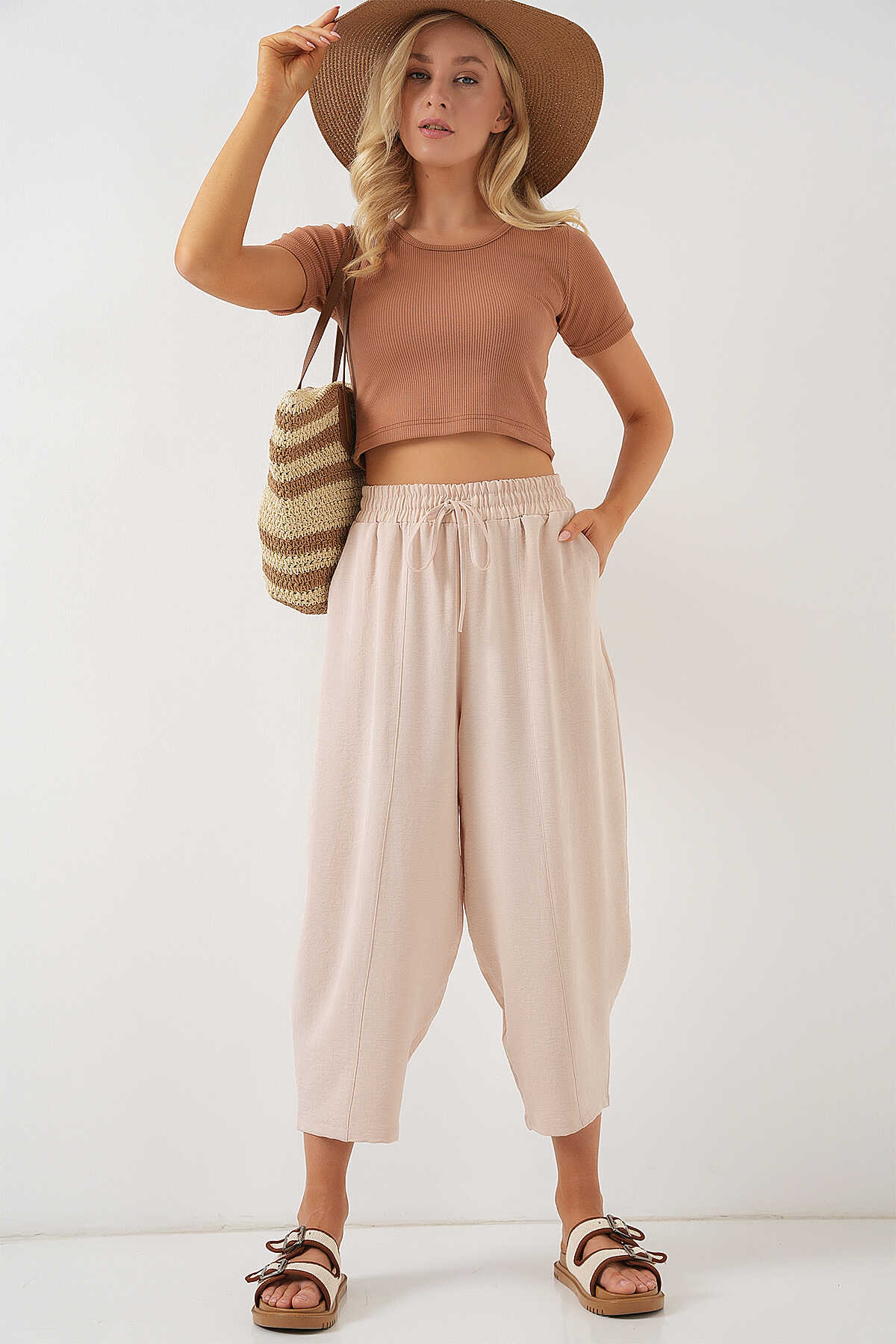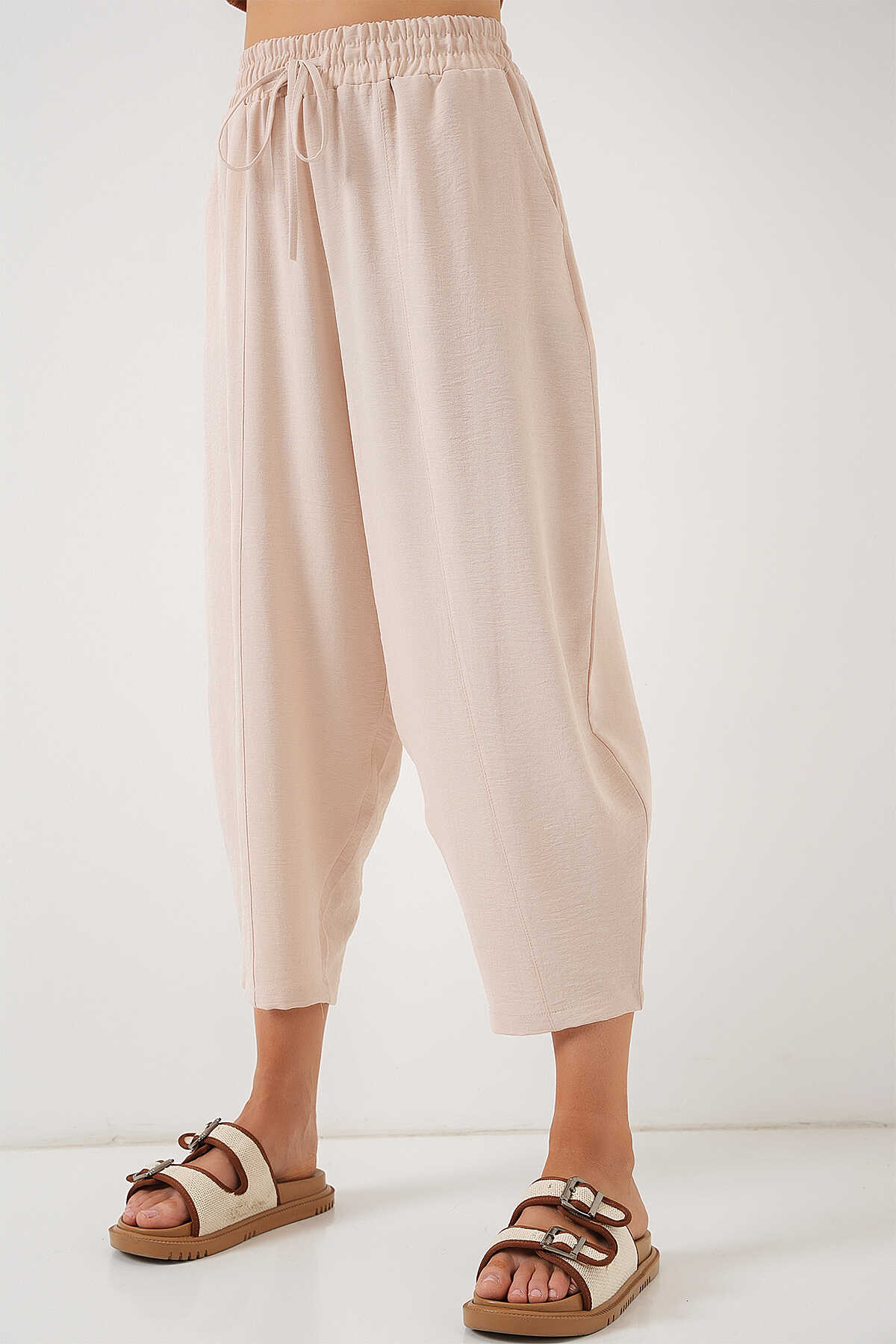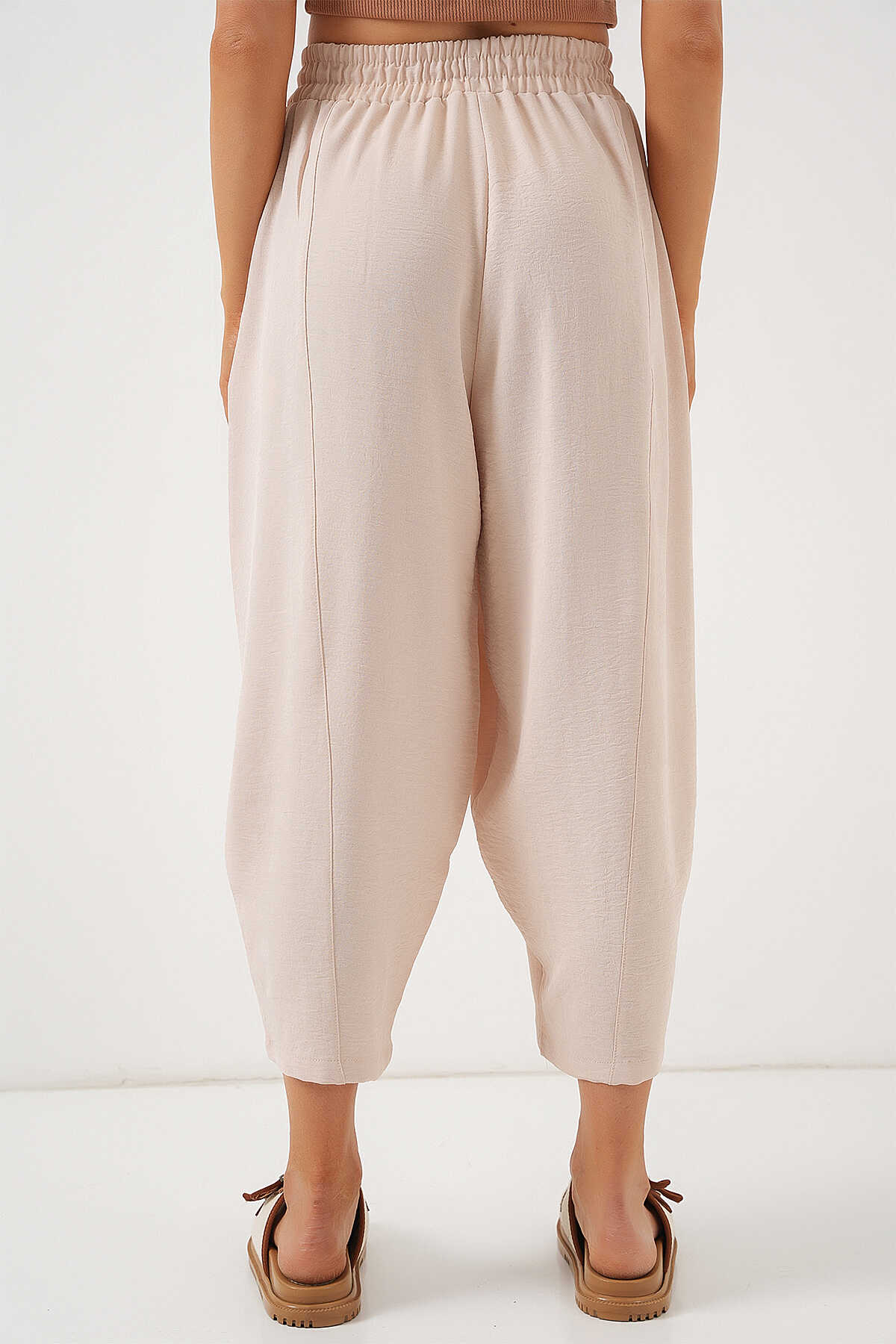 6591 Dokuma Şalvar Pantolon - Bisküvi - Kombin
