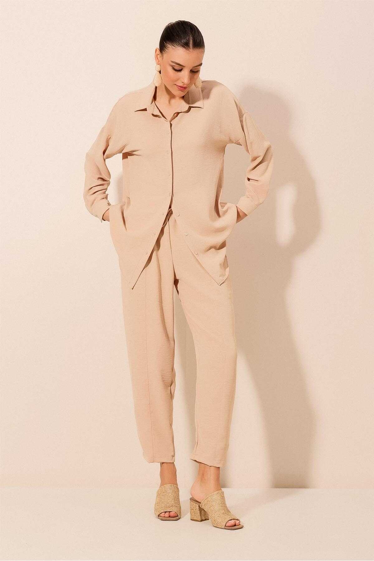 6593 Oversize İkili Takım - Bej - Kombin