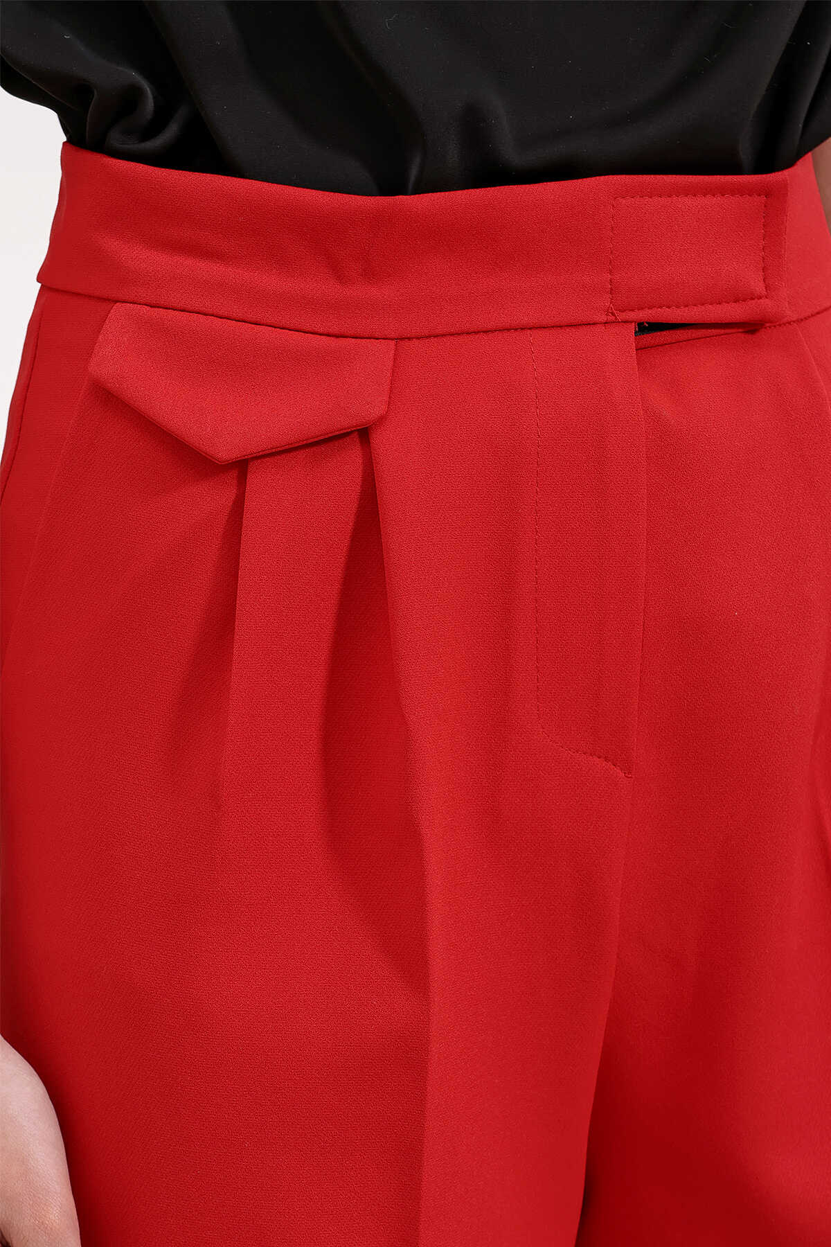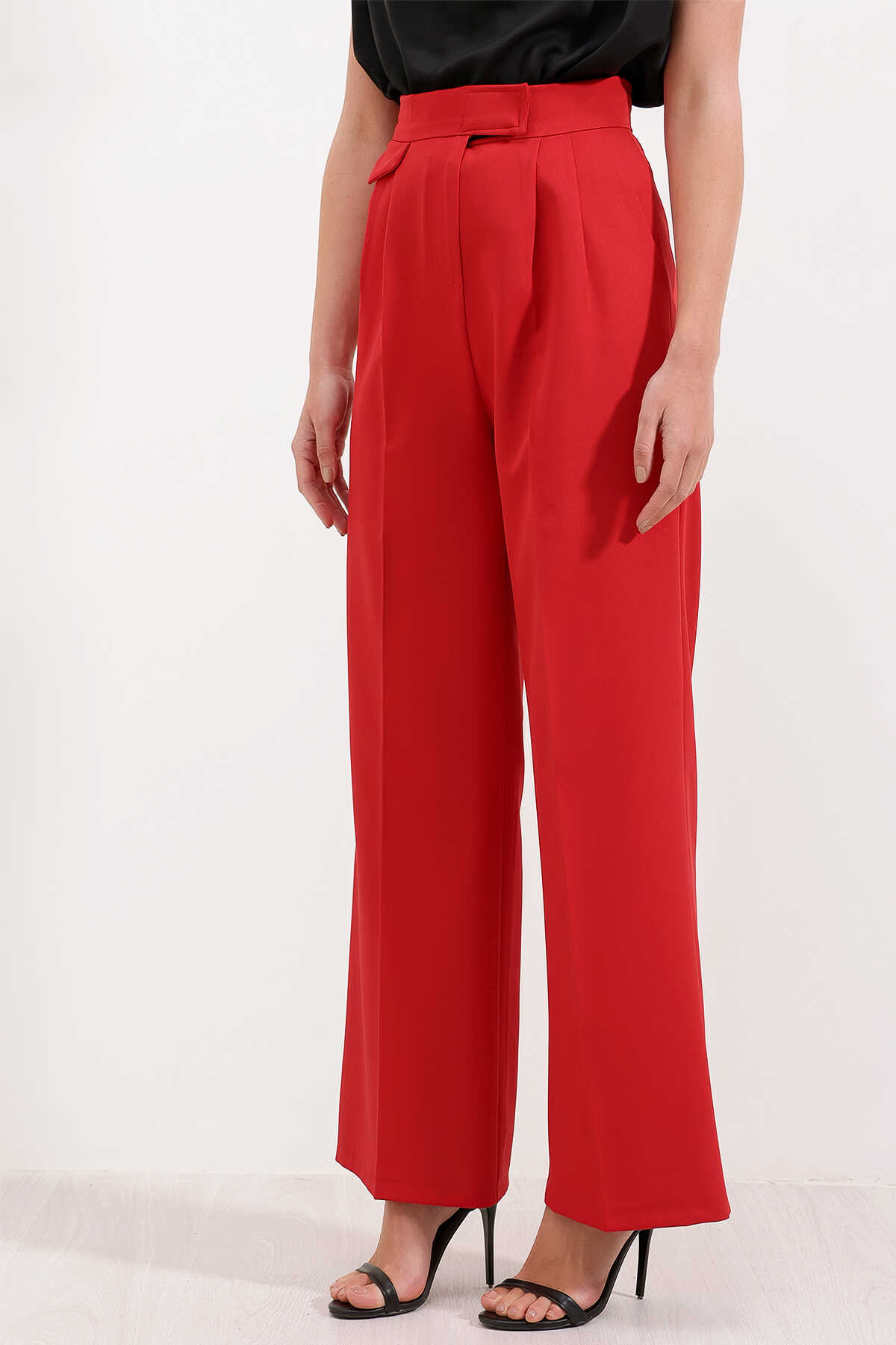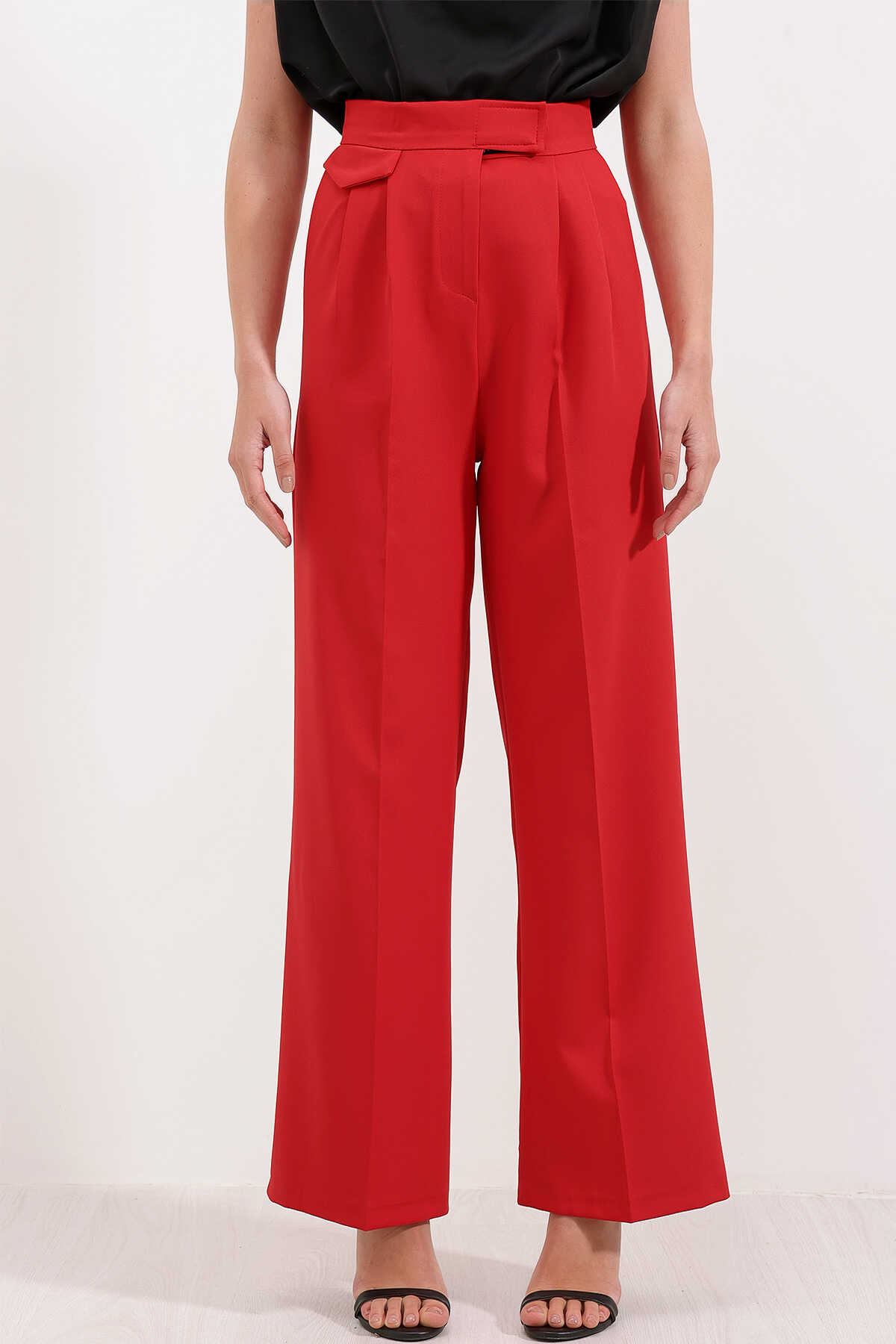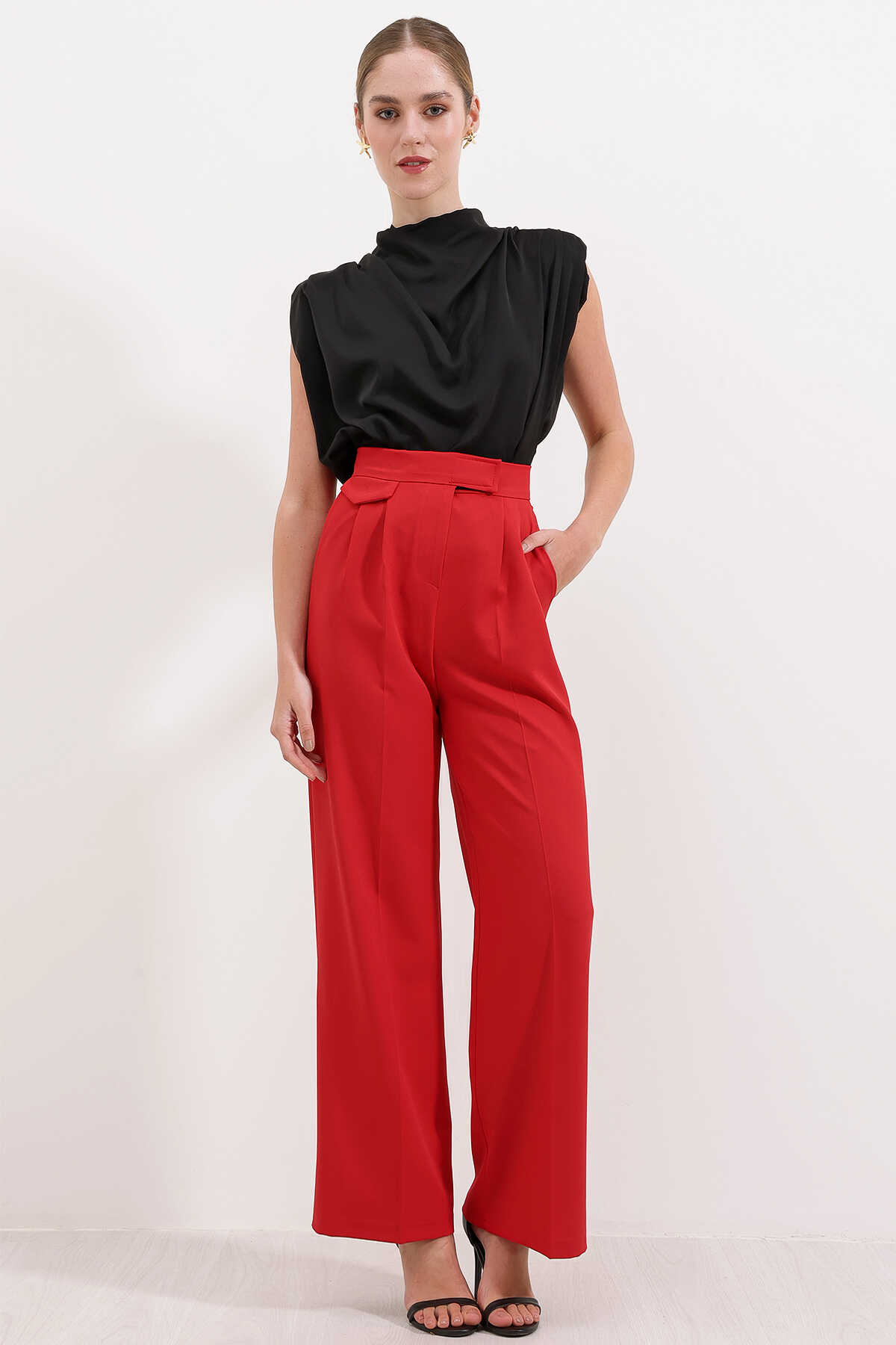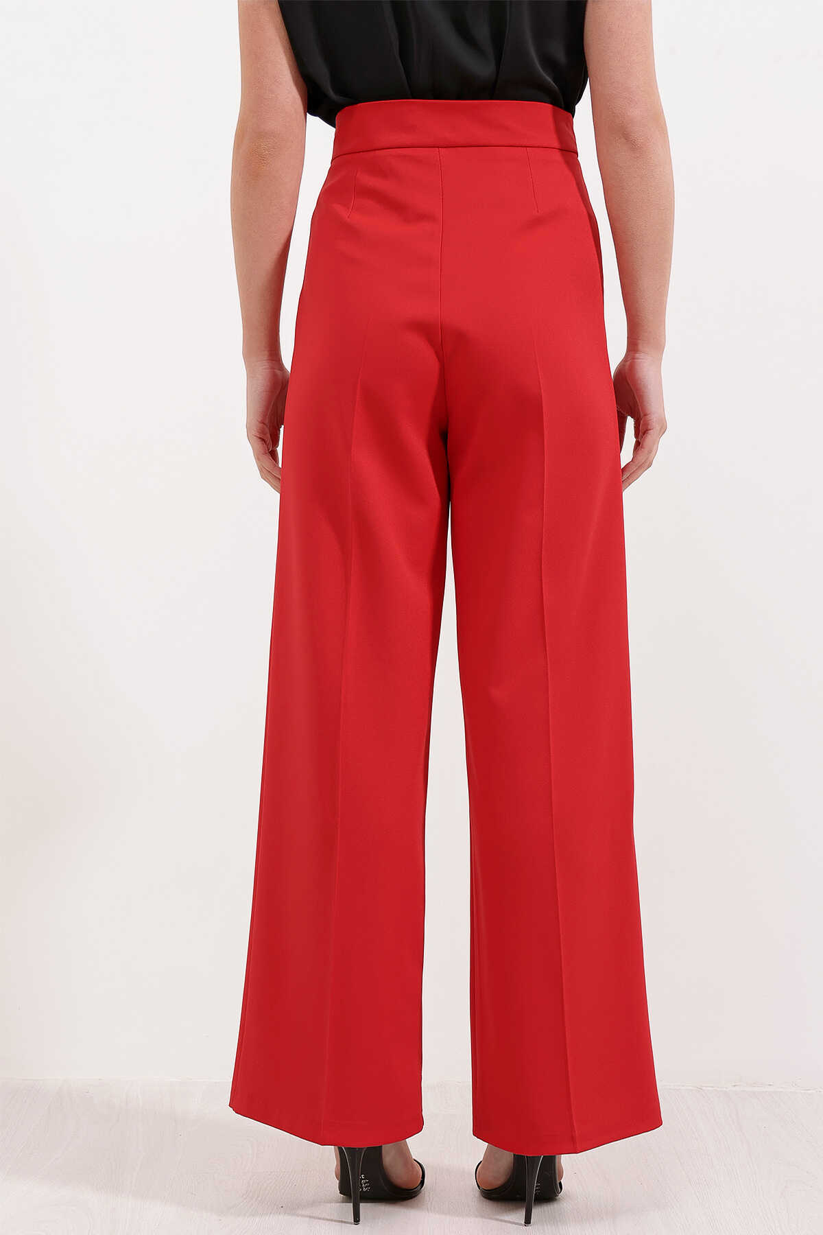 6645 Yüksek Bel Cırtlı Palazzo Pantolon - Kırmızı - Kombin