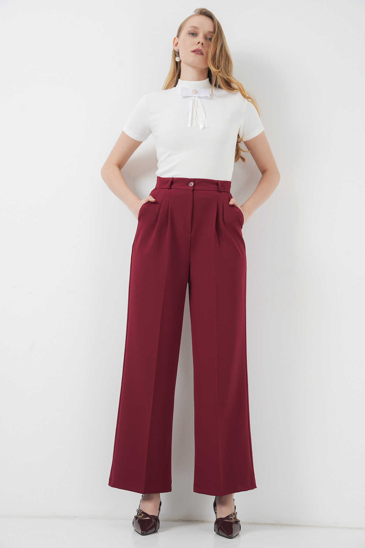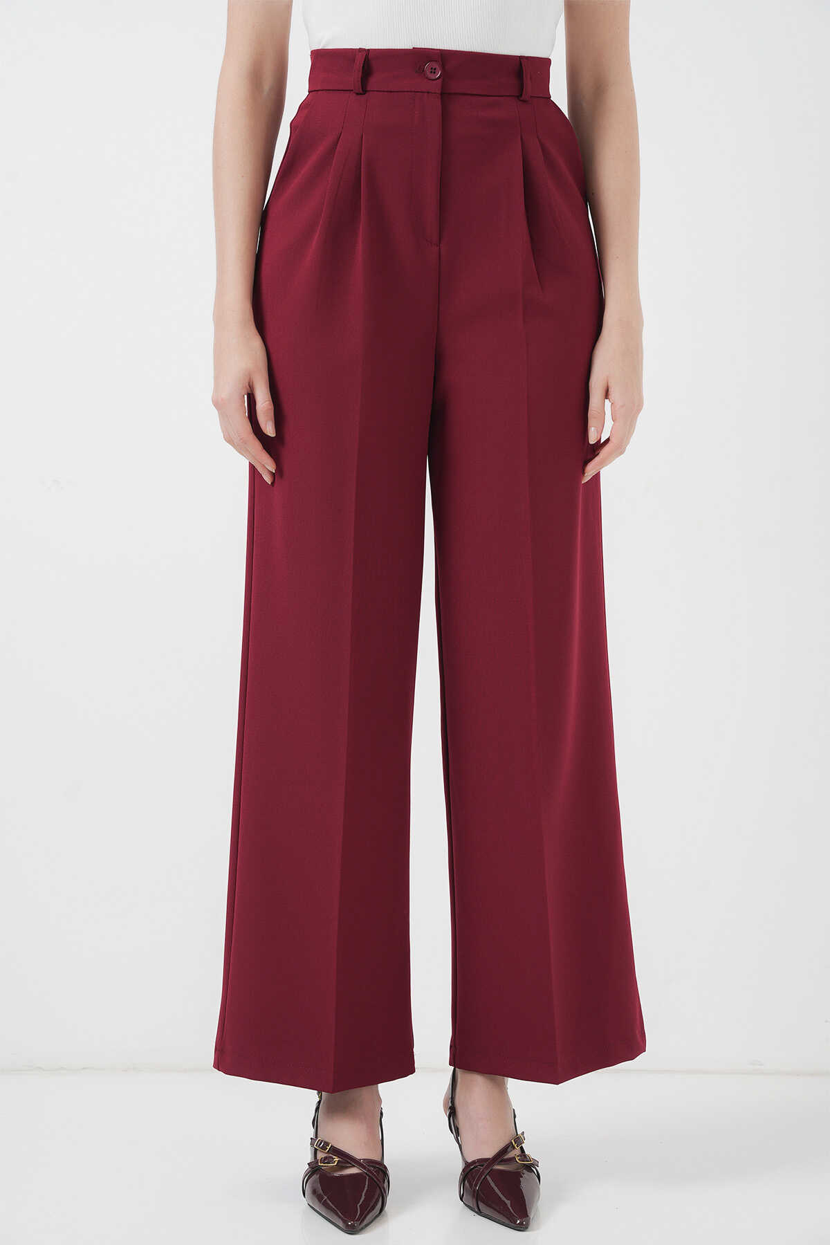 6647 Bol Paça Kumaş Pantolon - Bordo - Kombin
