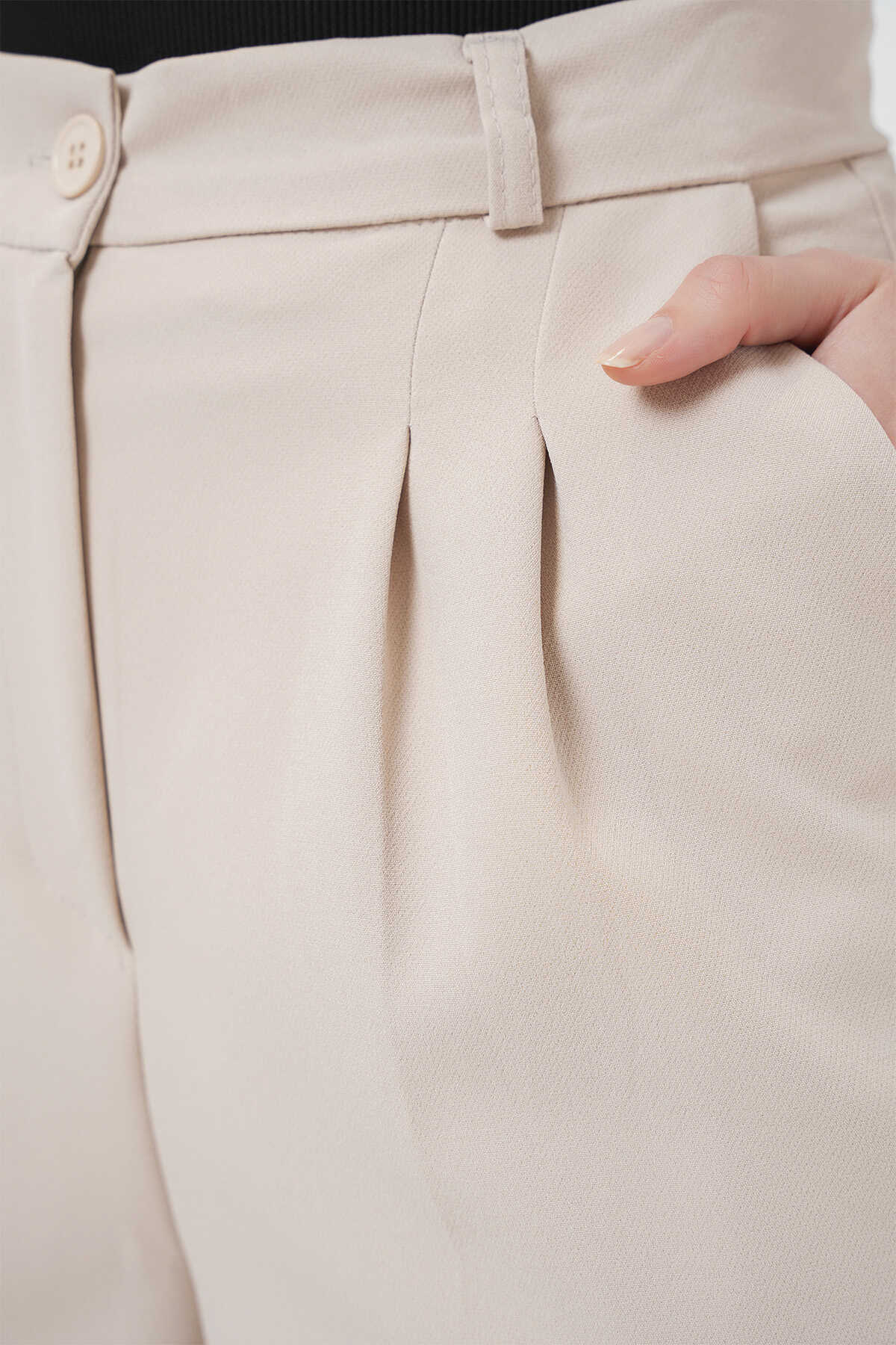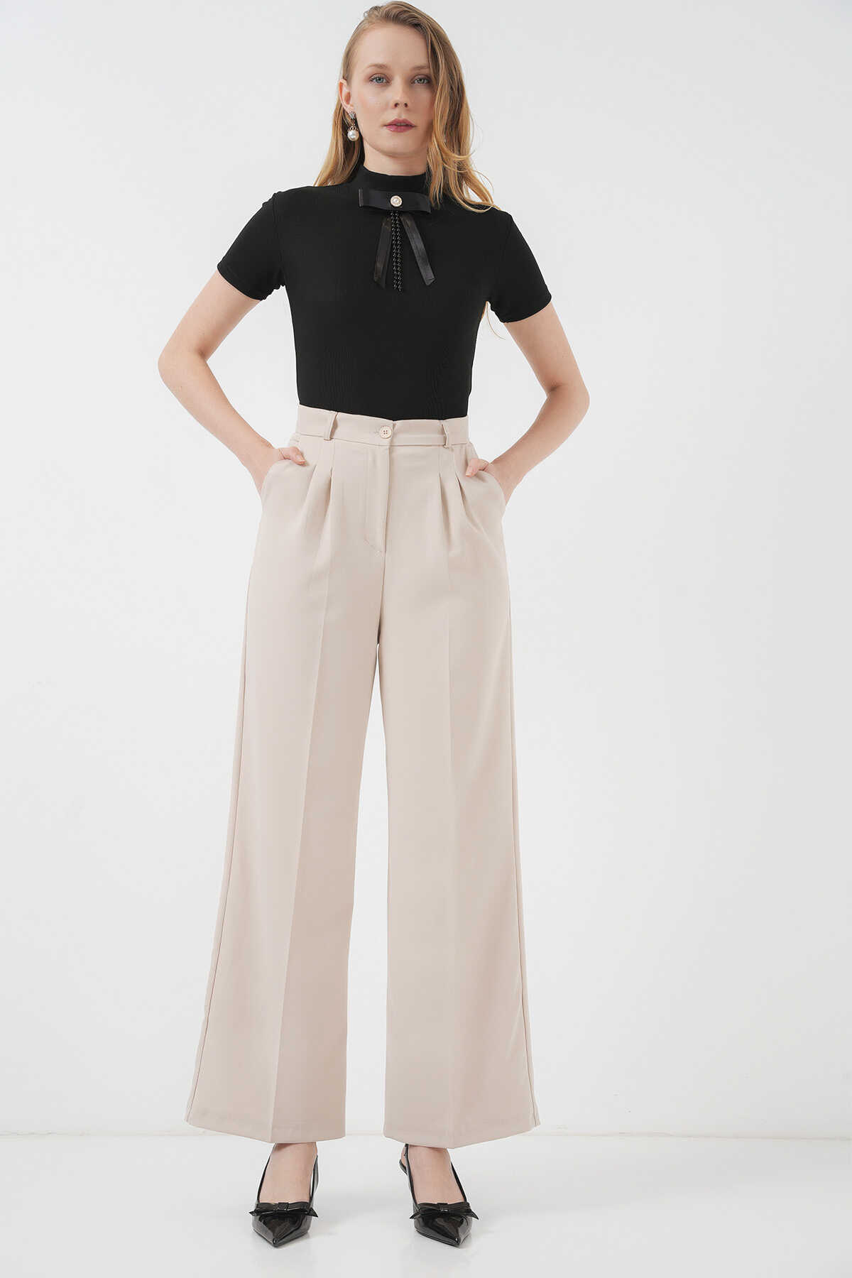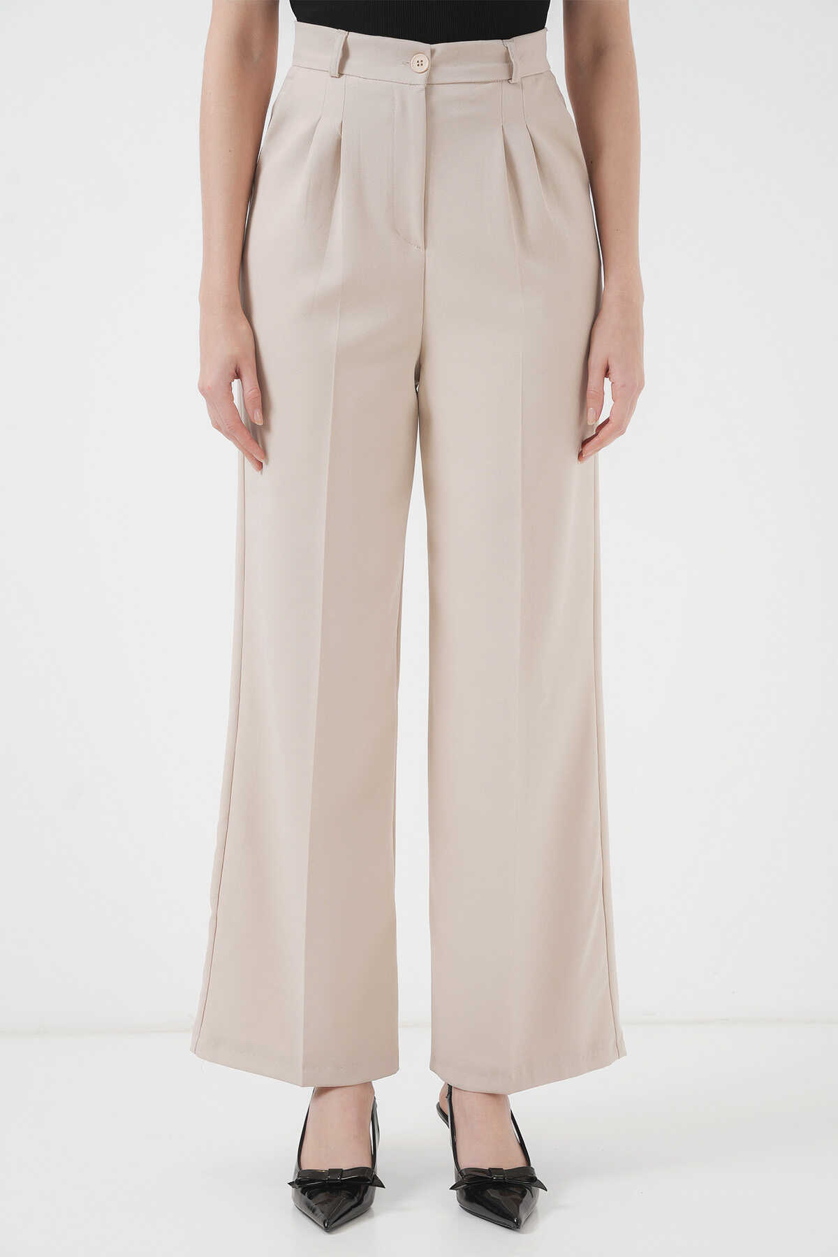 6647 Bol Paça Kumaş Pantolon - Krem - Kombin