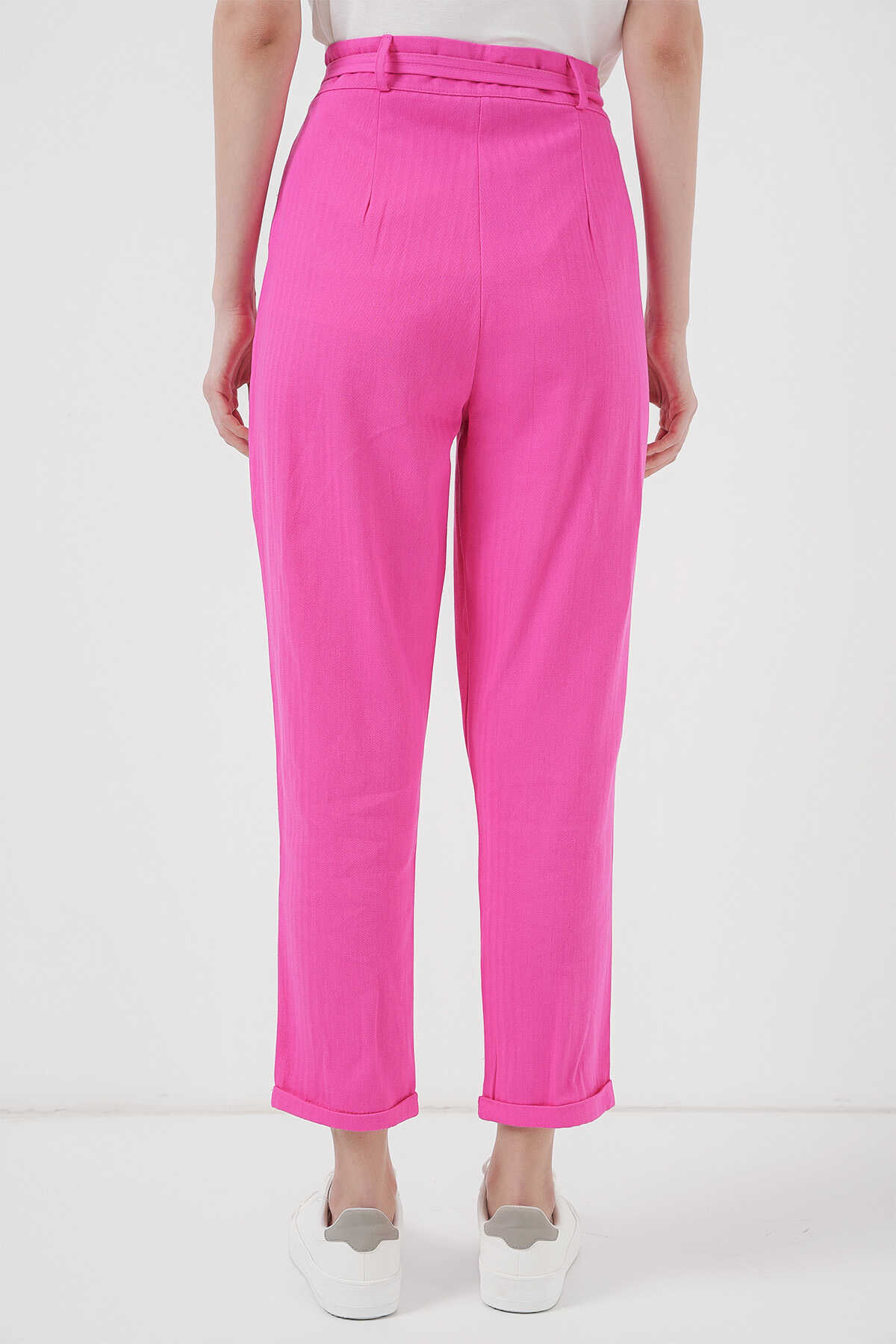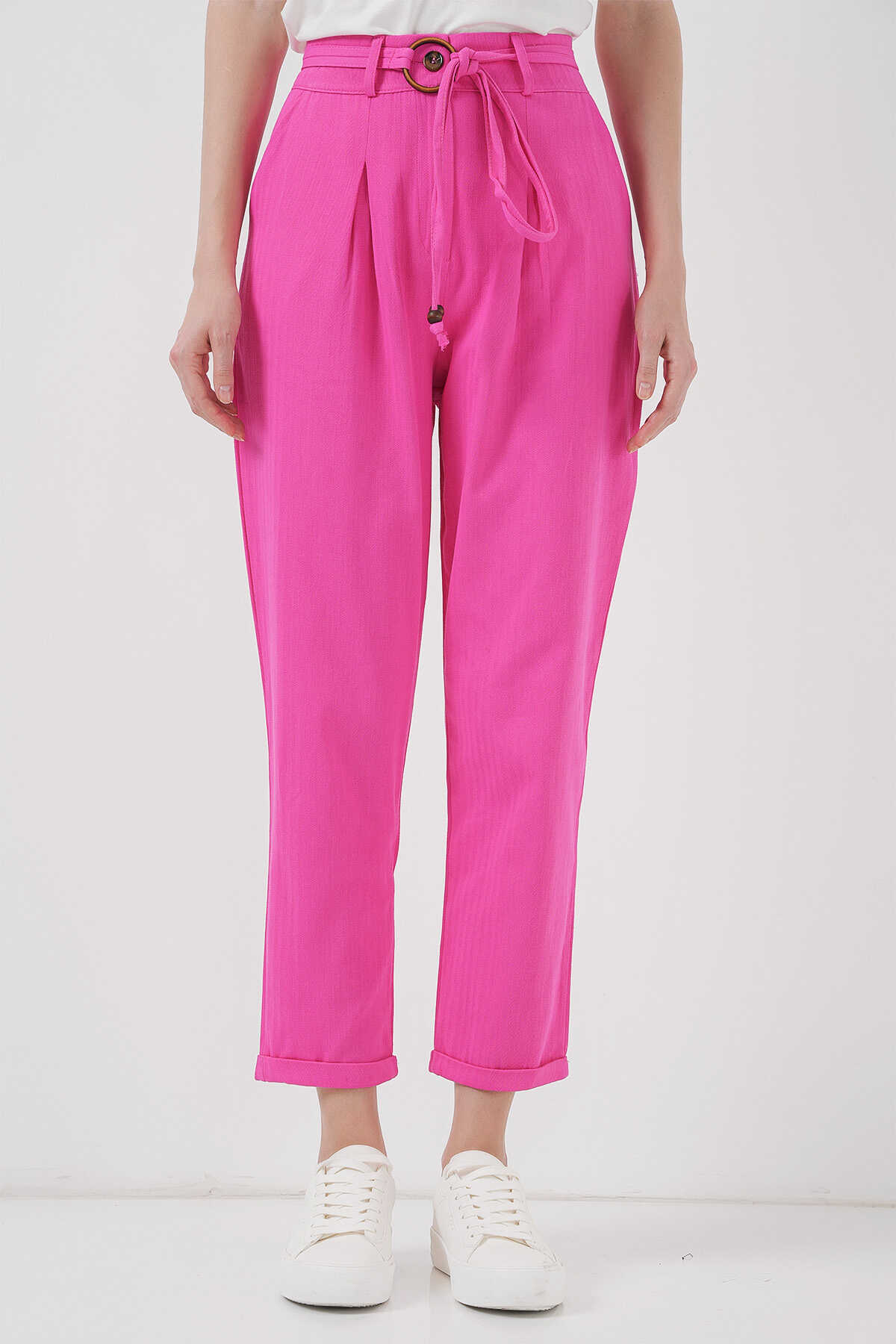 6660 Kemerli Keten Pantolon - Fuşya - Kombin