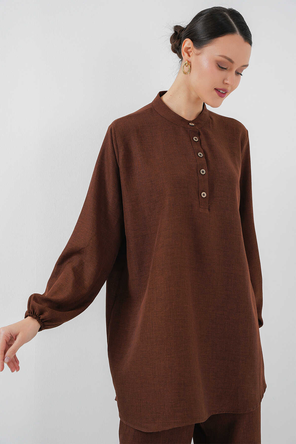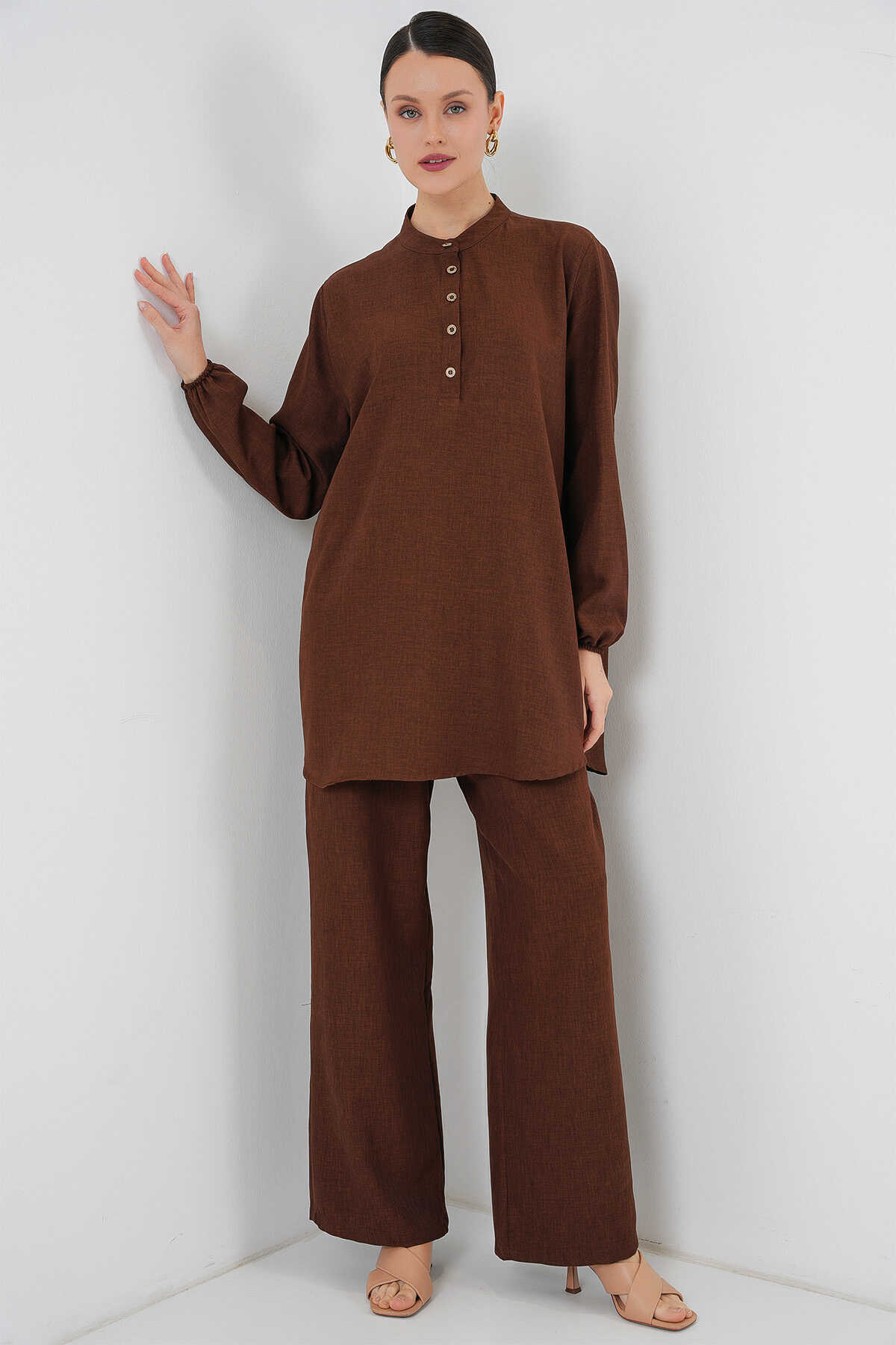 6678 Keten Tunik Pantolon İkili Takım - Kahverengi - Kombin