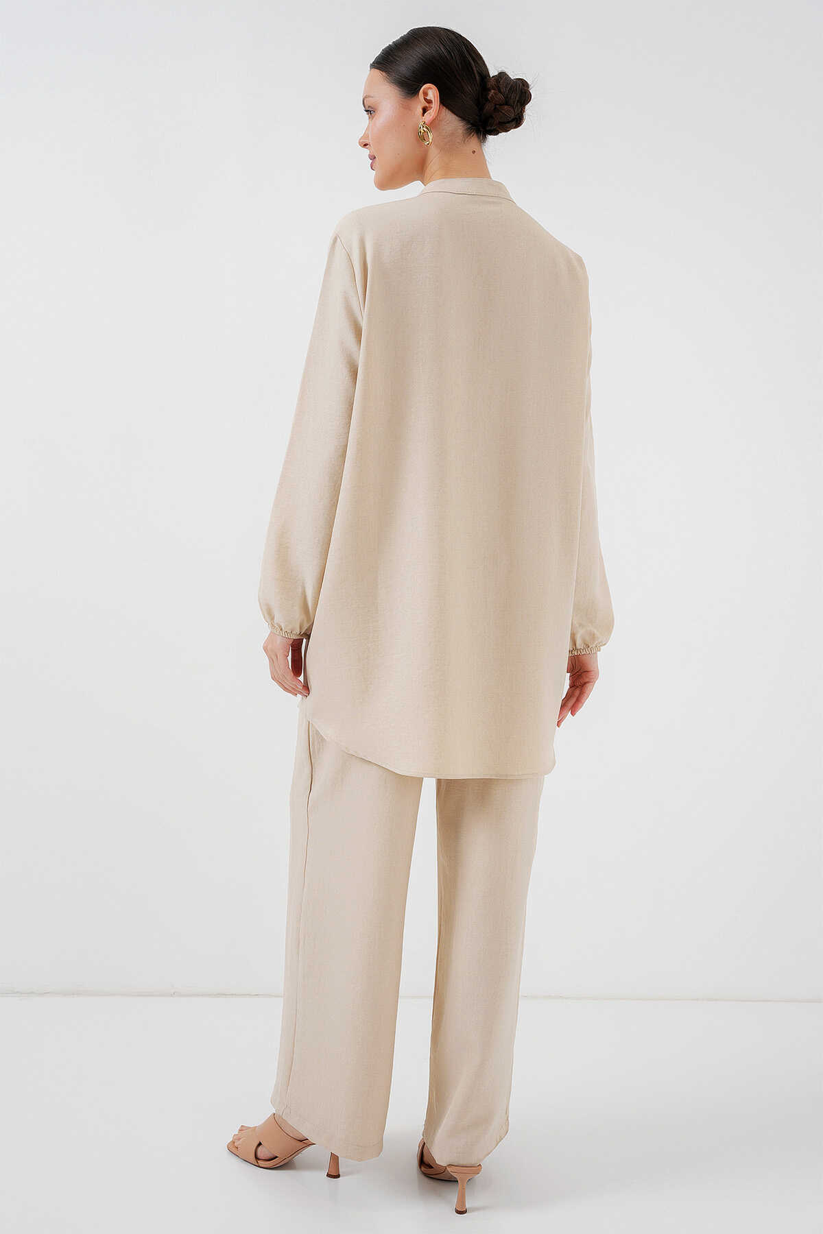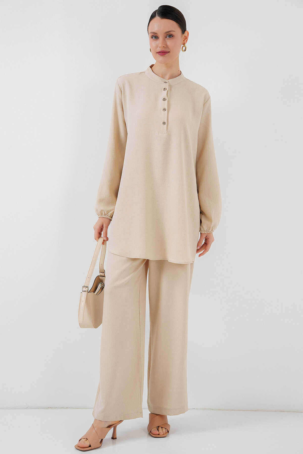 6678 Keten Tunik Pantolon İkili Takım - Krem - Kombin
