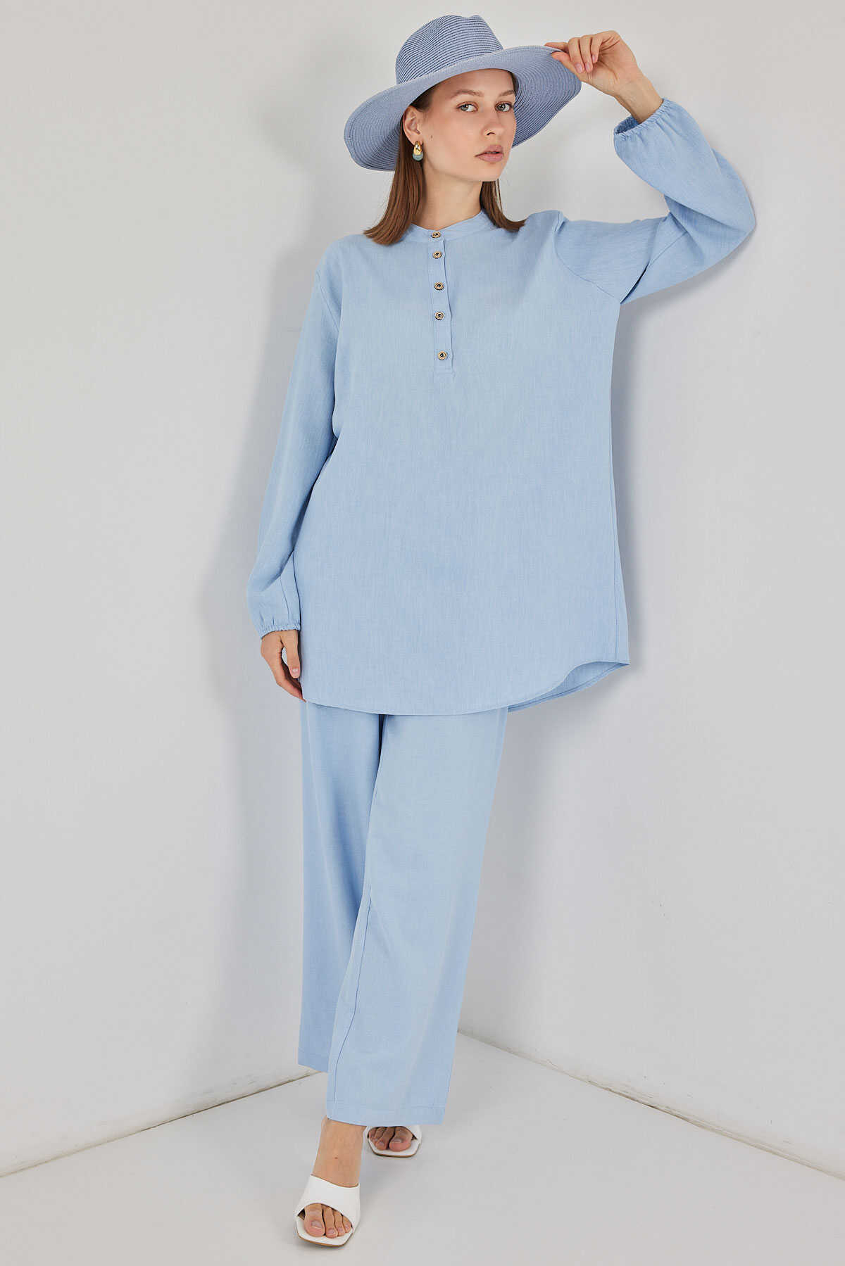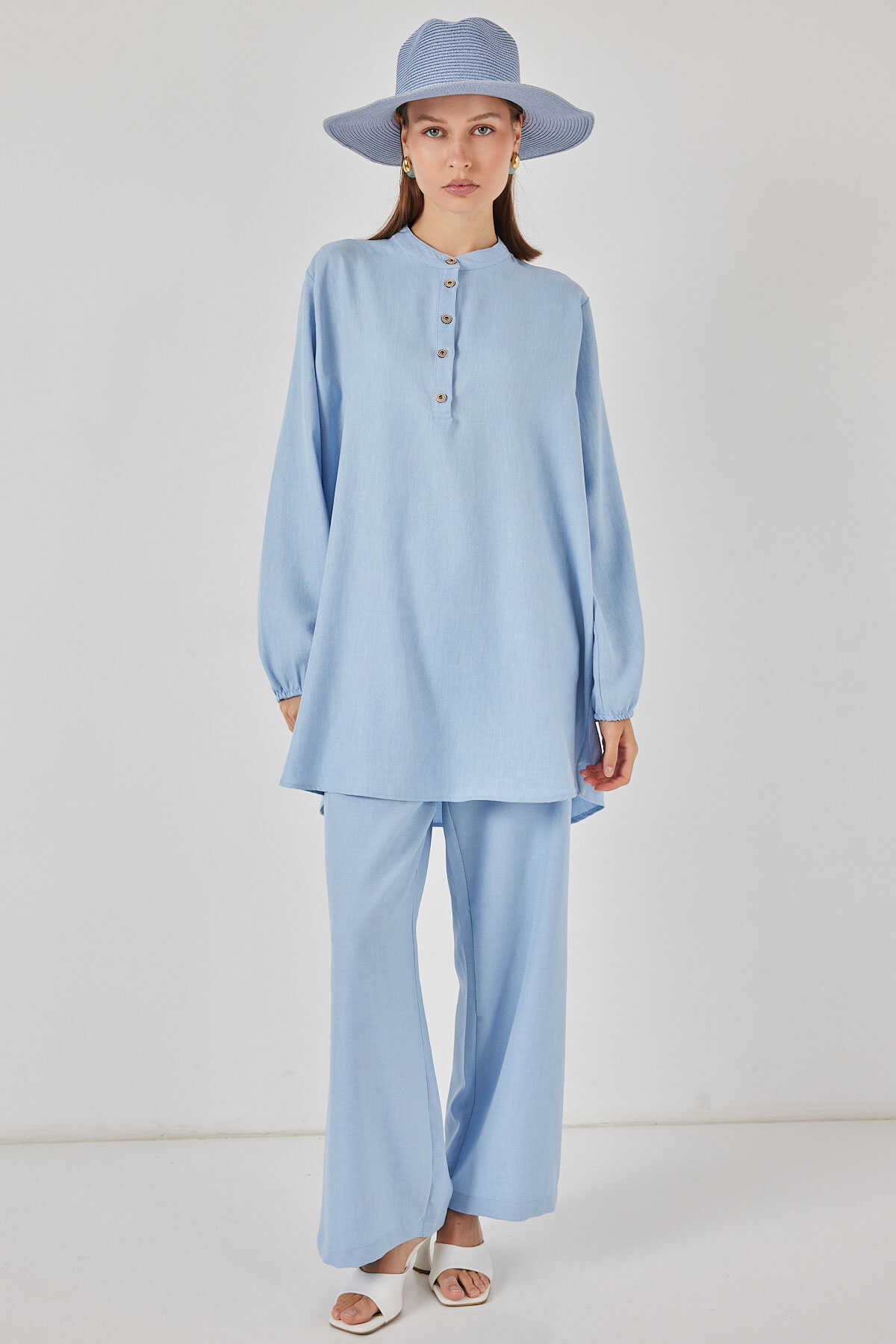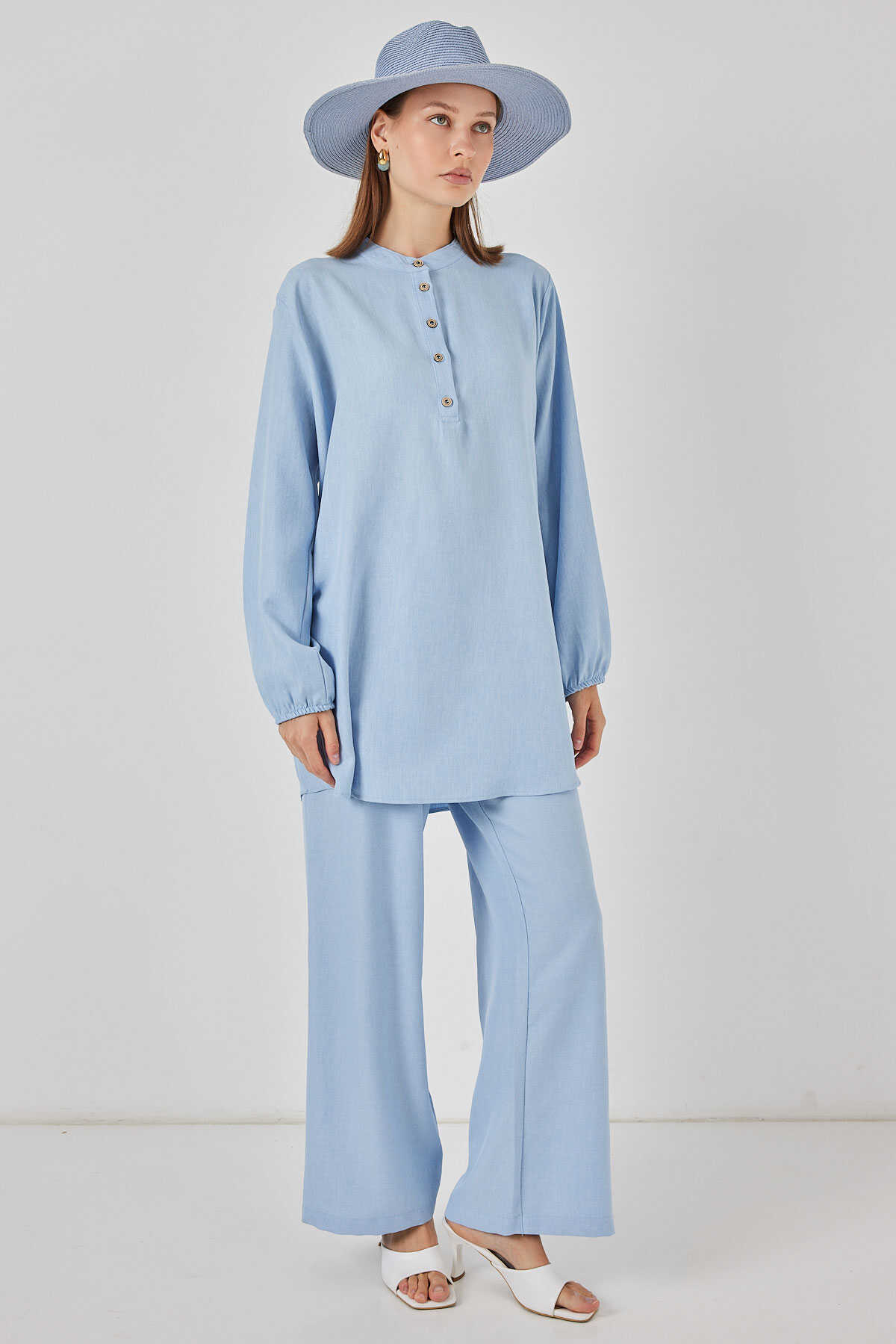 6678 Keten Tunik Pantolon İkili Takım - Mavi - Kombin