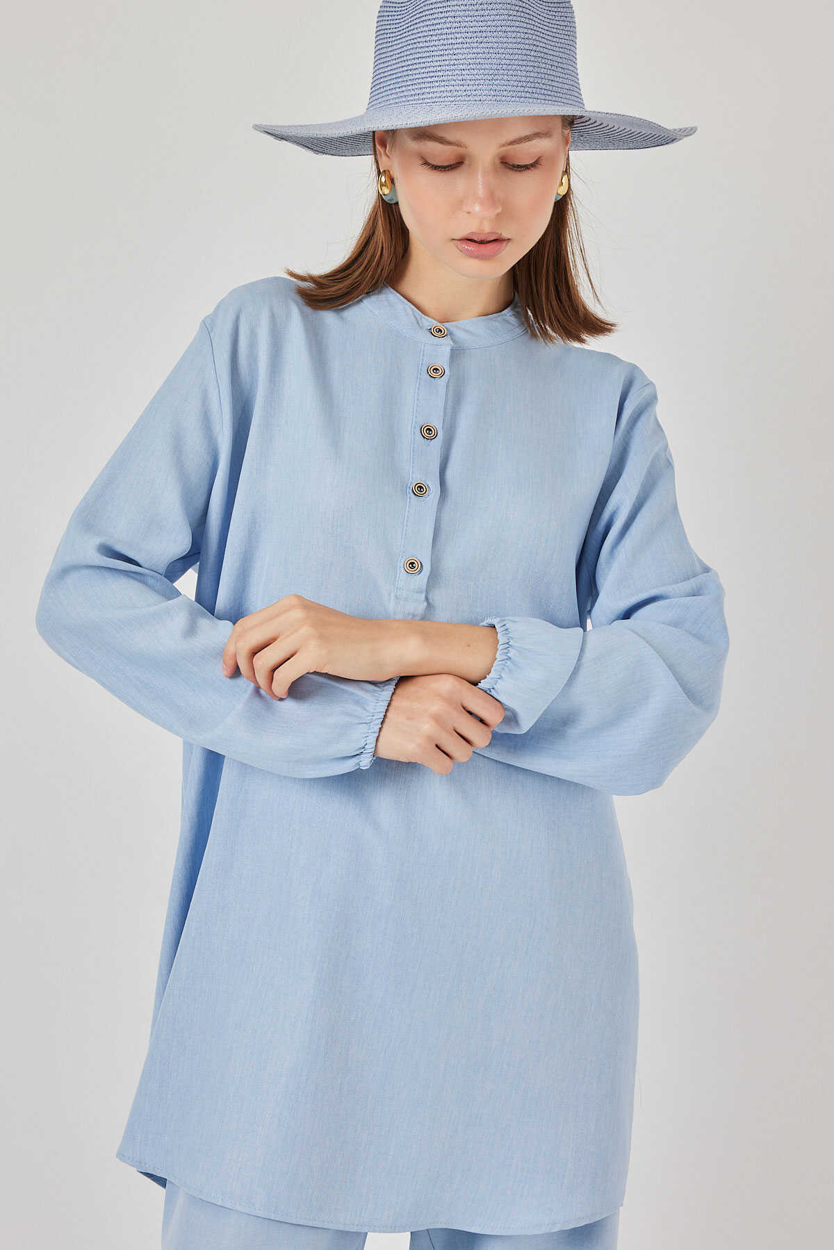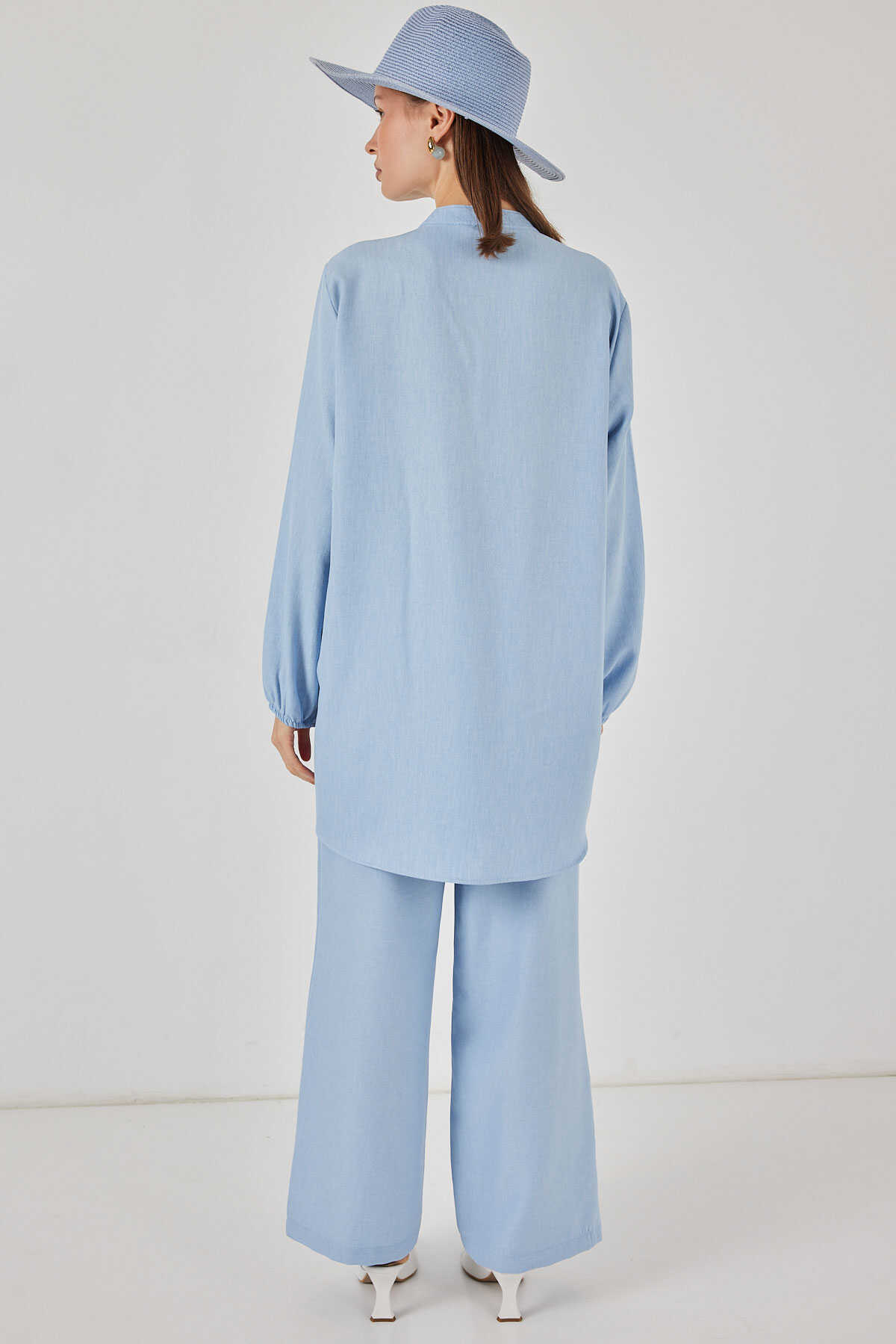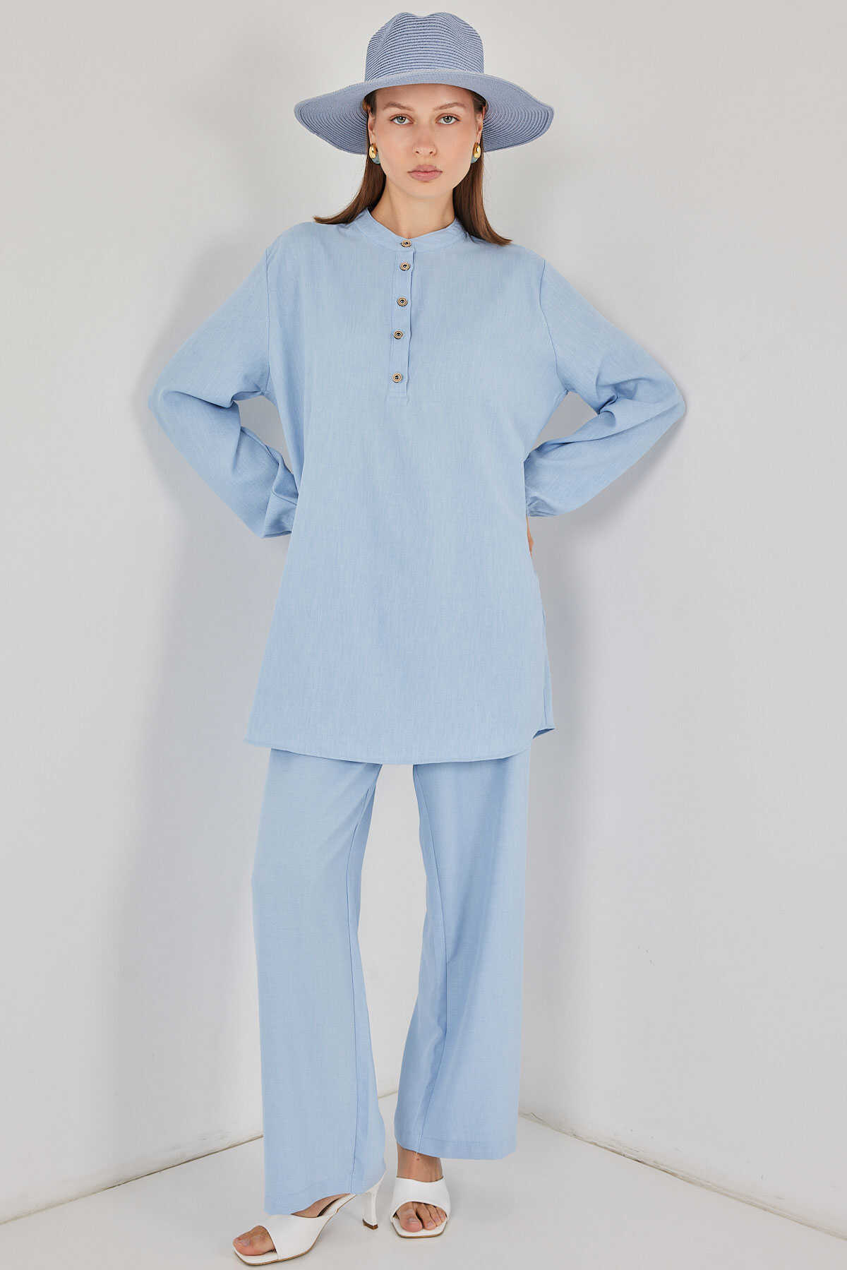6678 Keten Tunik Pantolon İkili Takım - Mavi - Kombin
