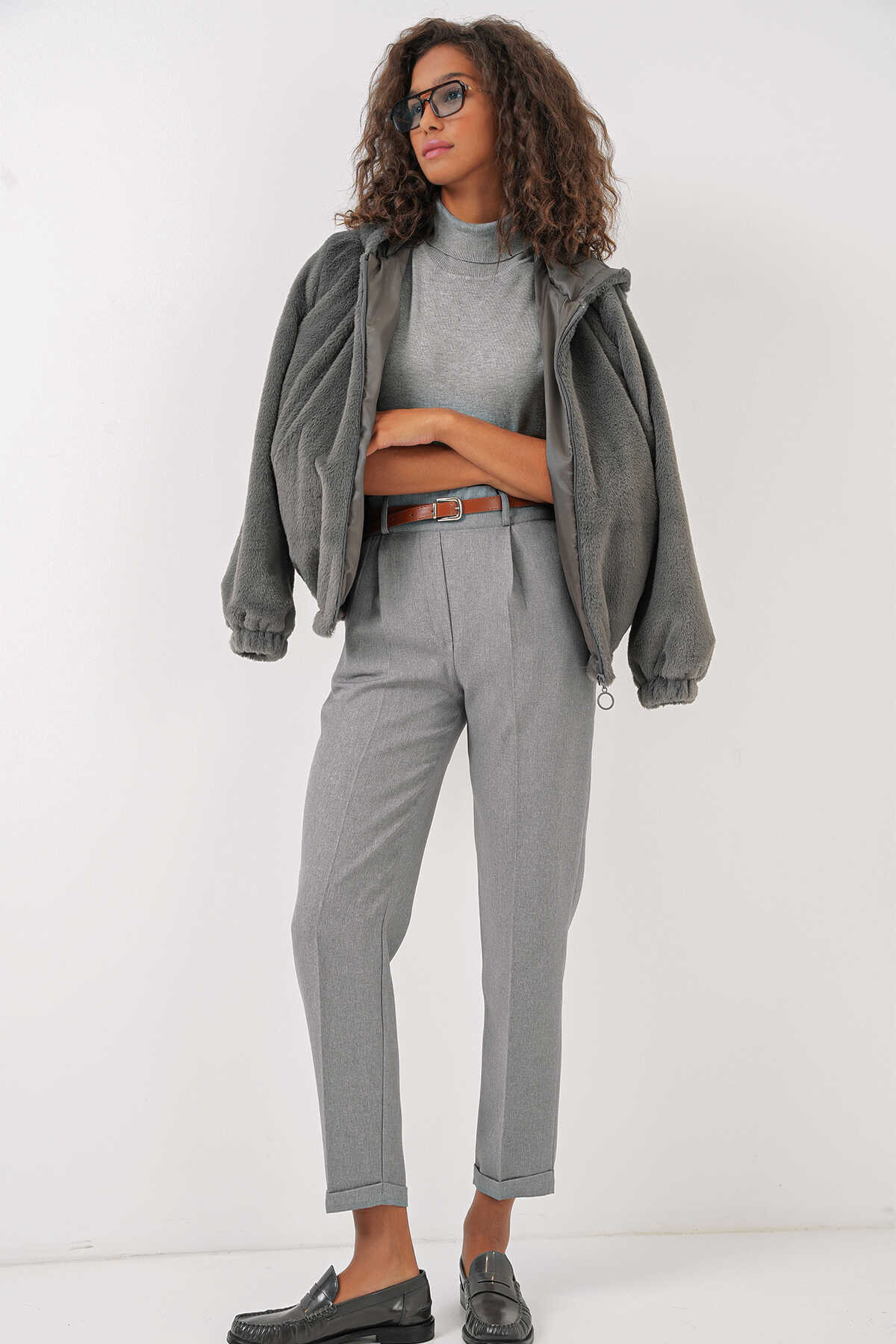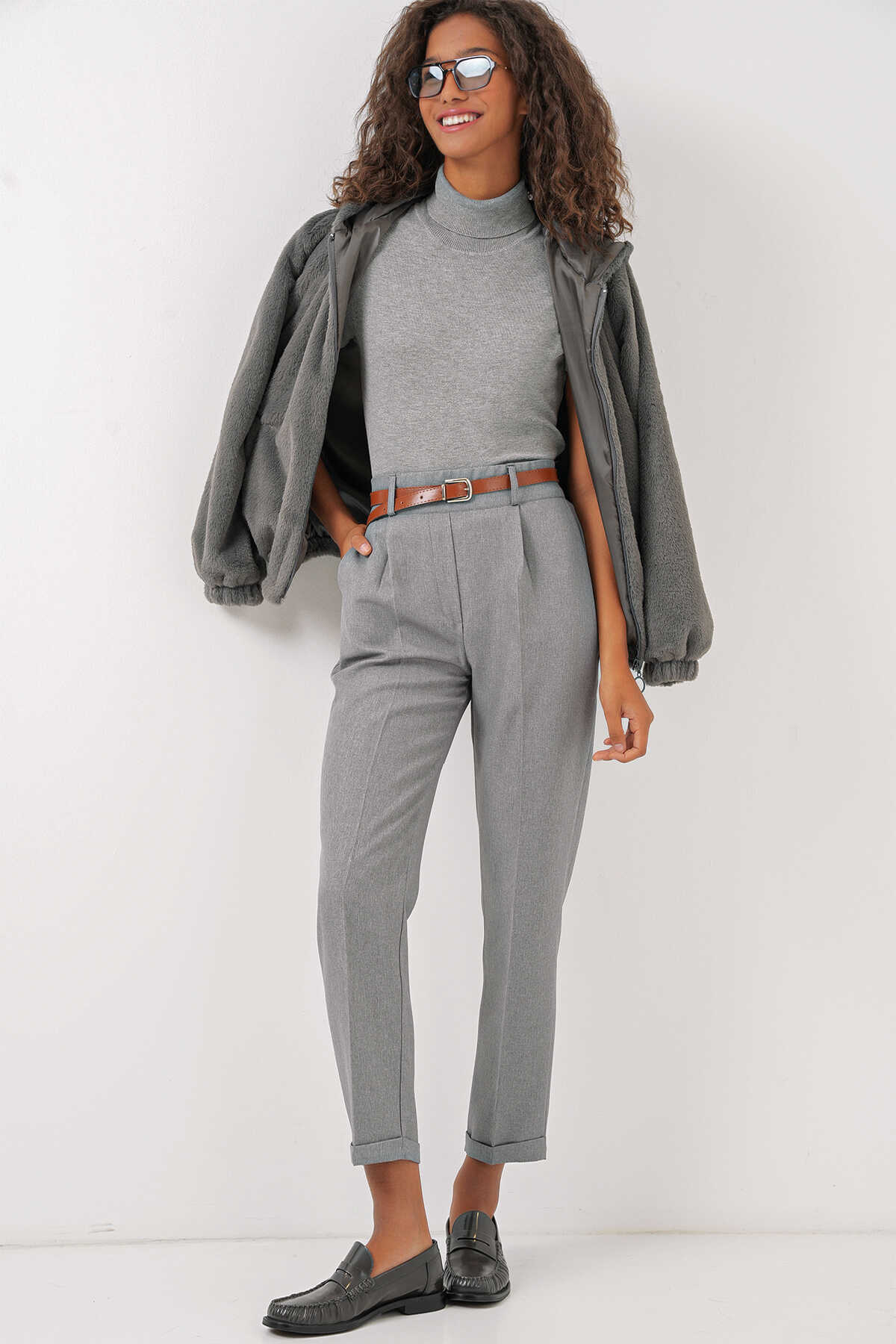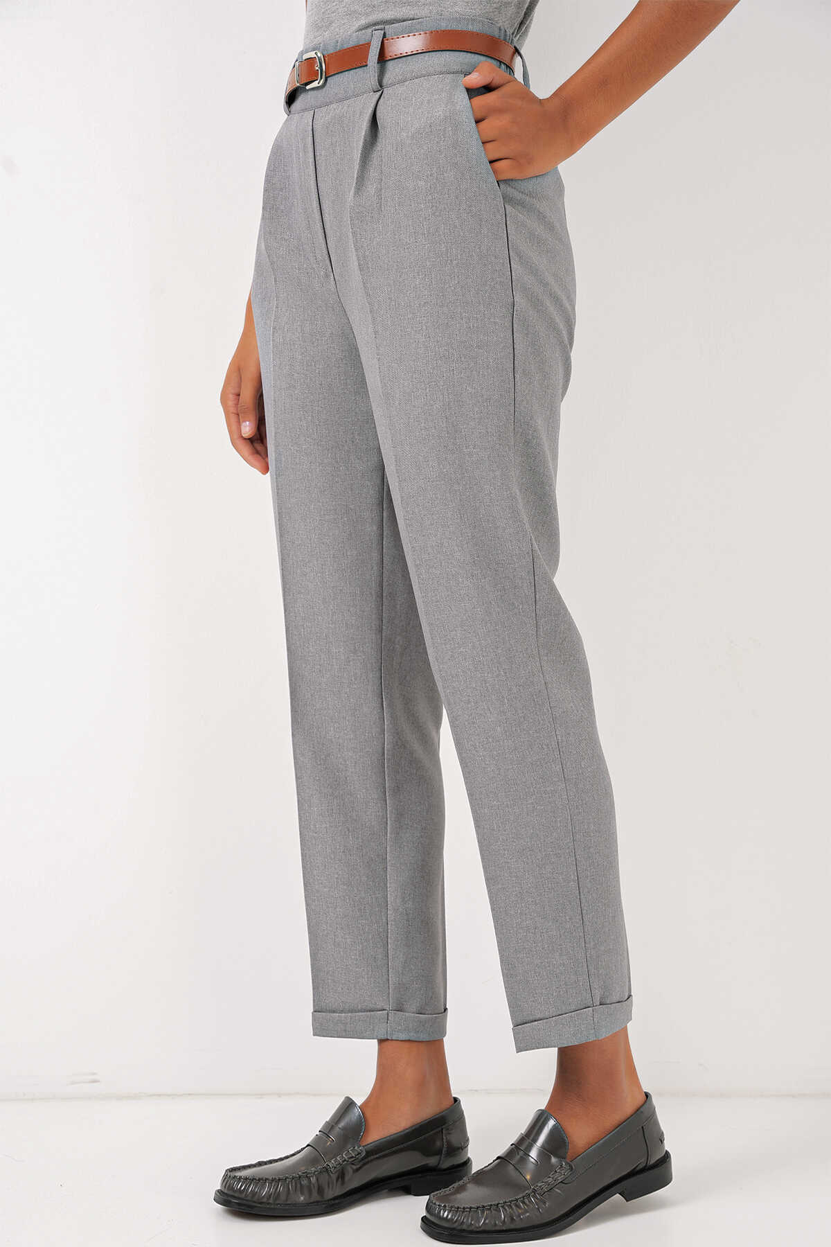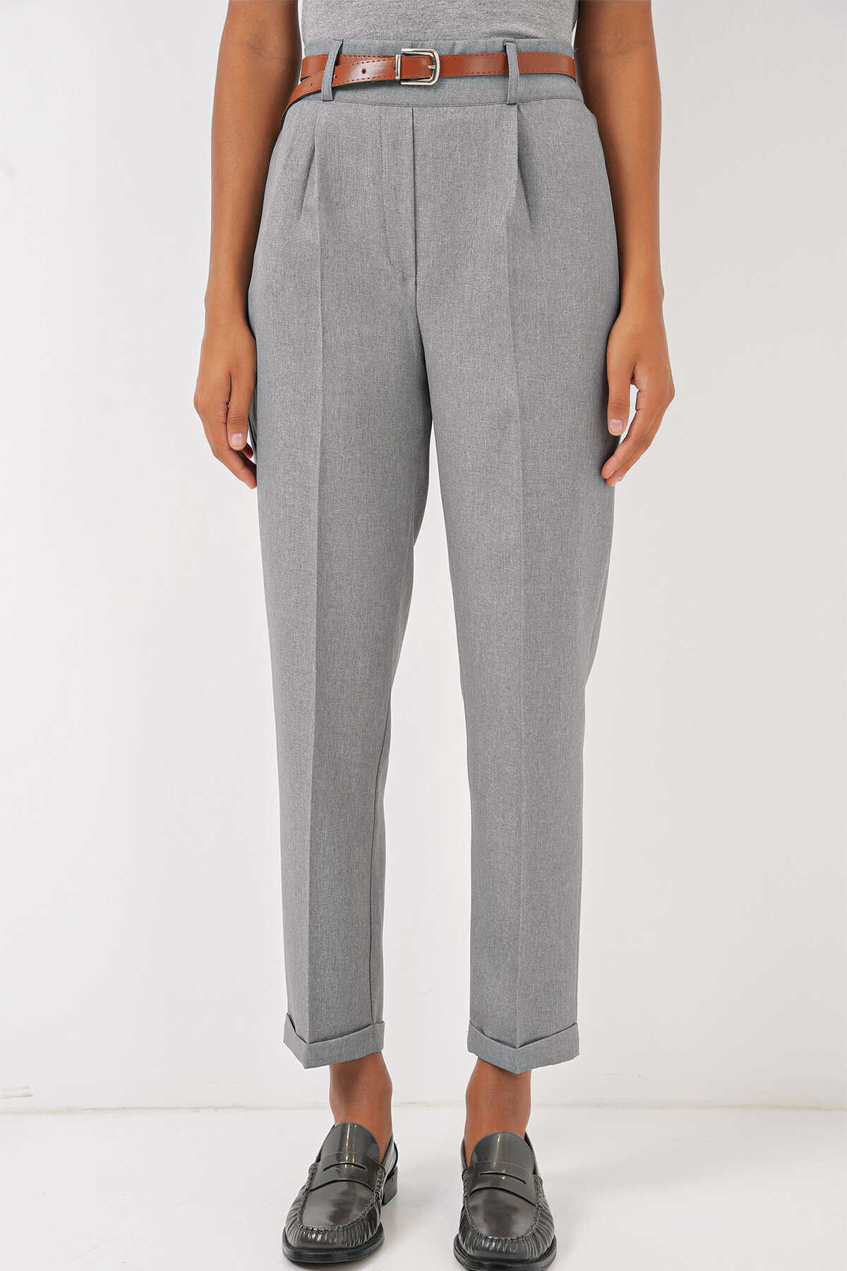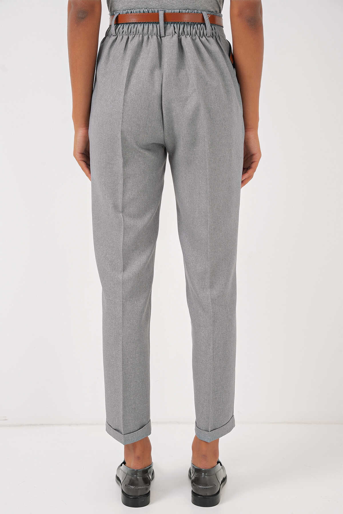 Kadin Pileli Kemerli Kumas Pantolon