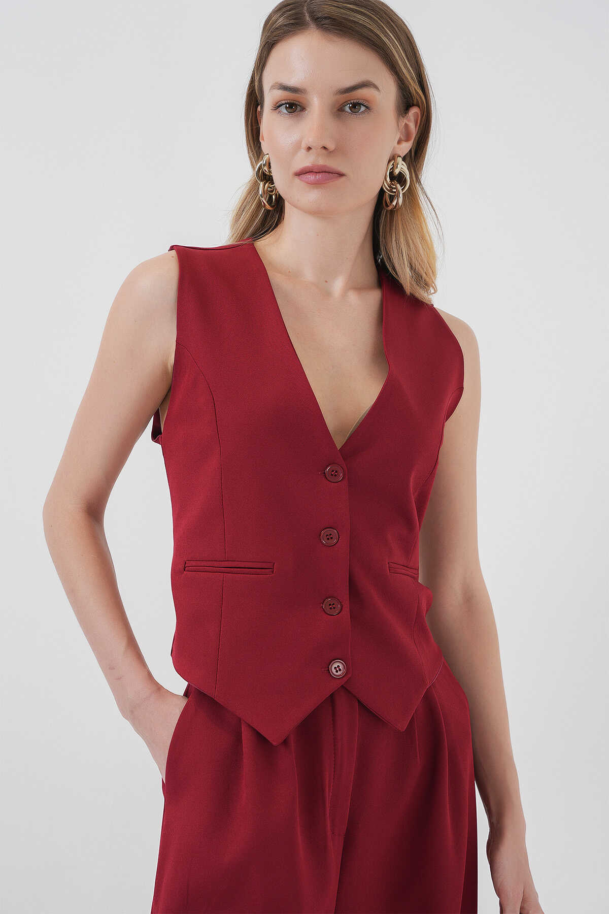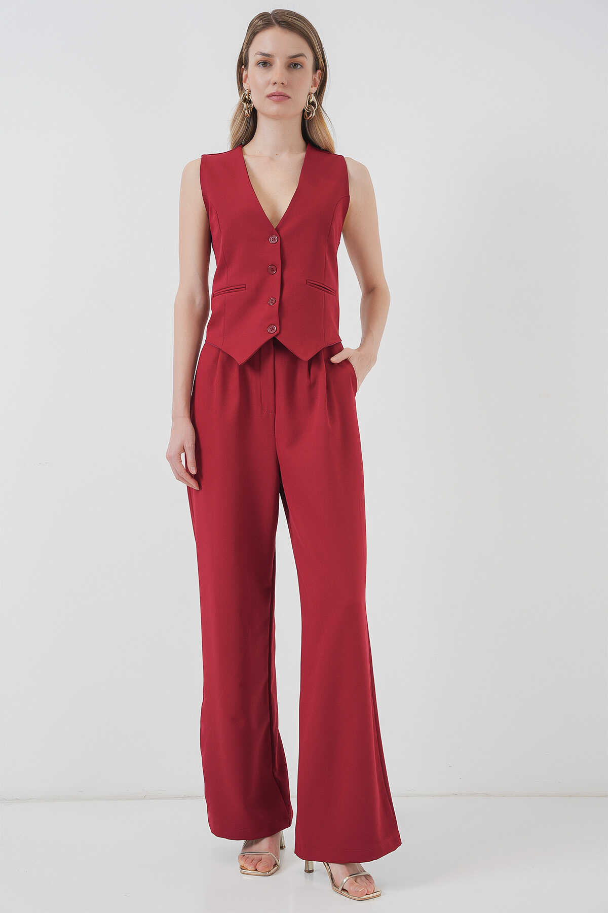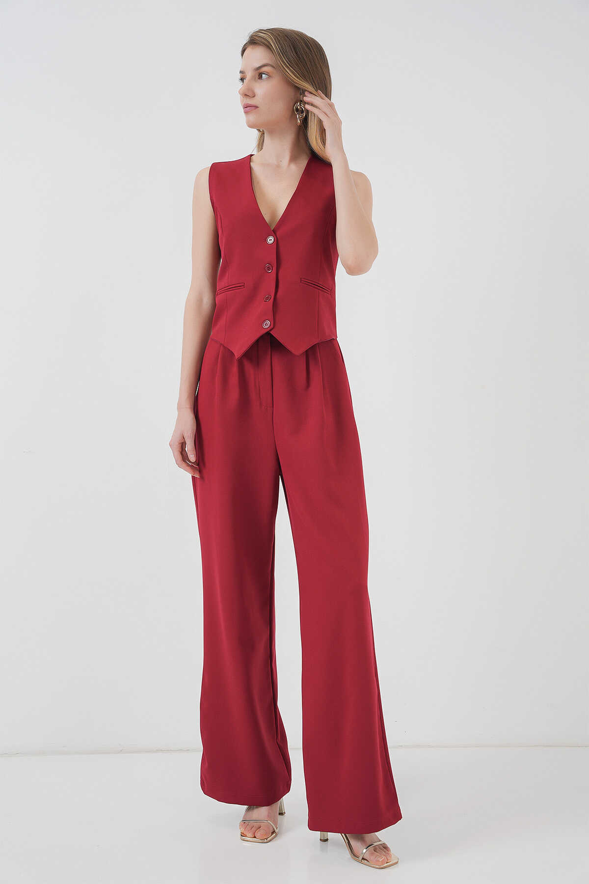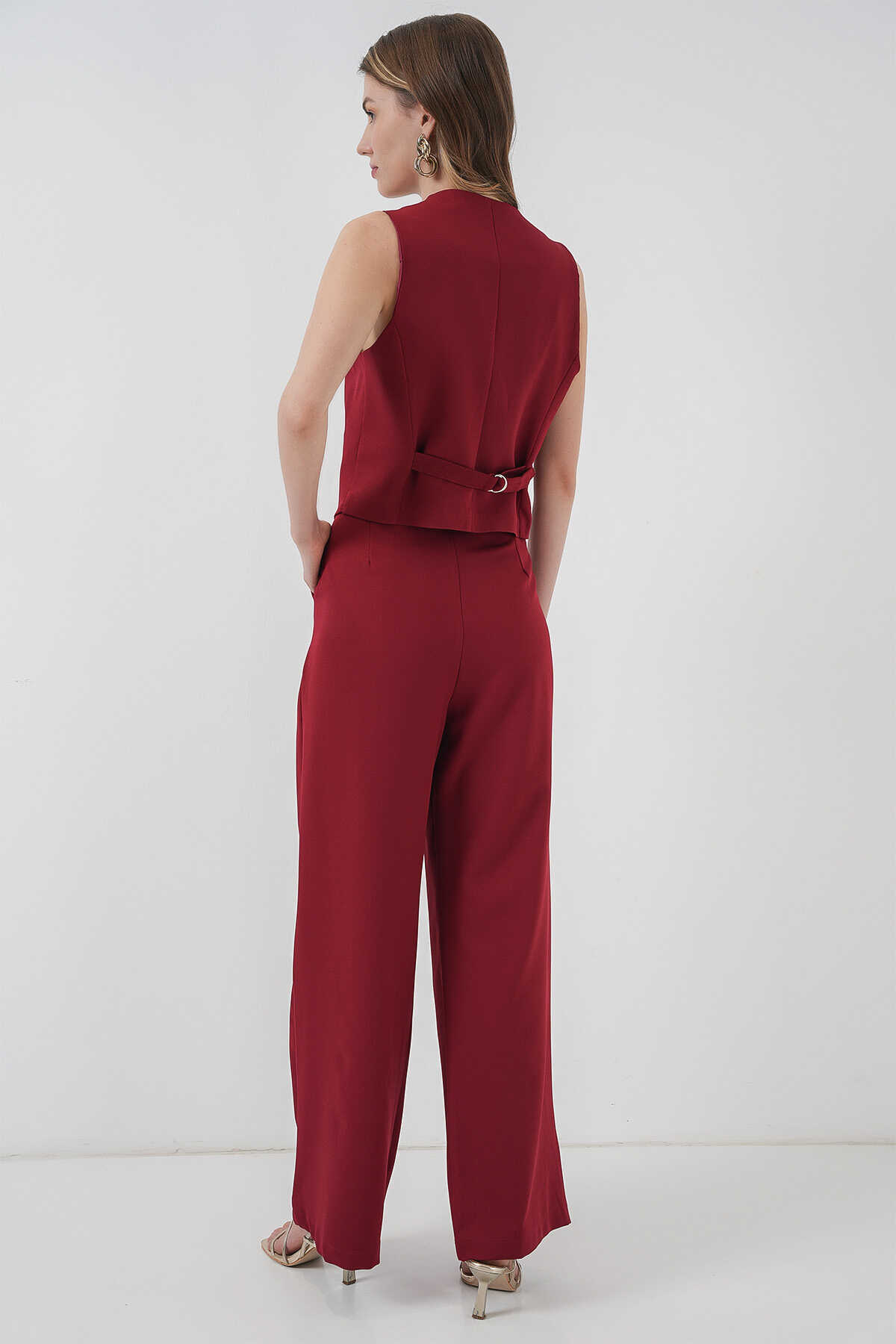 6709 Kadın Yelek Pantolon İkili Takım - Bordo - Kombin