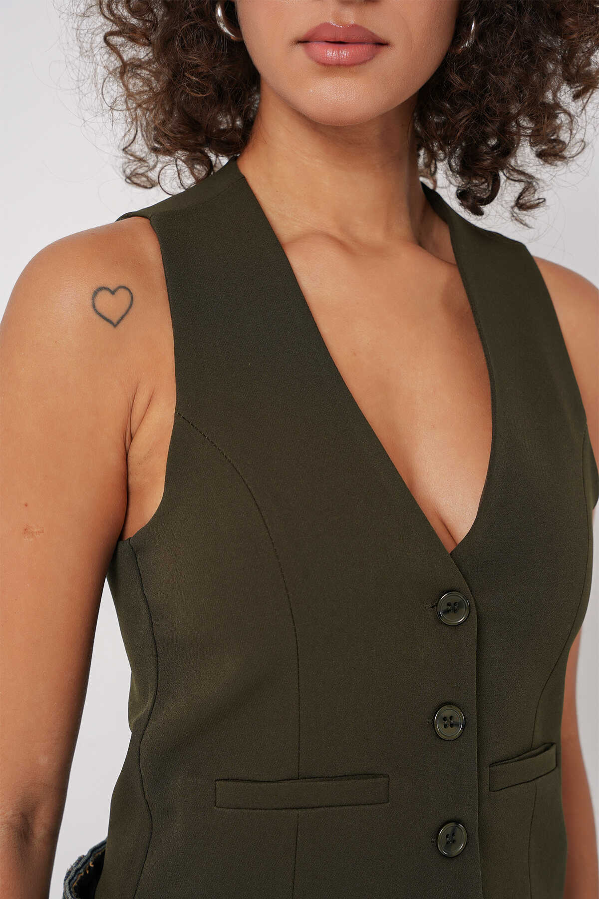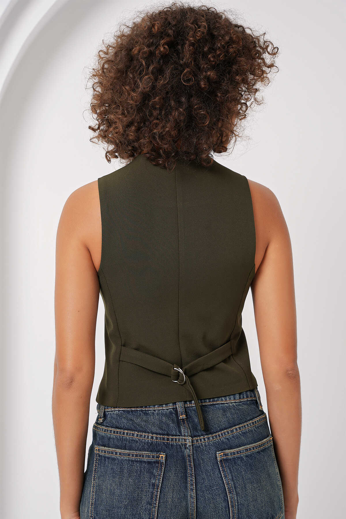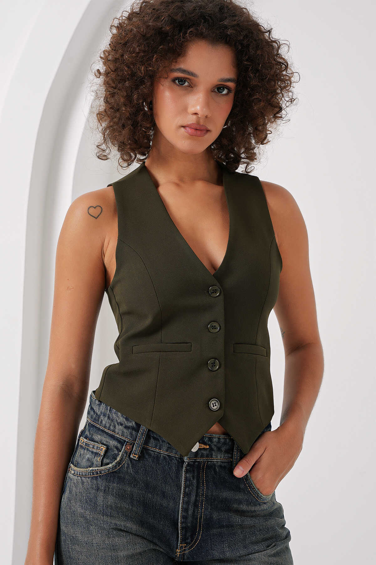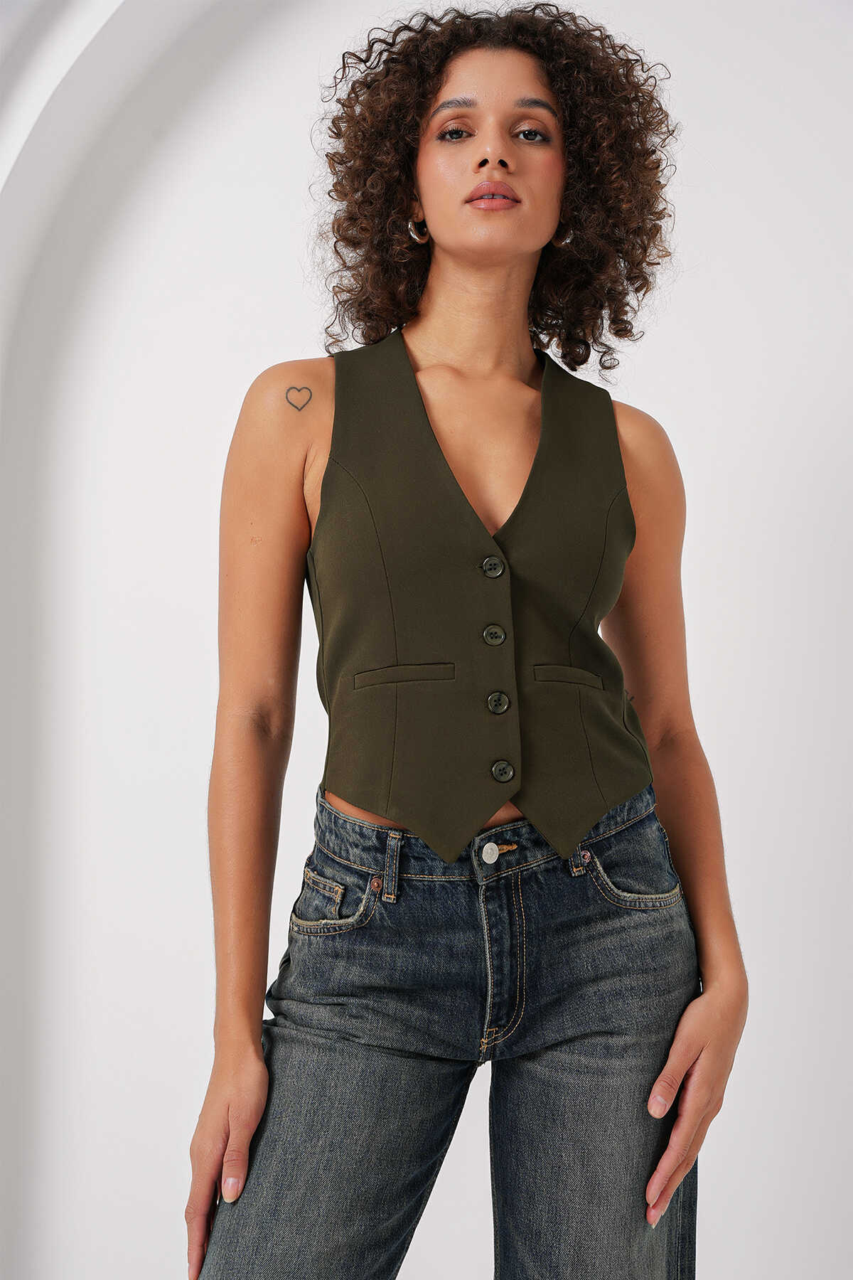 6796 Kısa Dokuma Yelek - Haki - Kombin