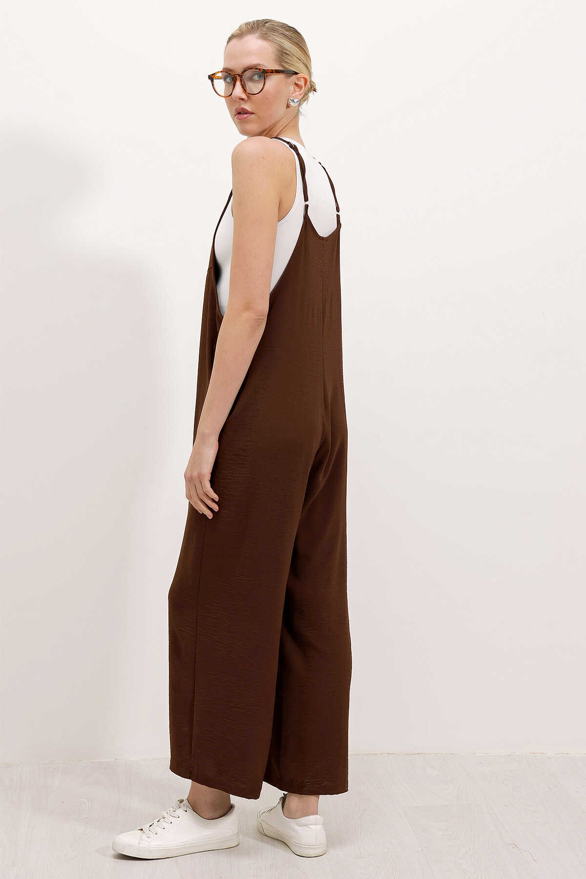 7019 Askılı Bahçivan Tulum - Kahverengi - Kombin