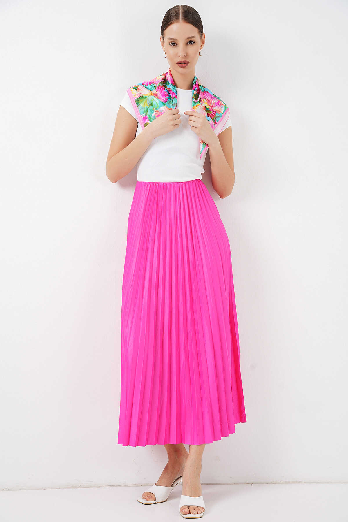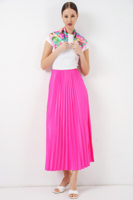 8009 Deri Görünümlü Piliseli Etek - Fuşya - Kombin