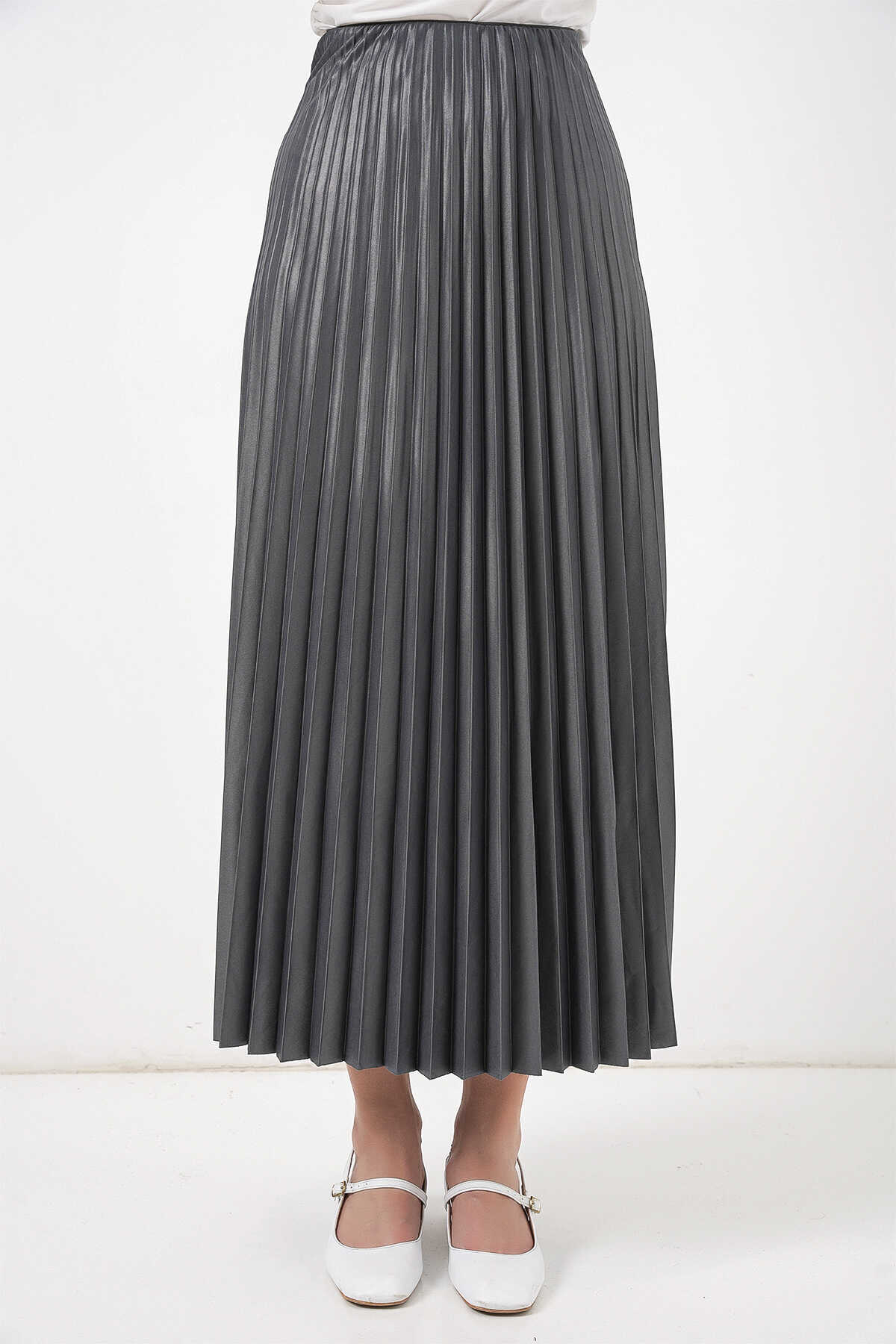 8009 Deri Görünümlü Piliseli Etek - Gri