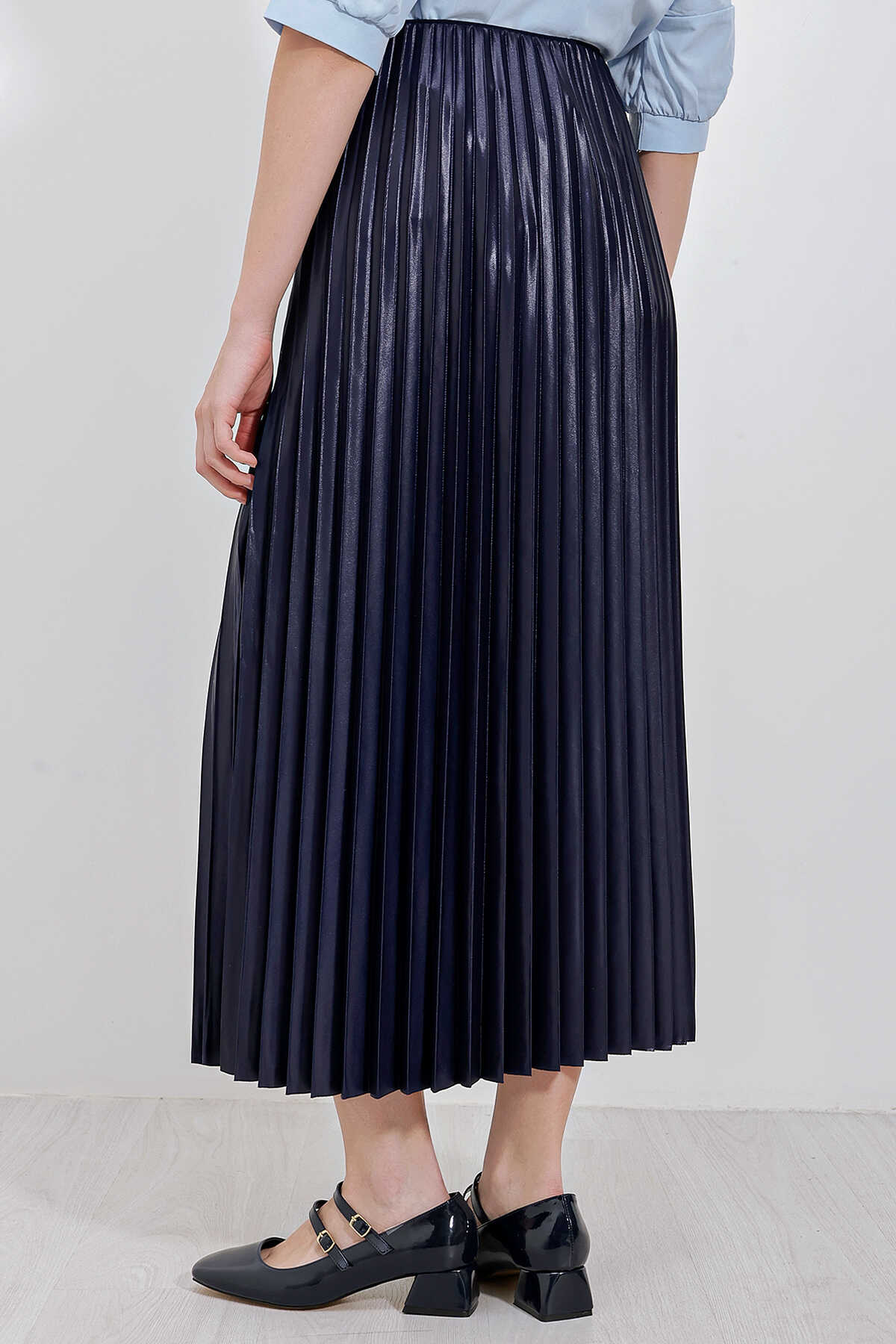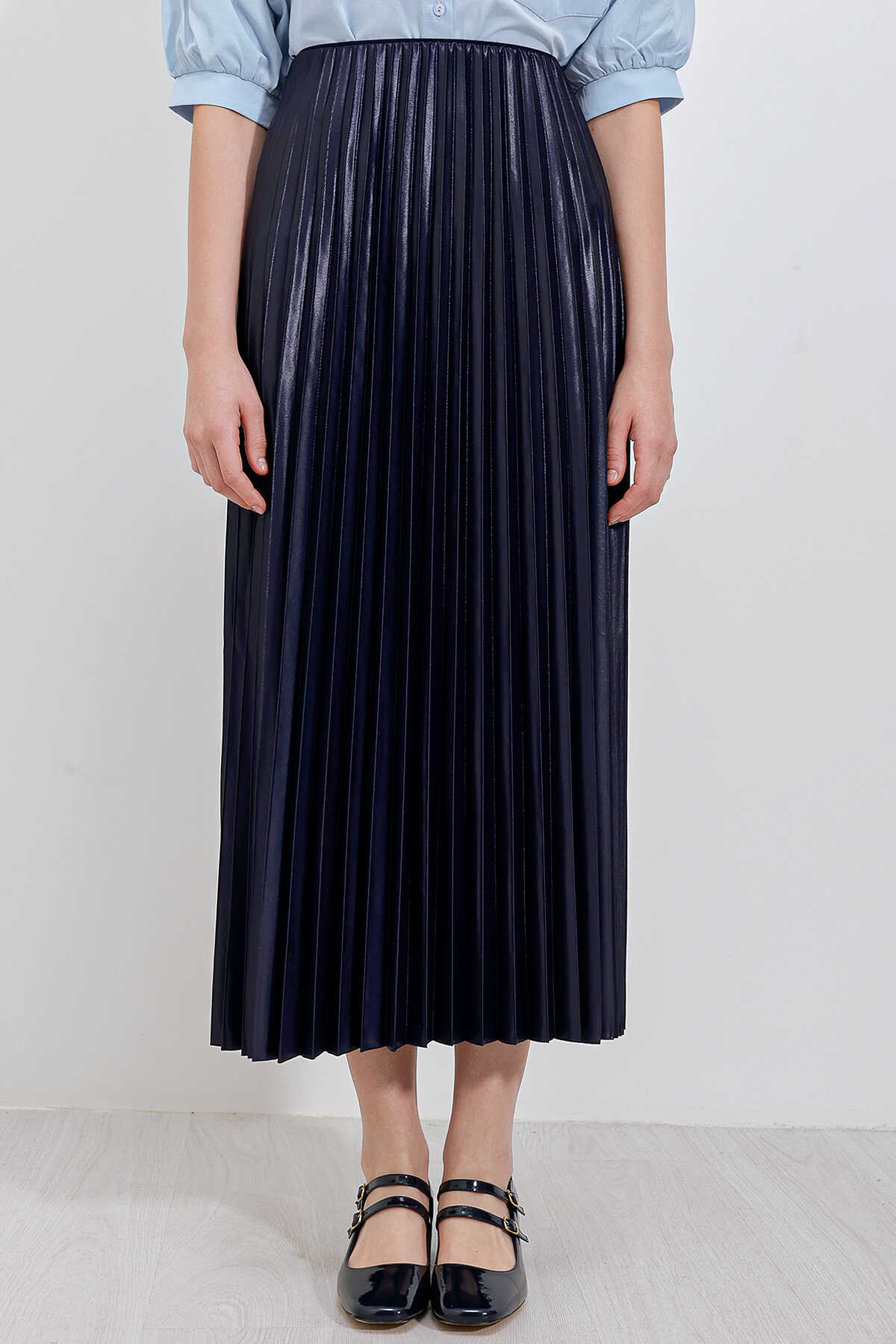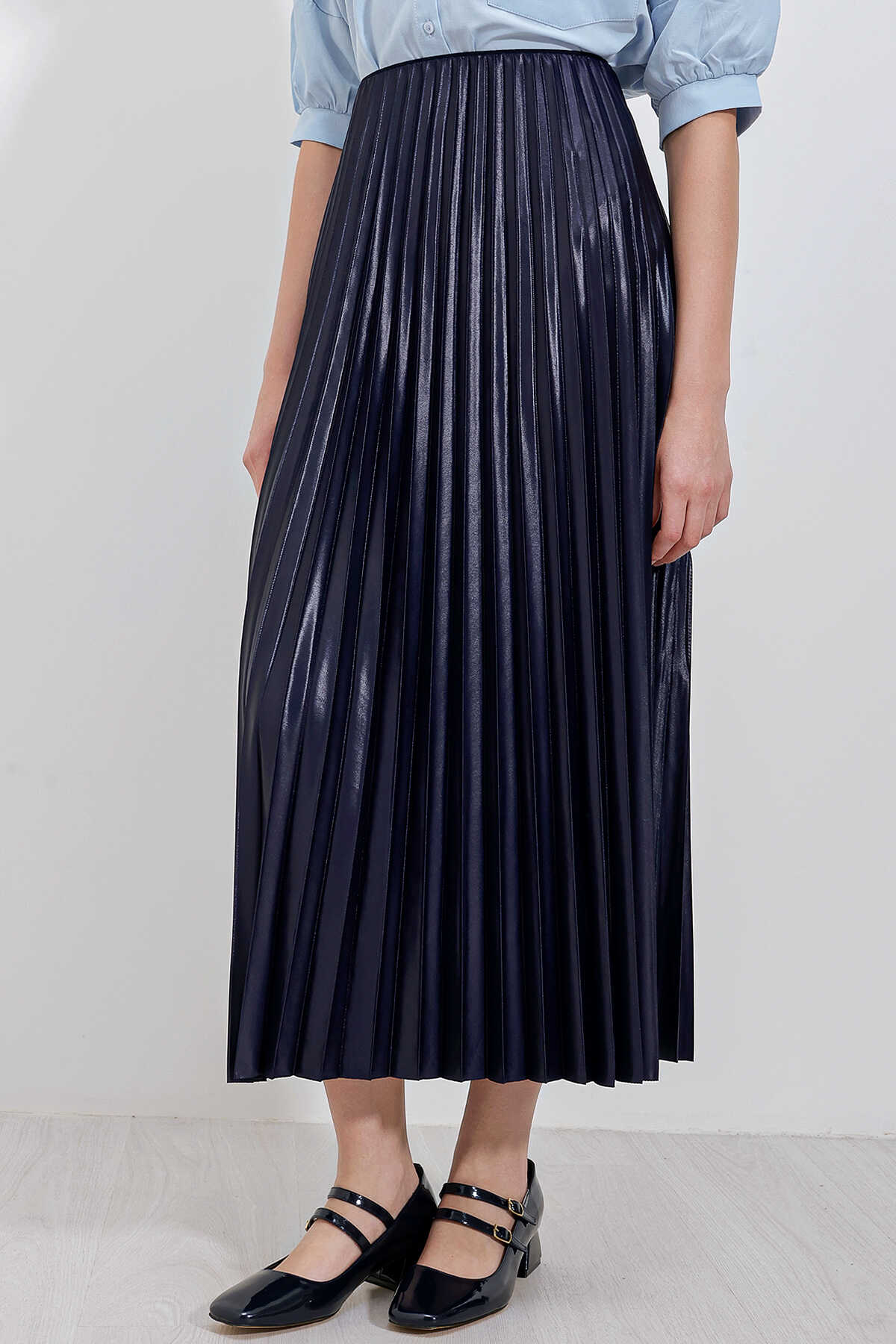 8009 Deri Görünümlü Piliseli Etek - Lacivert