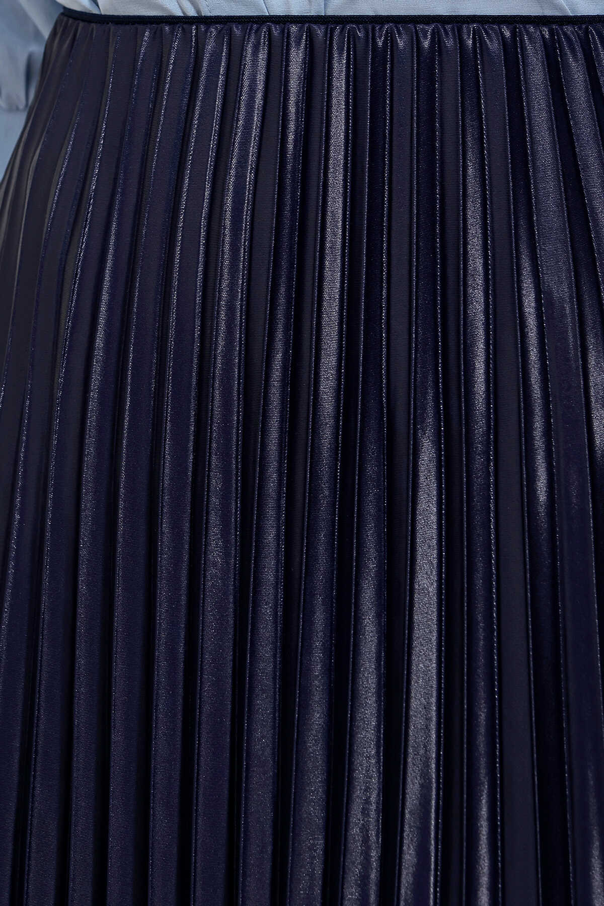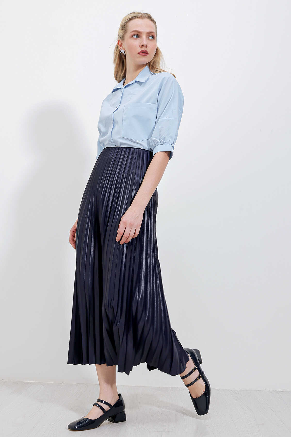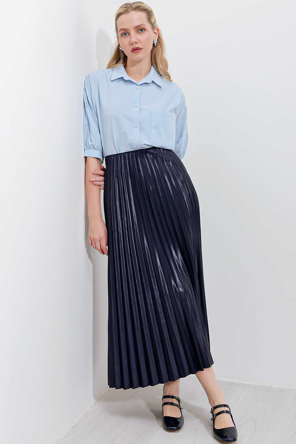 8009 Deri Görünümlü Piliseli Etek - Lacivert