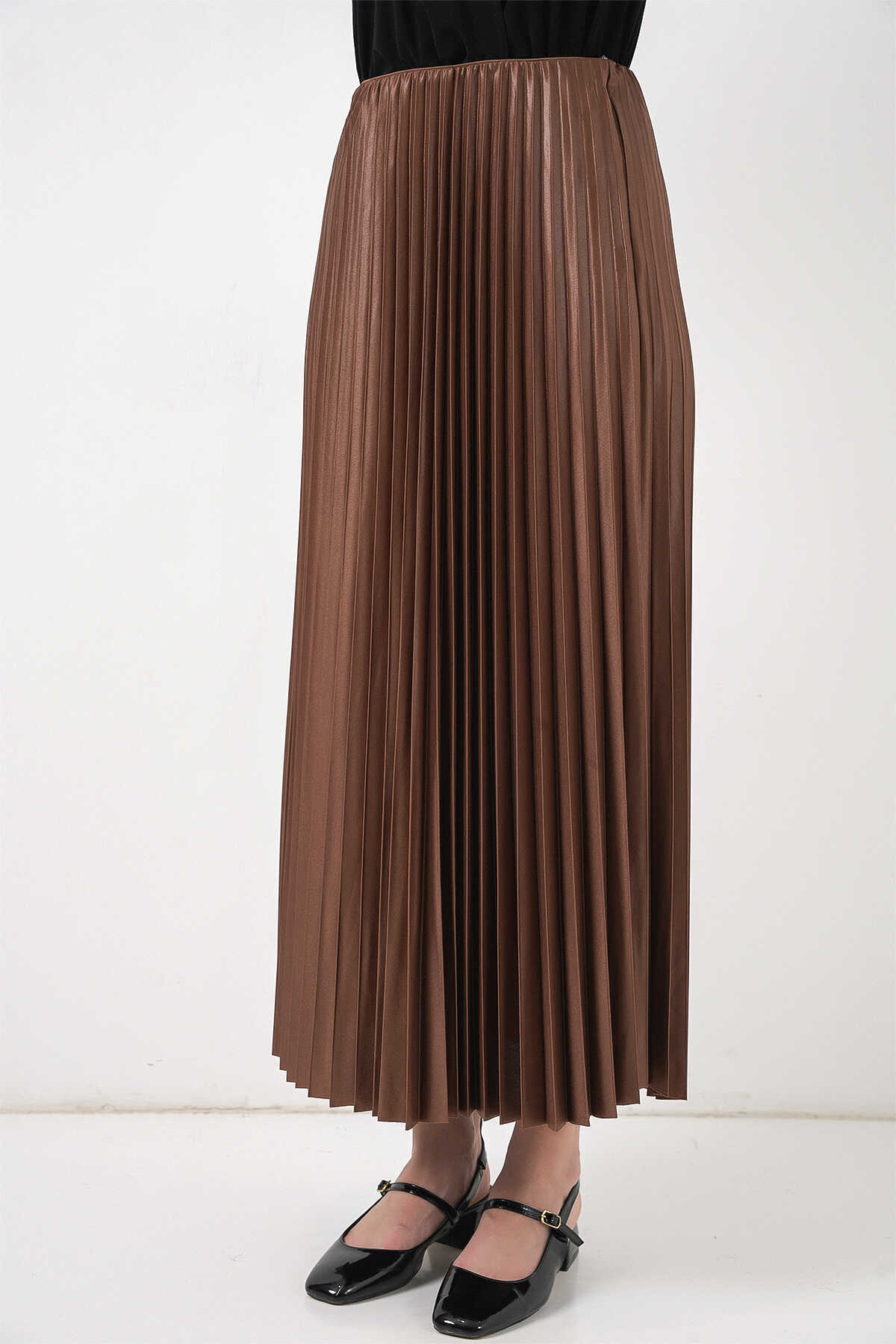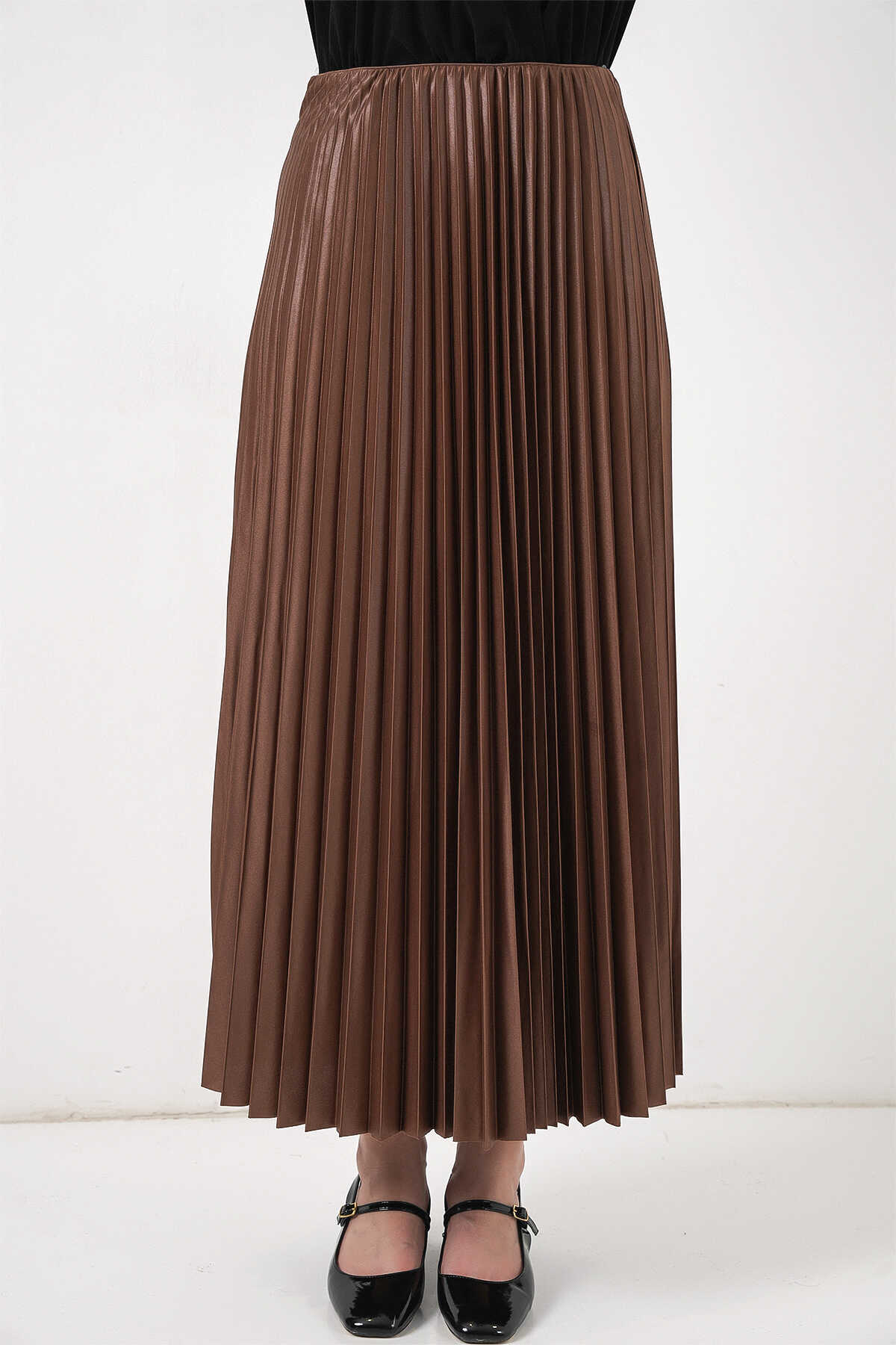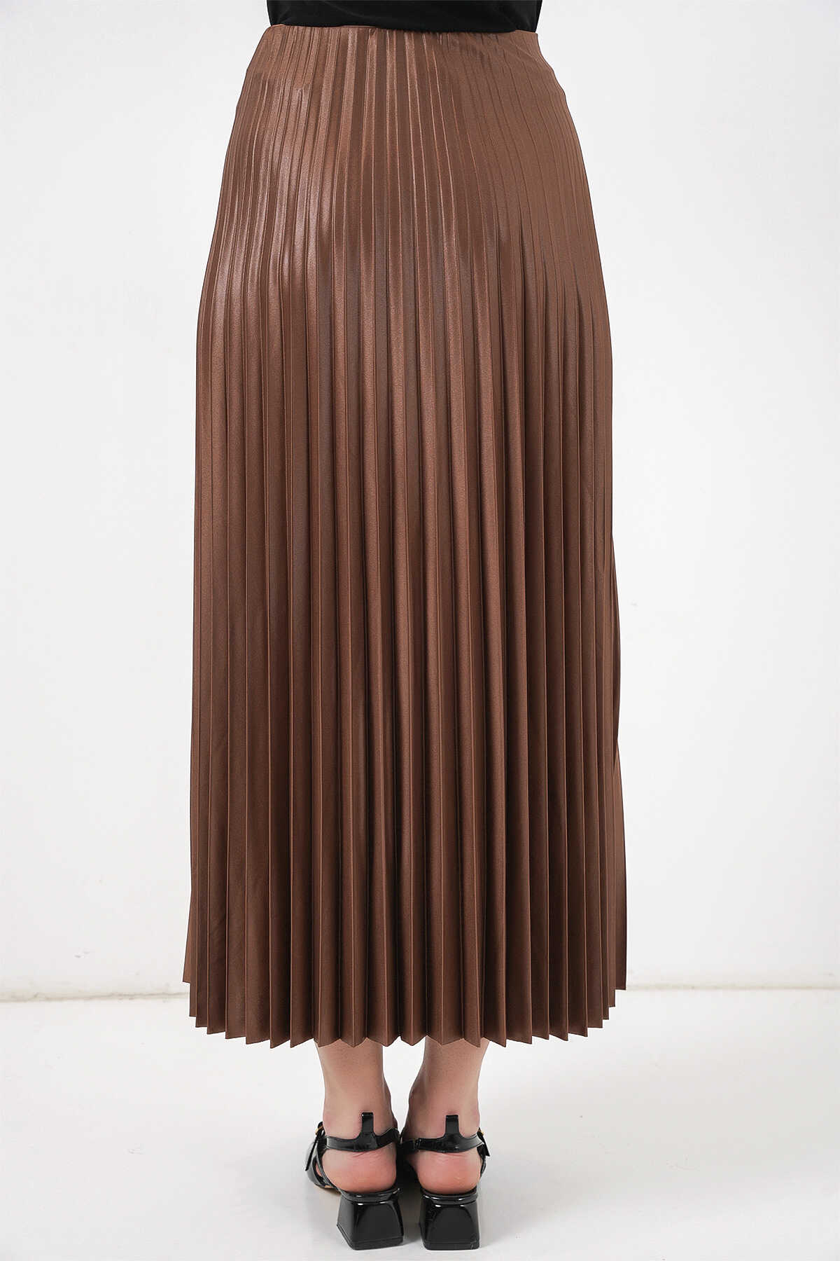 8009 Deri Görünümlü Piliseli Etek - Taba