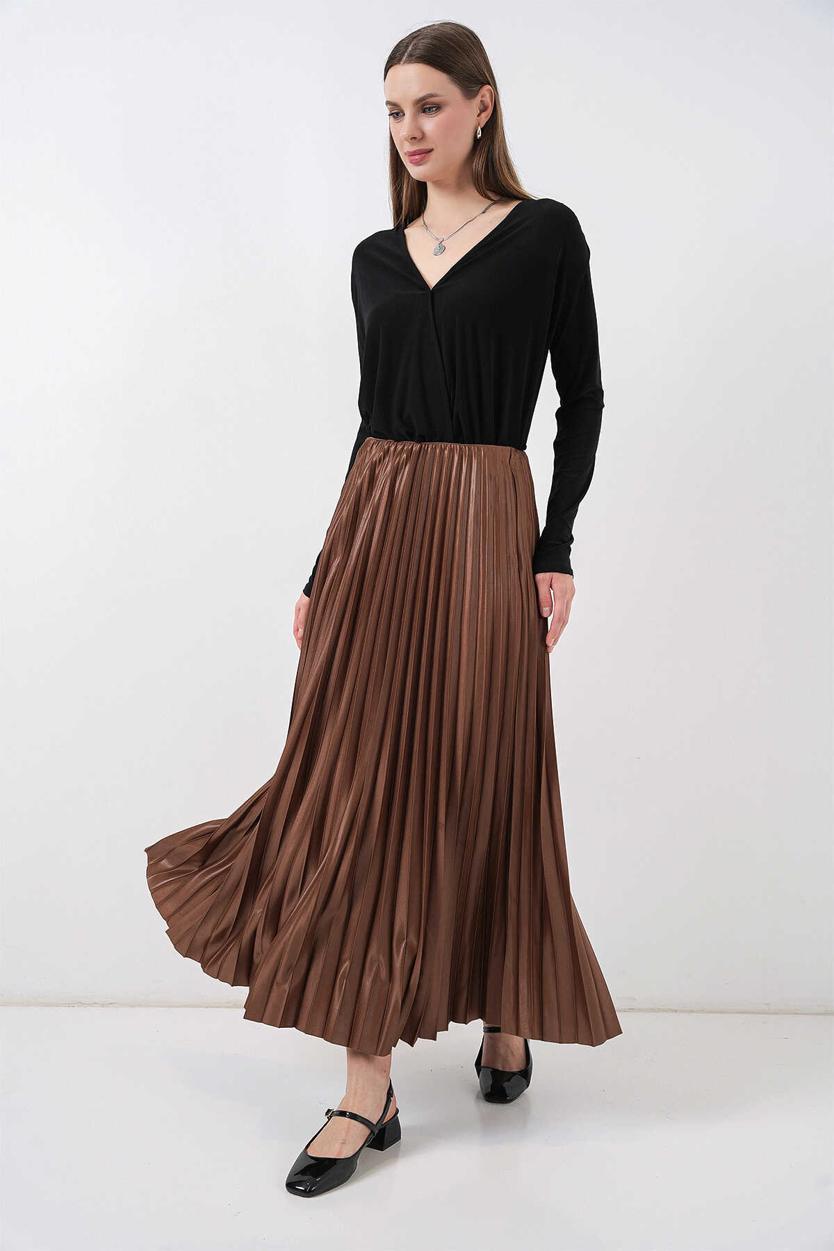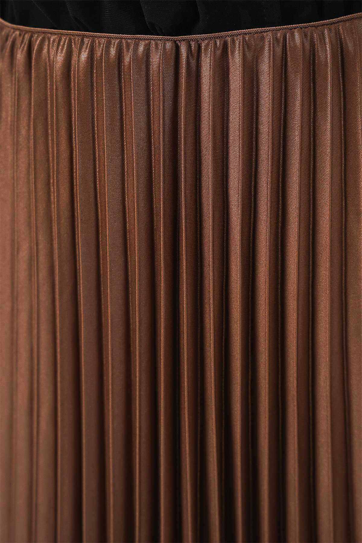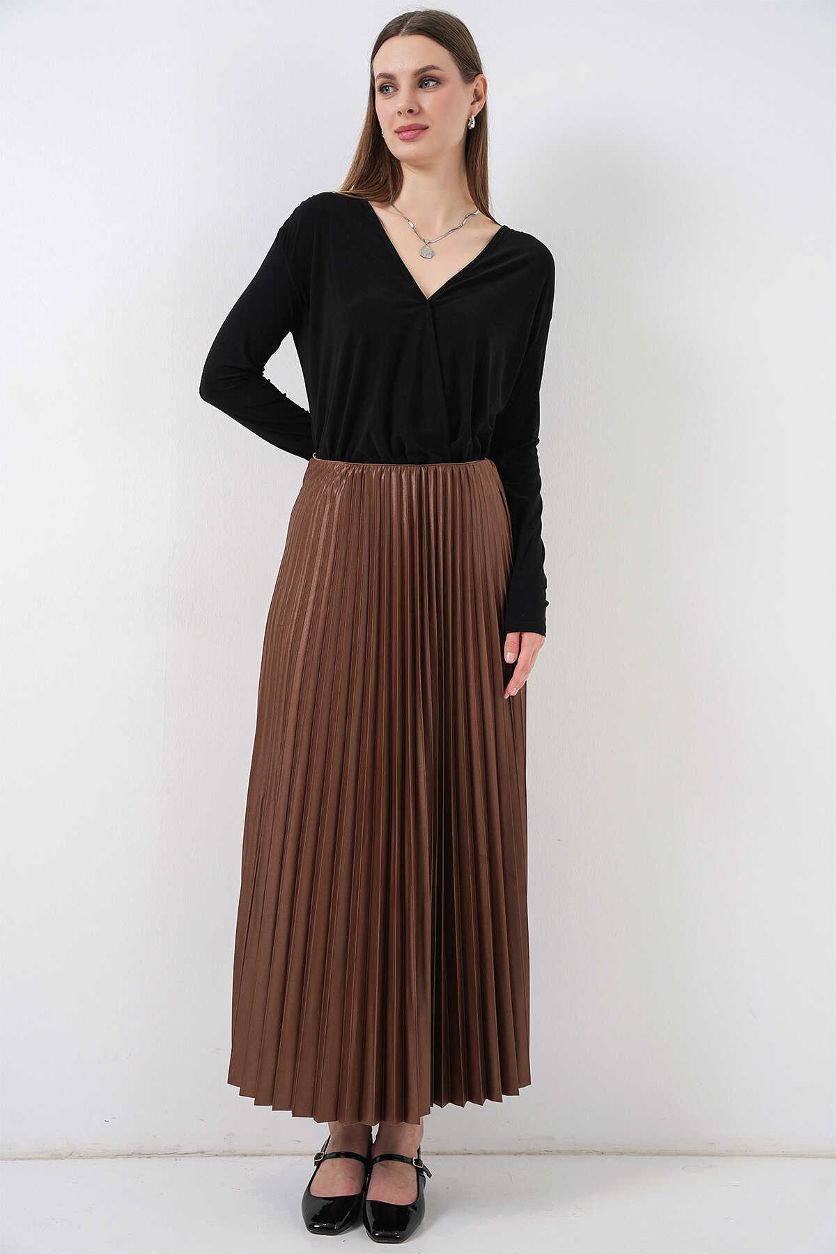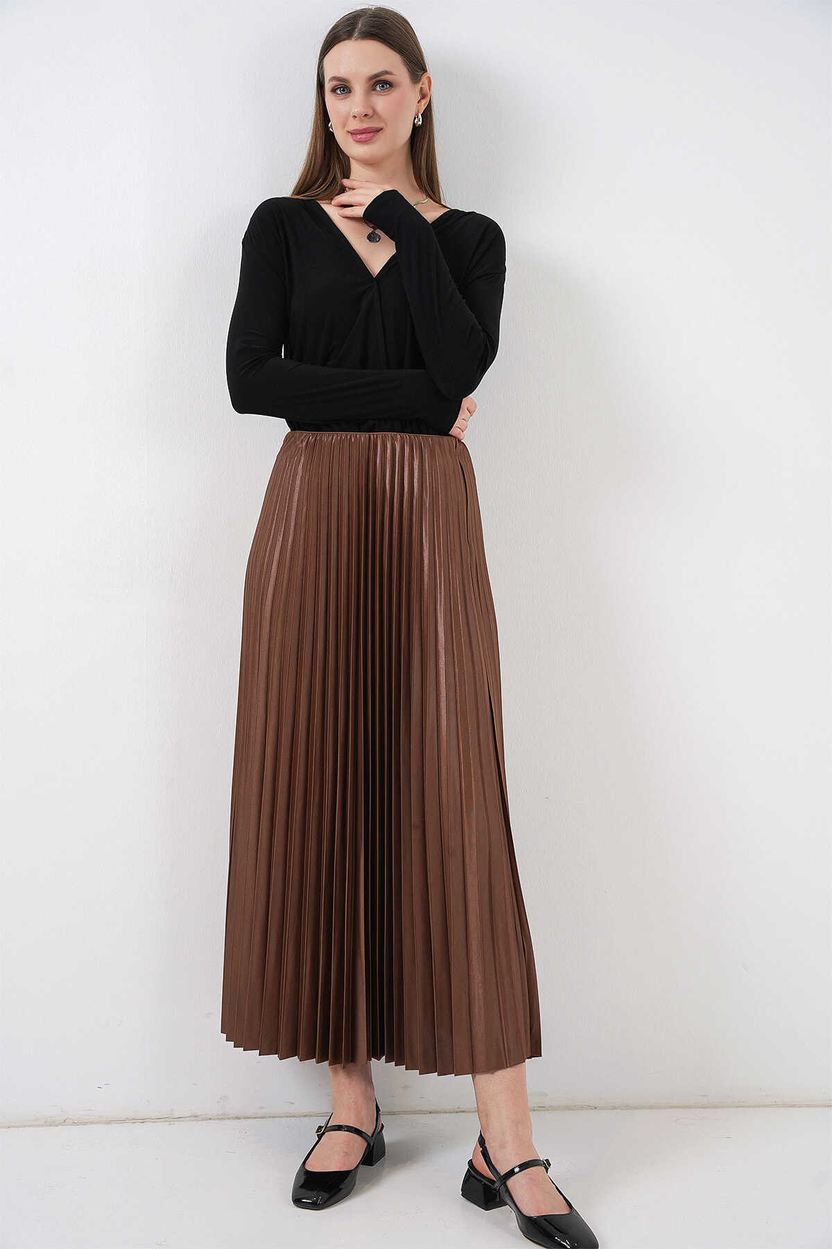 8009 Deri Görünümlü Piliseli Etek - Taba