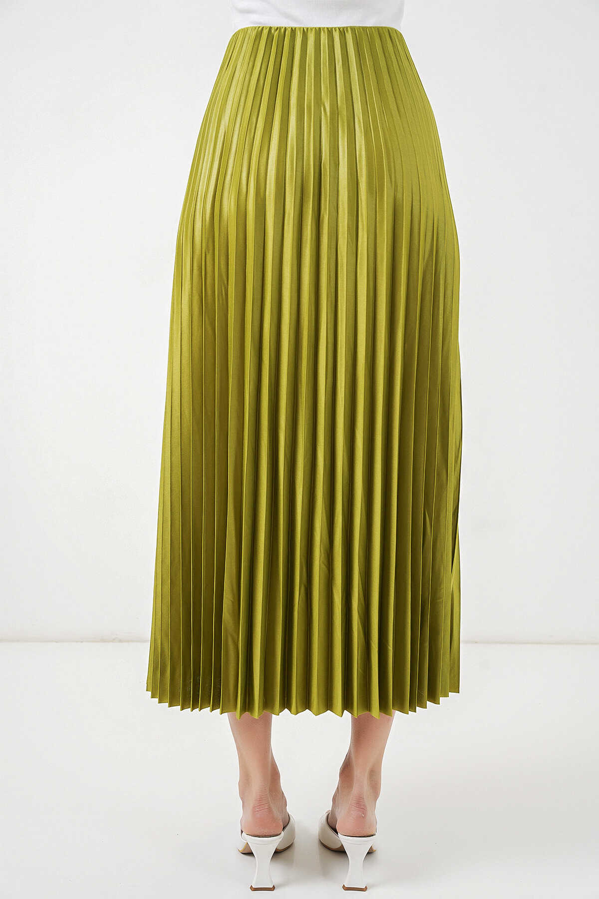 8009 Deri Görünümlü Piliseli Etek - Yağ Yeşil