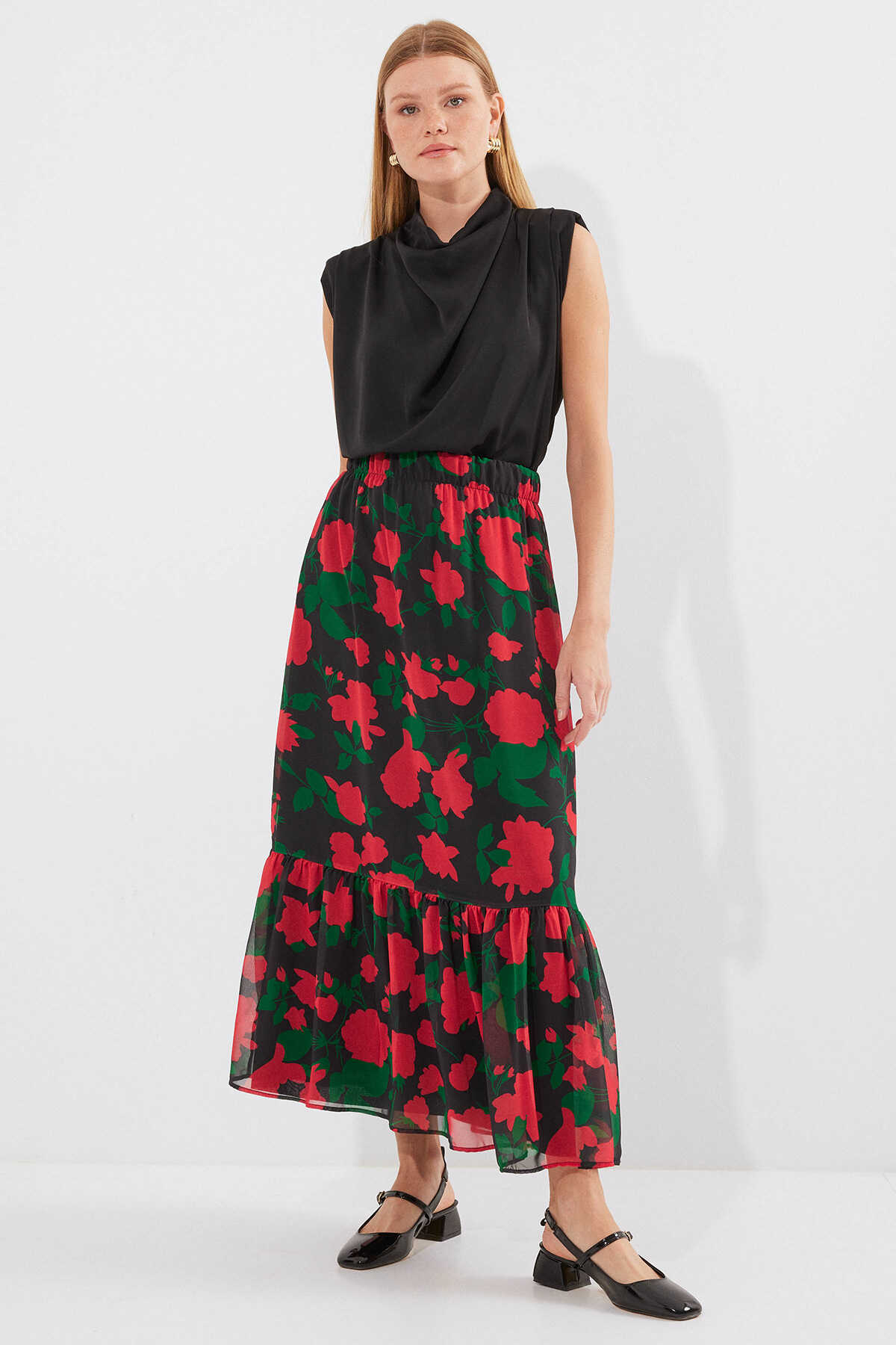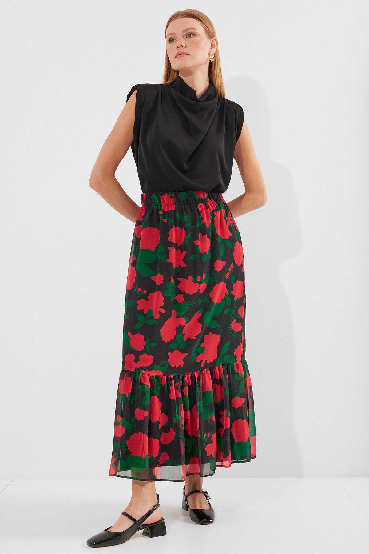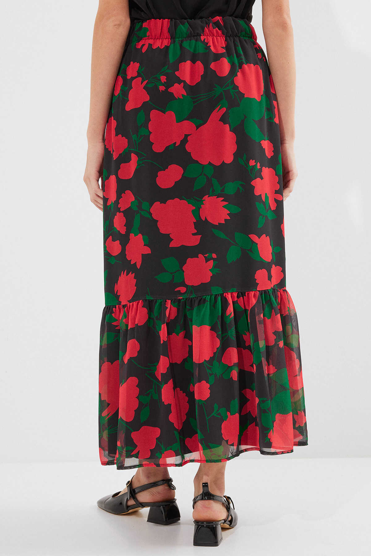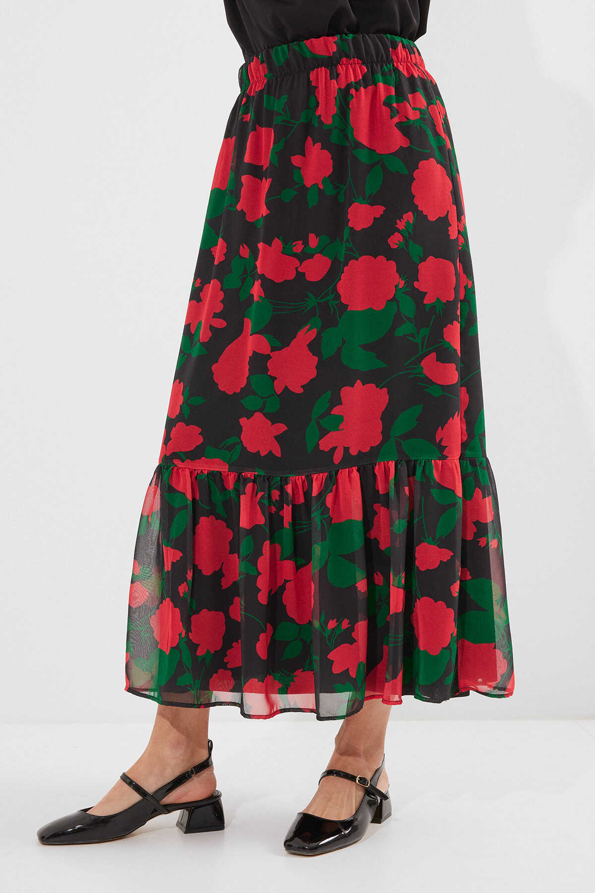 8010 Desenli Şifon Etek - F. Siyah - Kombin