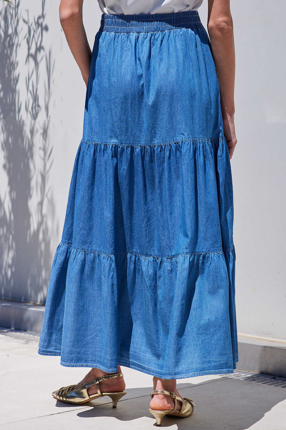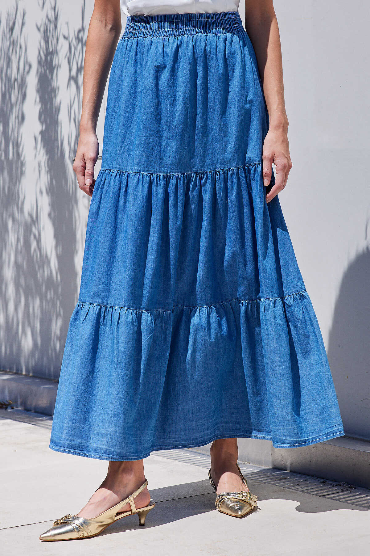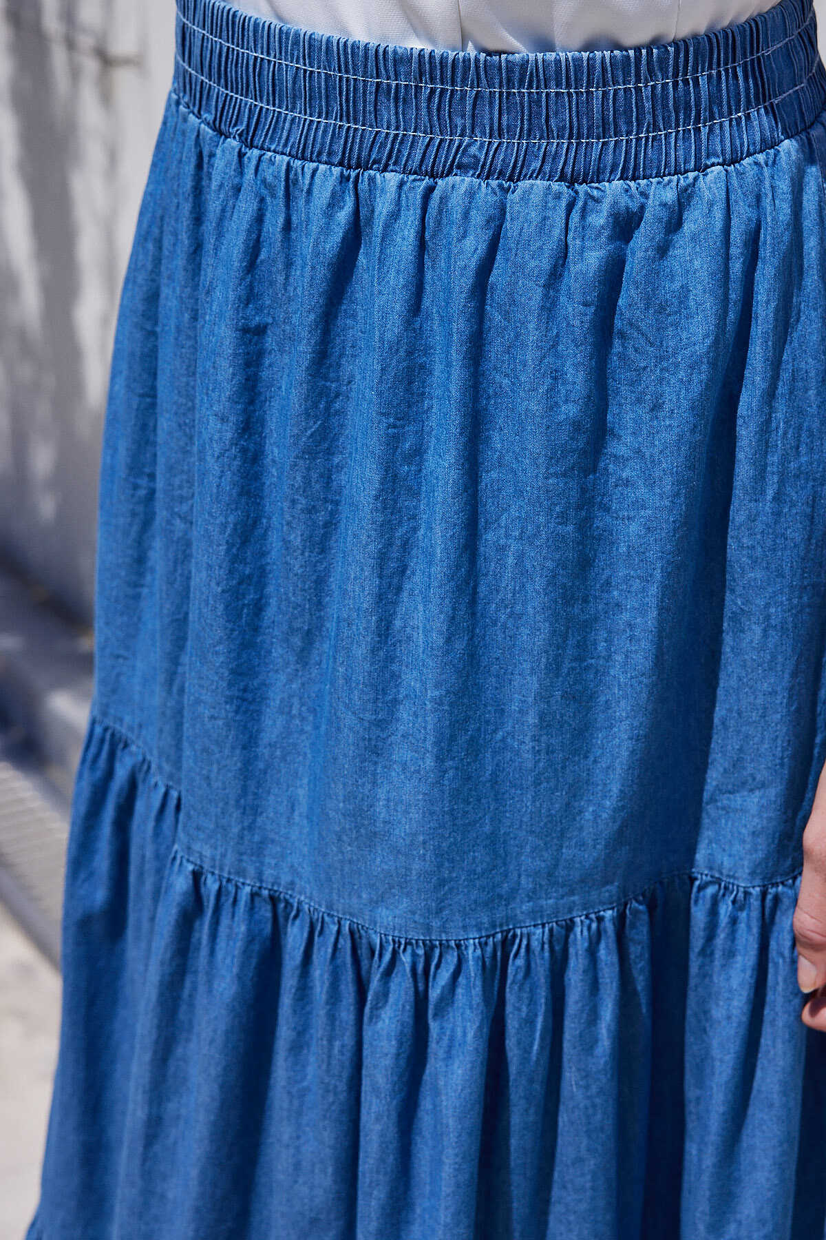 8022 Volanlı Uzun Kot Etek - Lacivert - Kombin