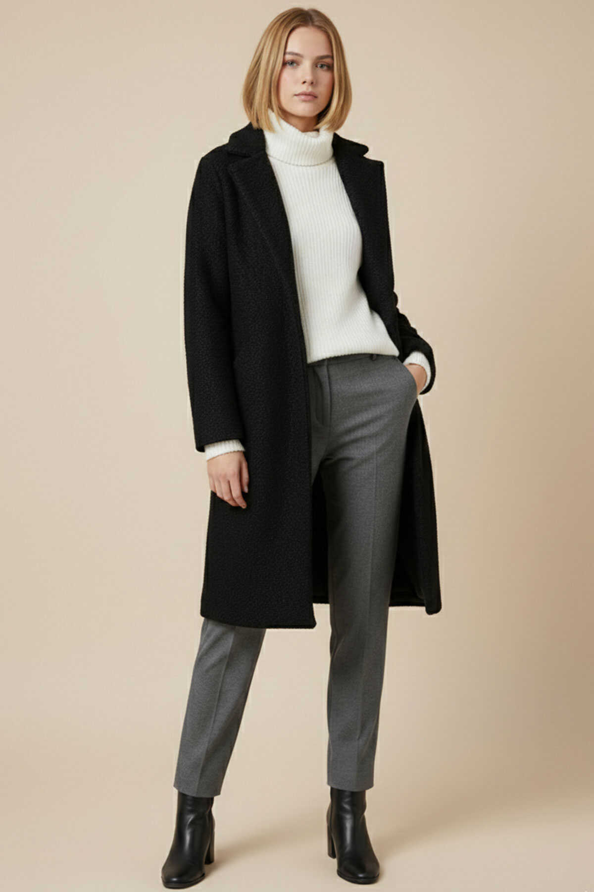 9085 Kadın Oversize Kaşe Kaban - D. Siyah - Kombin
